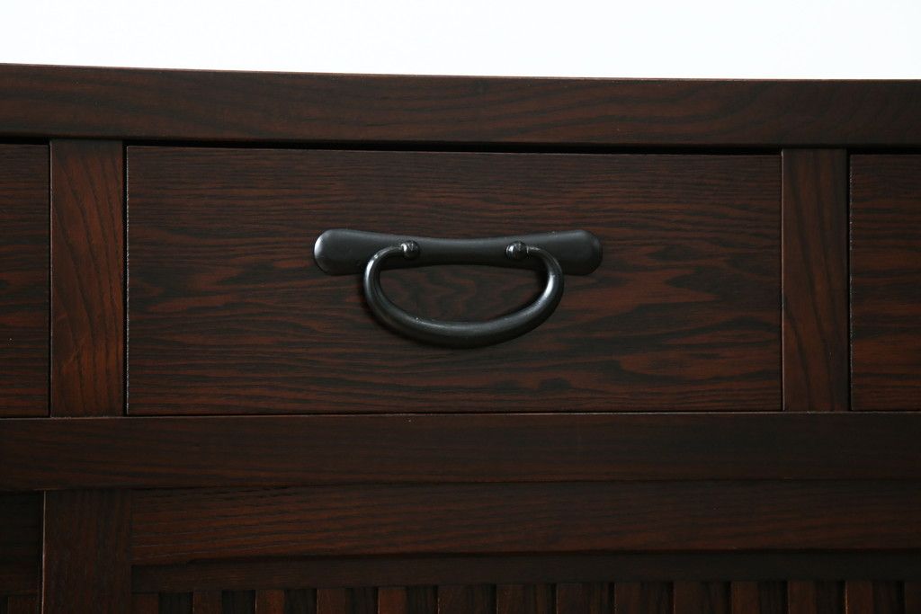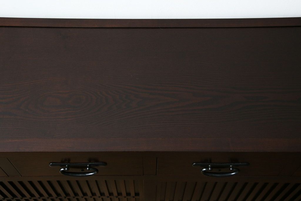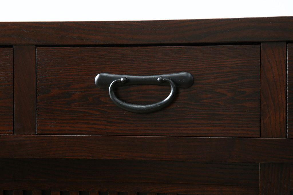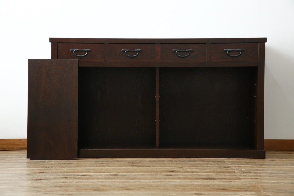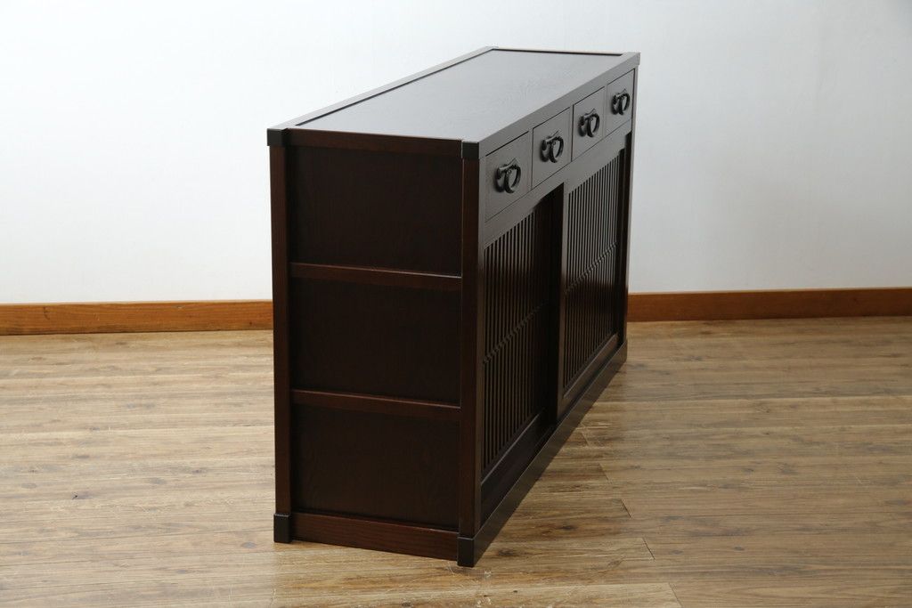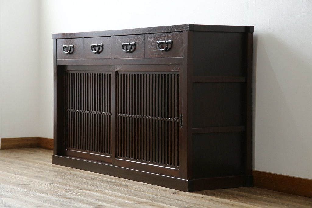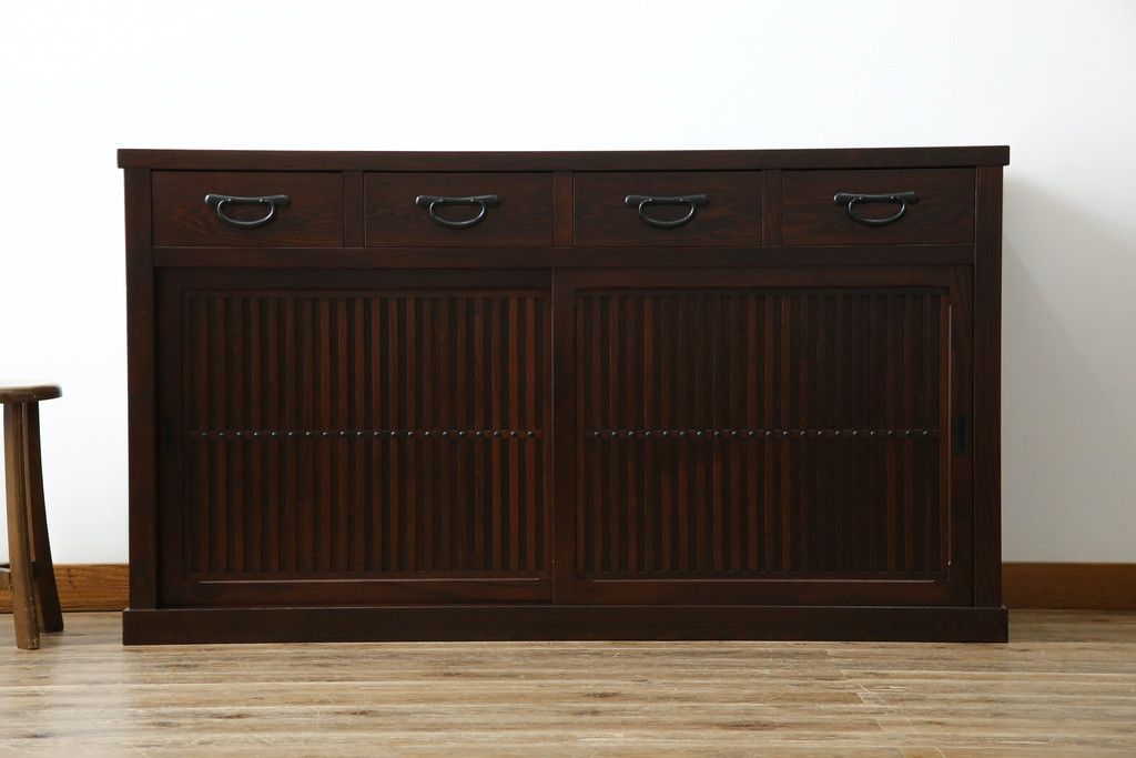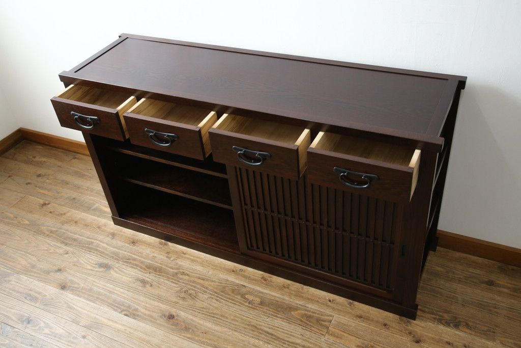 民芸家具 > 中古 美品!! 三面栗(クリ)材 引き出し4杯付き 落ち着いたデザインの水屋箪笥サイドボード(リビングボード、サイドキャビネット、食器棚、カップボード、収納棚、戸棚)(R-083113)