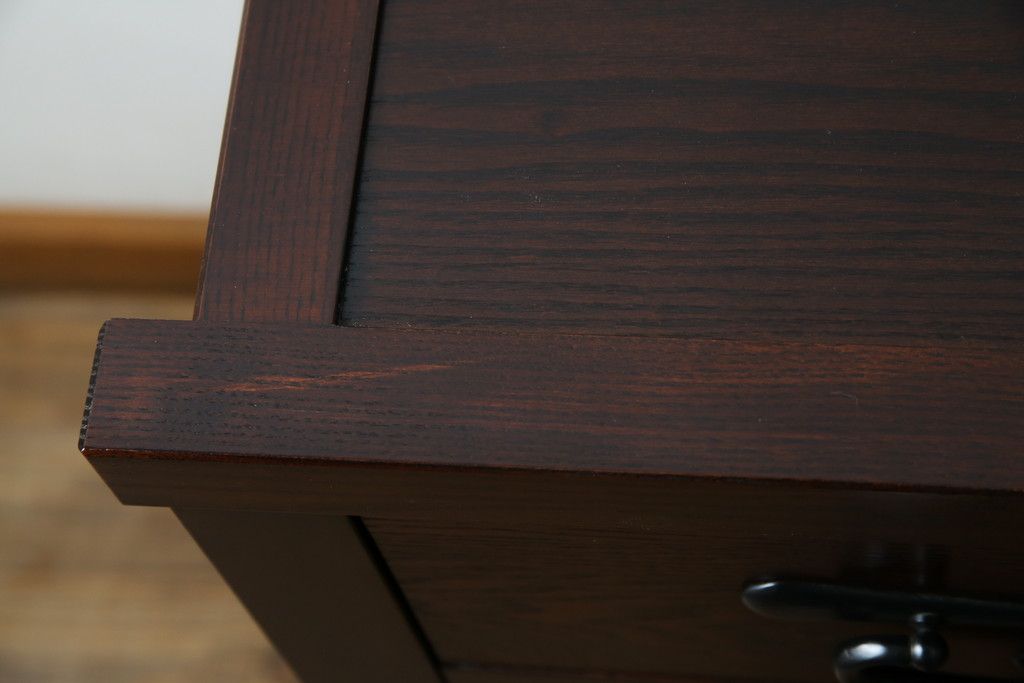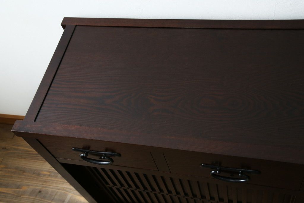 中古 美品!! 三面栗(クリ)材 引き出し4杯付き 落ち着いたデザインの水屋箪笥サイドボード(リビングボード、サイドキャビネット、食器棚、カップボード、収納棚、戸棚)(R-083113)