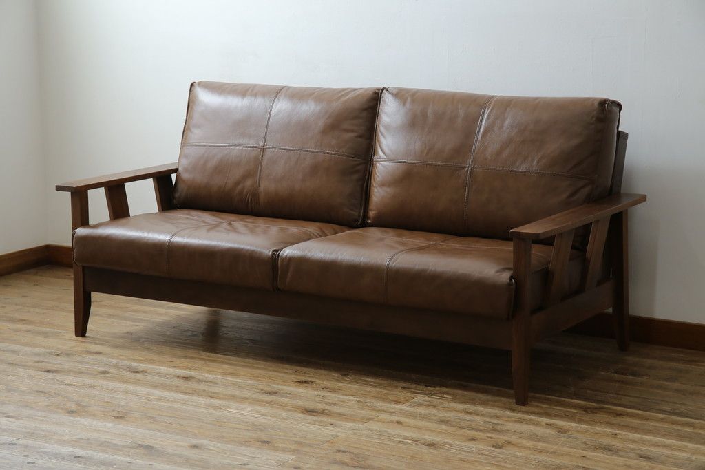 中古 超美品 ウォールナット材 革製(レザー) 木製フレームが美しい!!カフェ風インテリアにもぴったりな2.5人掛けソファ(2P、2.5P、3P、2人掛け、3人掛け)(定価約16万円)(R-083173)