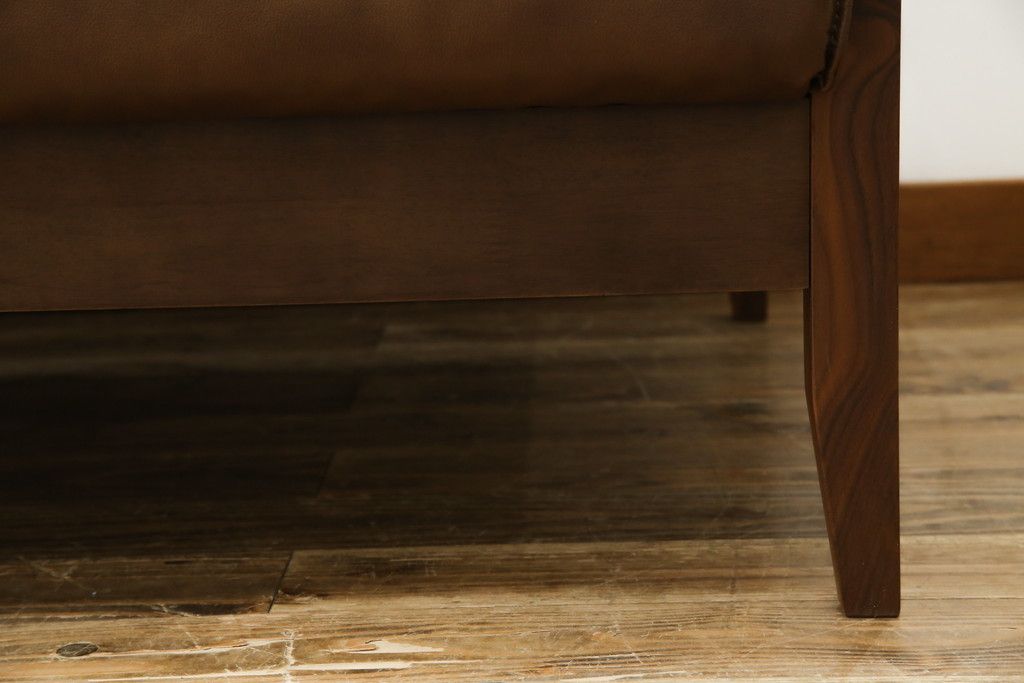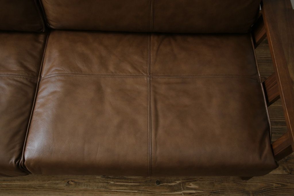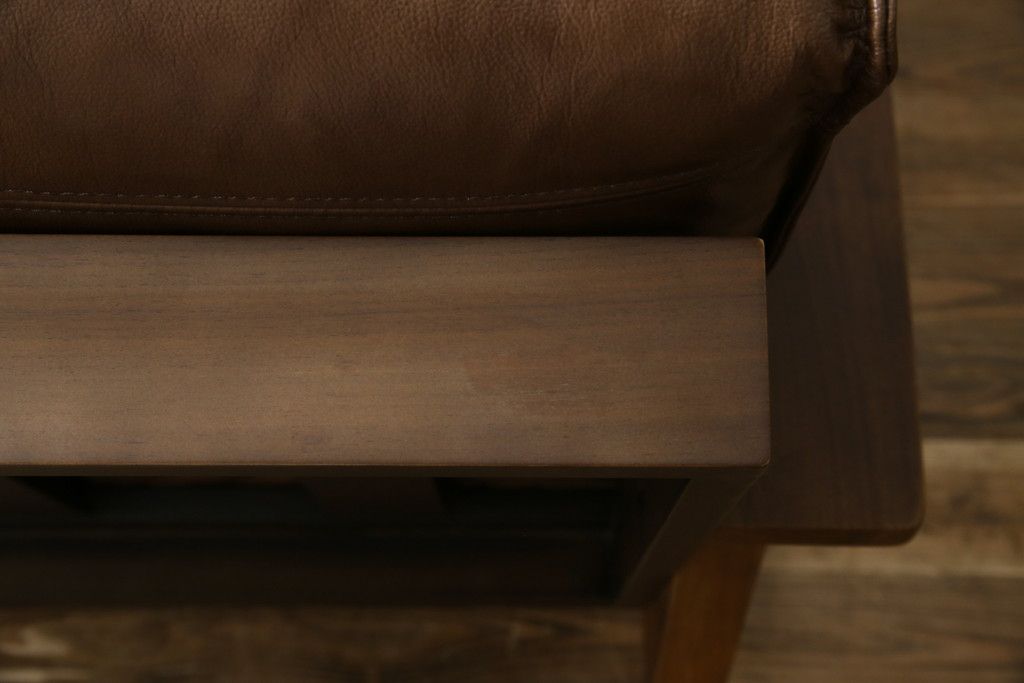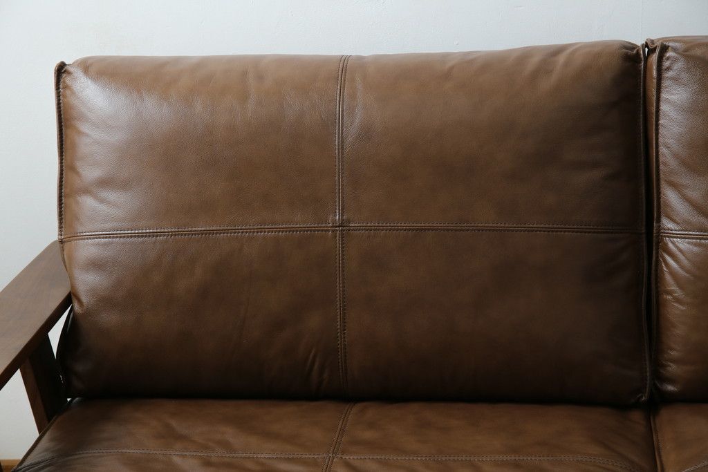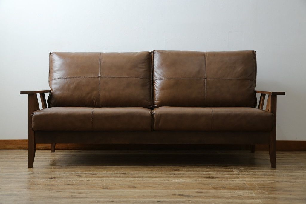 ソファ> 2人掛けソファ > 中古 超美品 ウォールナット材 革製(レザー) 木製フレームが美しい!!カフェ風インテリアにもぴったりな2.5人掛けソファ(2P、2.5P、3P、2人掛け、3人掛け)(定価約16万円)(R-083173)