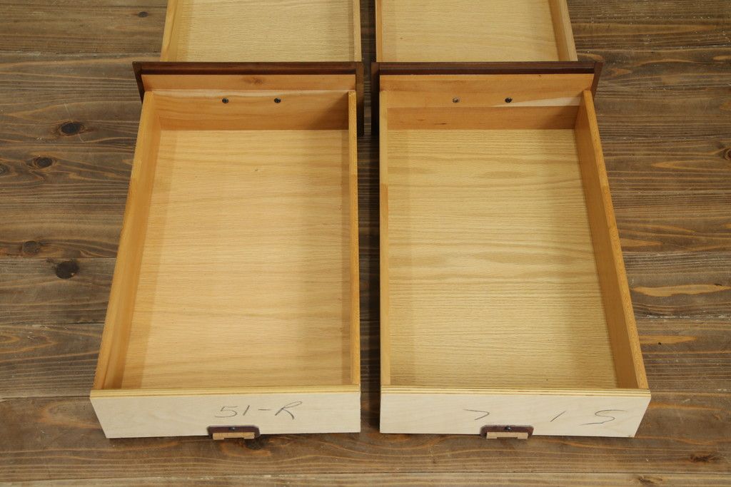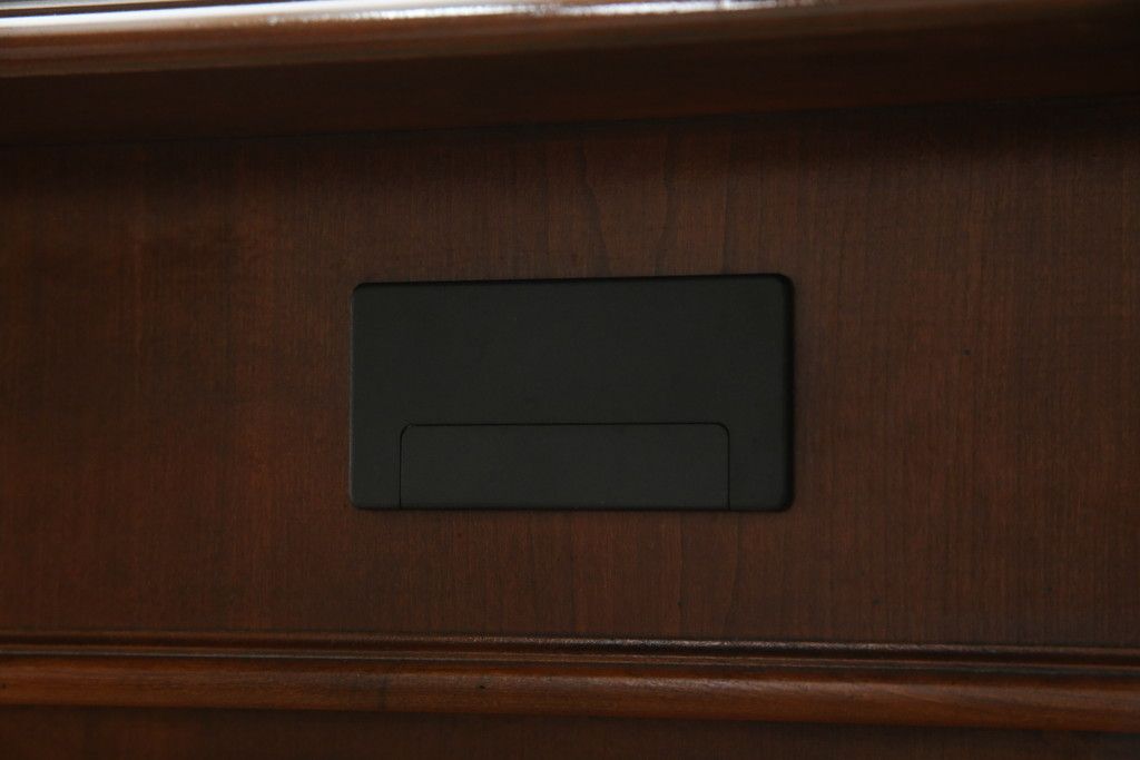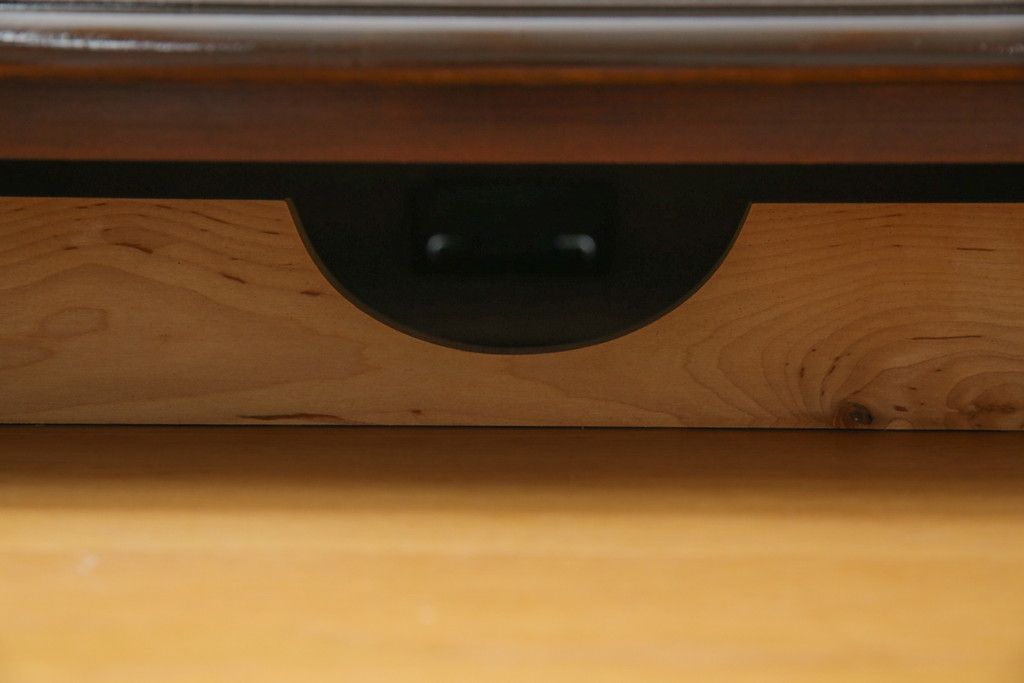 15、39、40枚目の画像にありますように、中央の引き出しはキーボード等が置けるように前板が手前に倒れる仕様になっています。また、引き出し奥に配線穴も開いています。