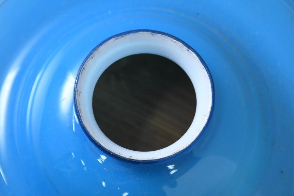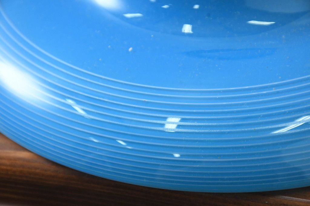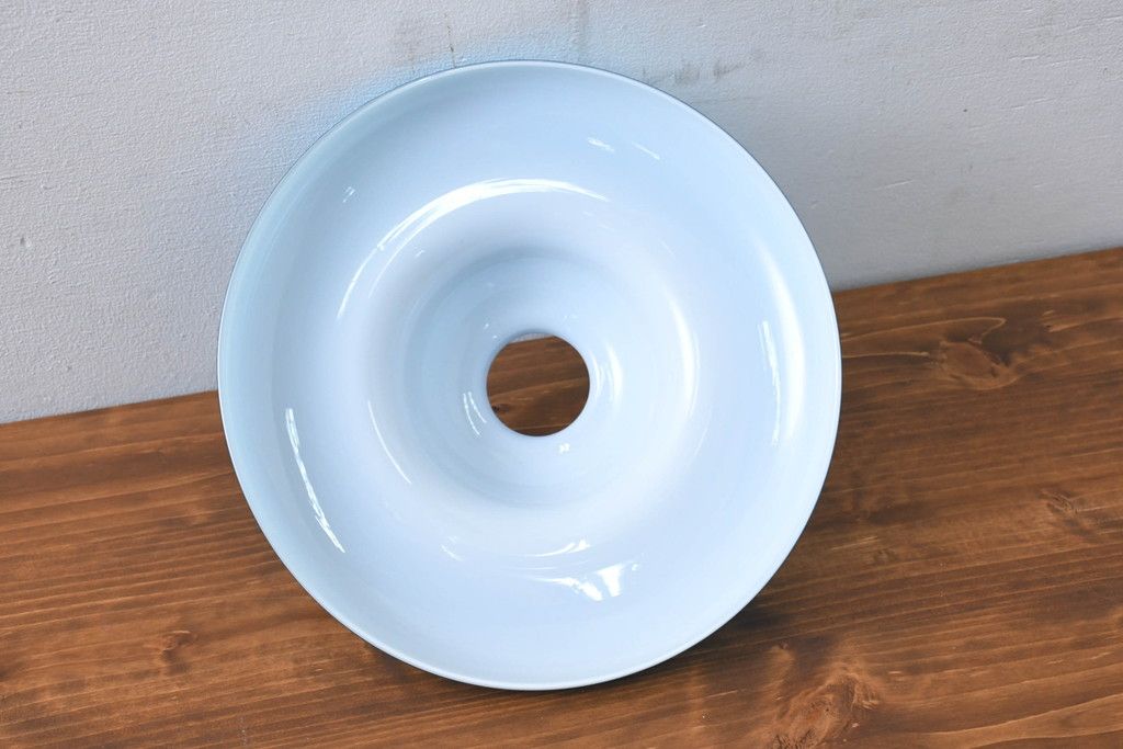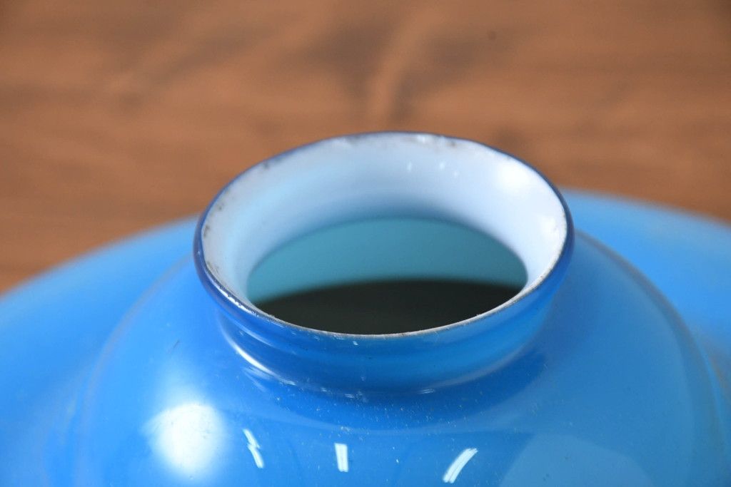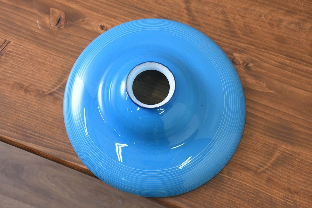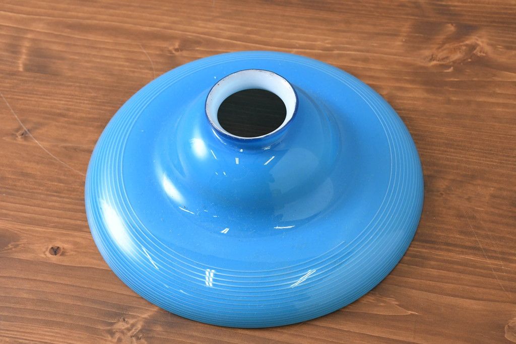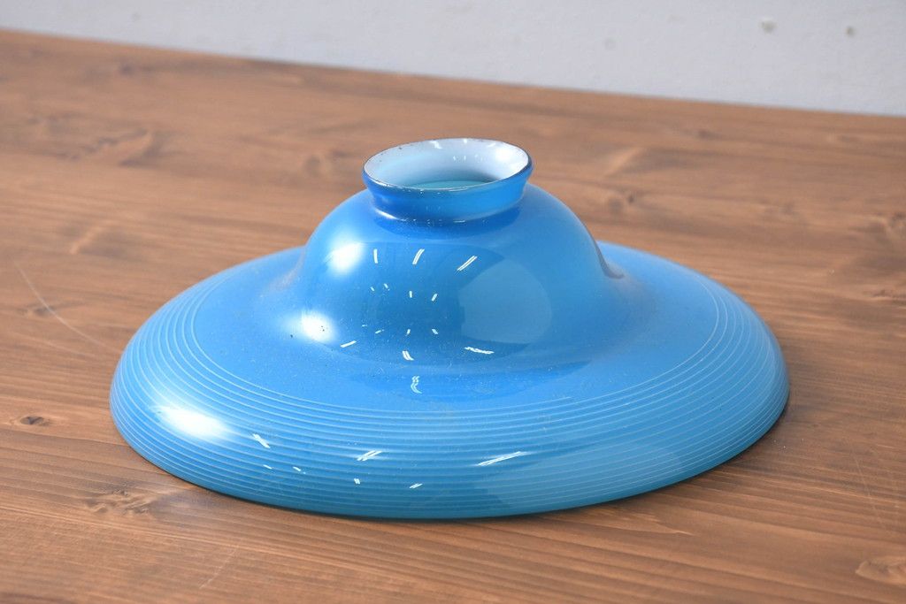 照明・ランプ> ペンダントライト > 《引っ掛けシーリング式ペンダントライト加工費込み》 和製アンティーク 大正期 被せガラス 青色白千段巻笠の天井照明(吊り下げ照明、ペンダントライト、シェード、電笠)(R-083400)