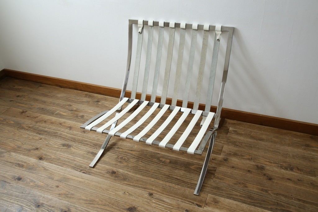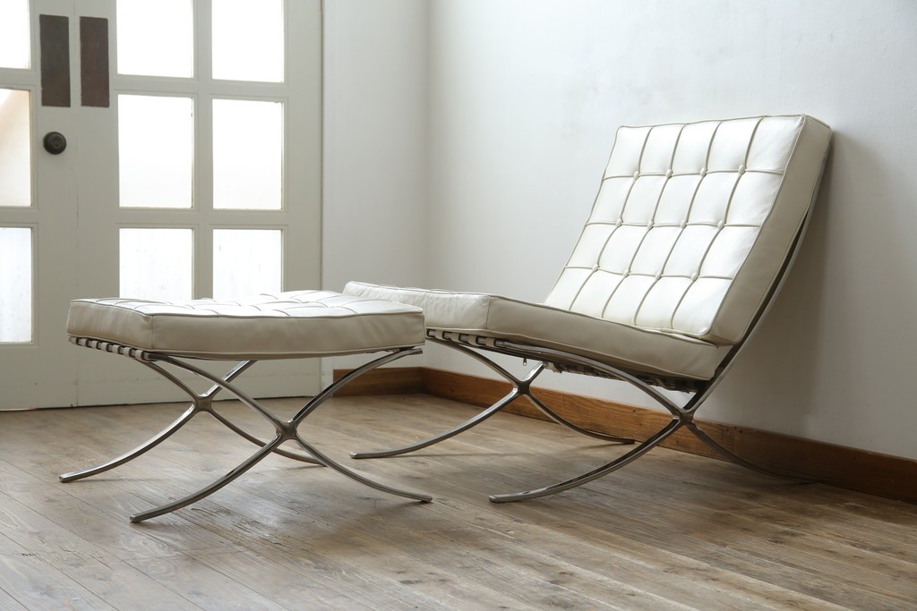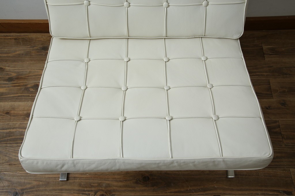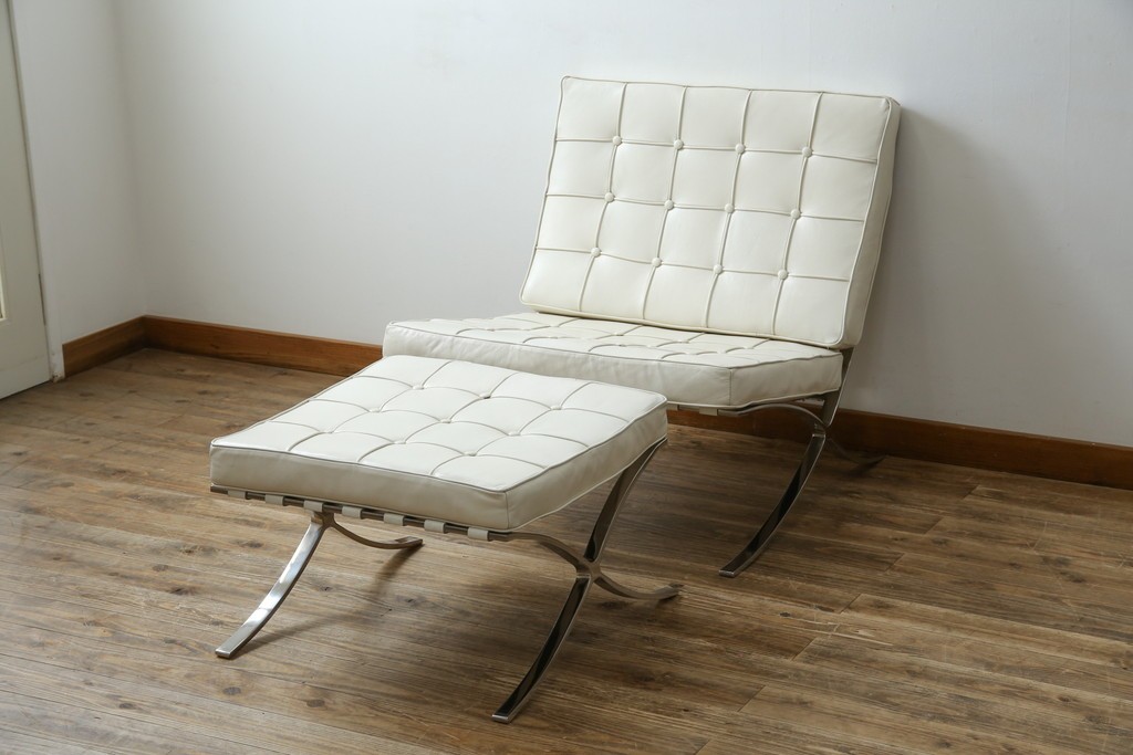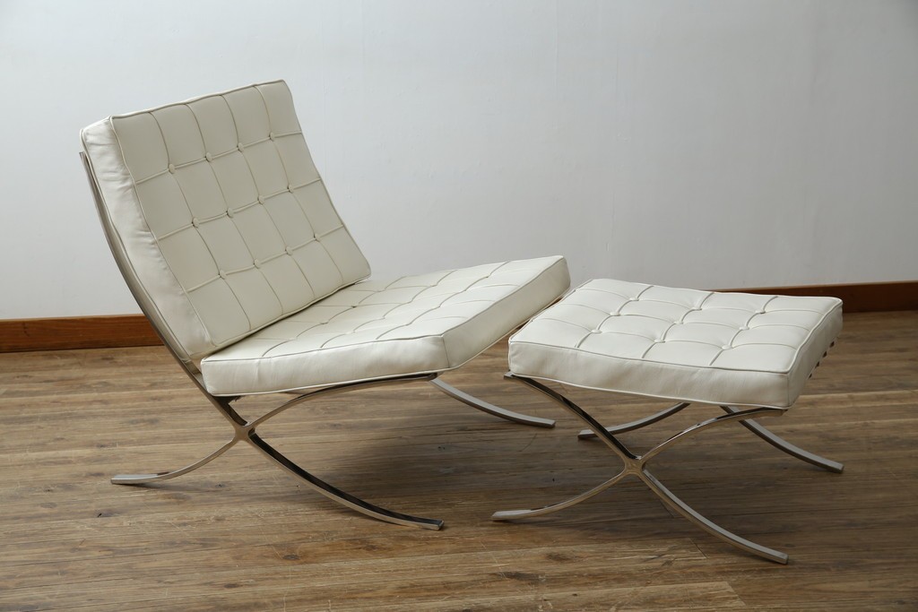 ソファ> 1人掛けソファ > イタリアビンテージ リプロダクト品 本革 モダンな寛ぎ空間を演出するバルセロナチェアとオットマンのセット(バルセロナスツール、1人掛けソファ、椅子、イス、ヴィンテージ)(当時25万円で購入)(R-083780)