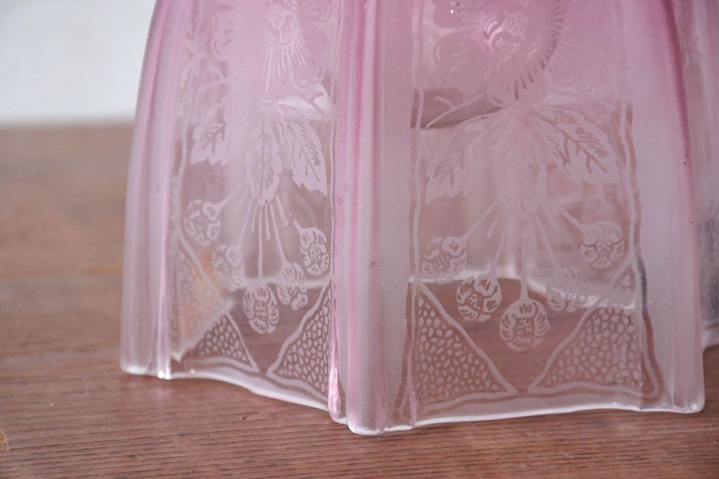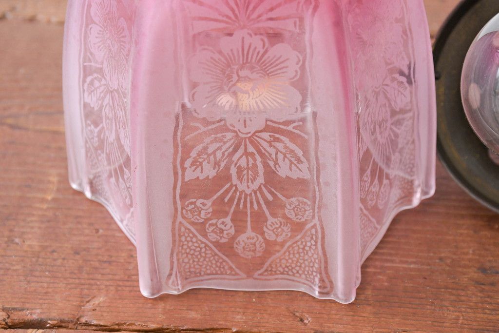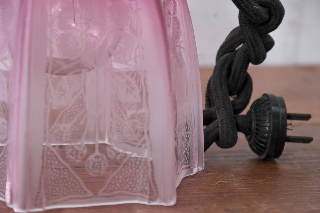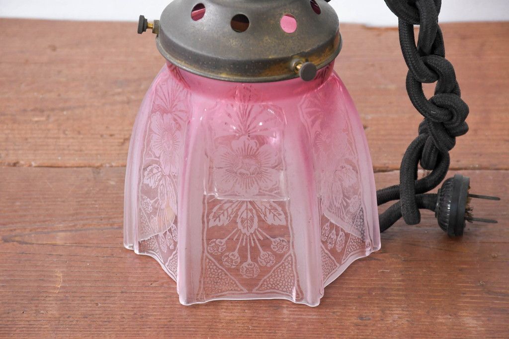 照明・ランプ> ペンダントライト > 《引っ掛けシーリング式ペンダントライト加工費込み》 フランスアンティーク 花模様のエッチングと淡いピンク色が可愛らしいペンダントライト(吊り下げ照明、天井照明、シェードランプ)(R-083954)