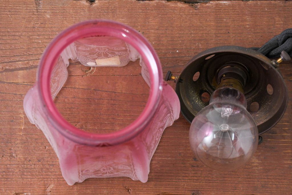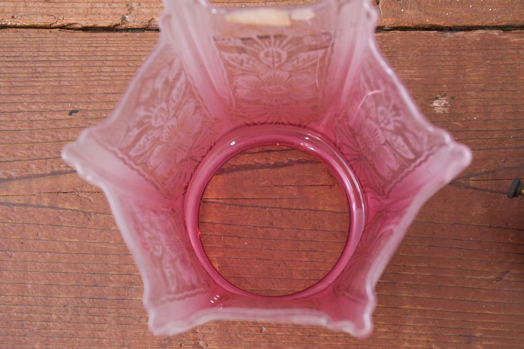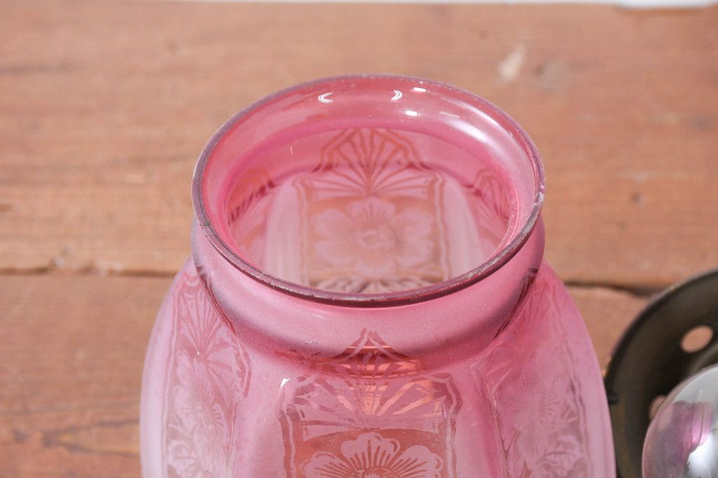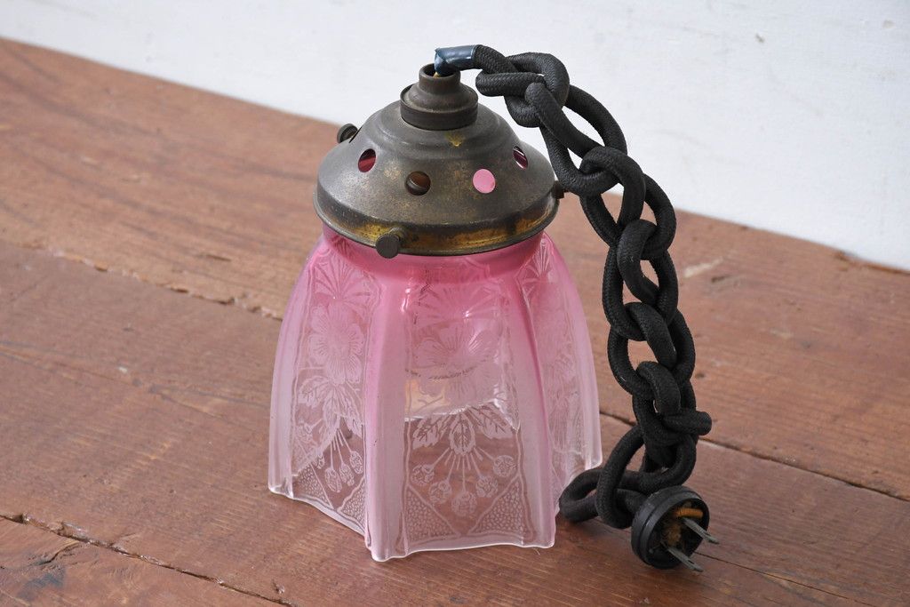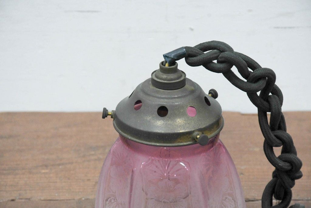 照明・ランプ> ペンダントライト > 《引っ掛けシーリング式ペンダントライト加工費込み》 フランスアンティーク 花模様のエッチングと淡いピンク色が可愛らしいペンダントライト(吊り下げ照明、天井照明、シェードランプ)(R-083954)