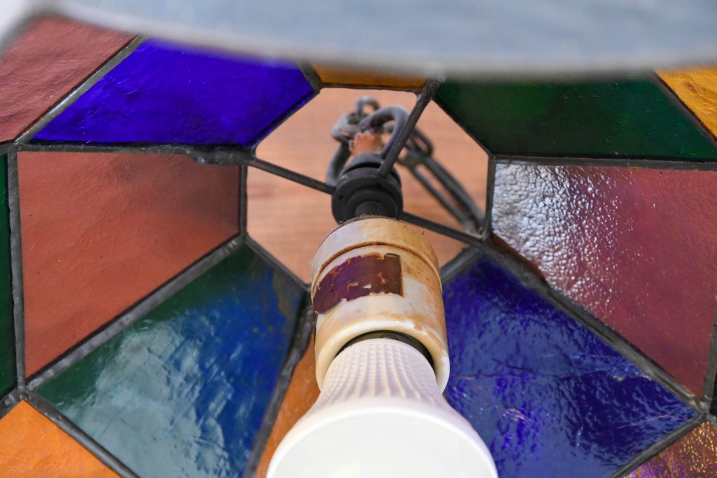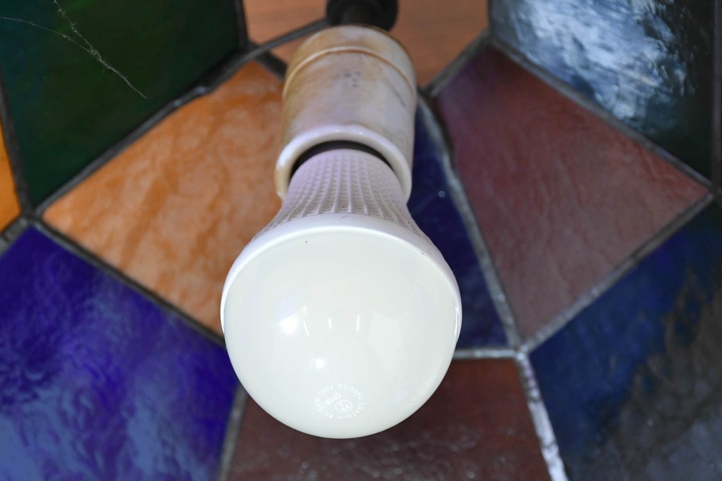 色ガラスを組み合わせた華やかなシェードが特徴で、点灯時にはガラス越しにやわらかな色彩が広がります。