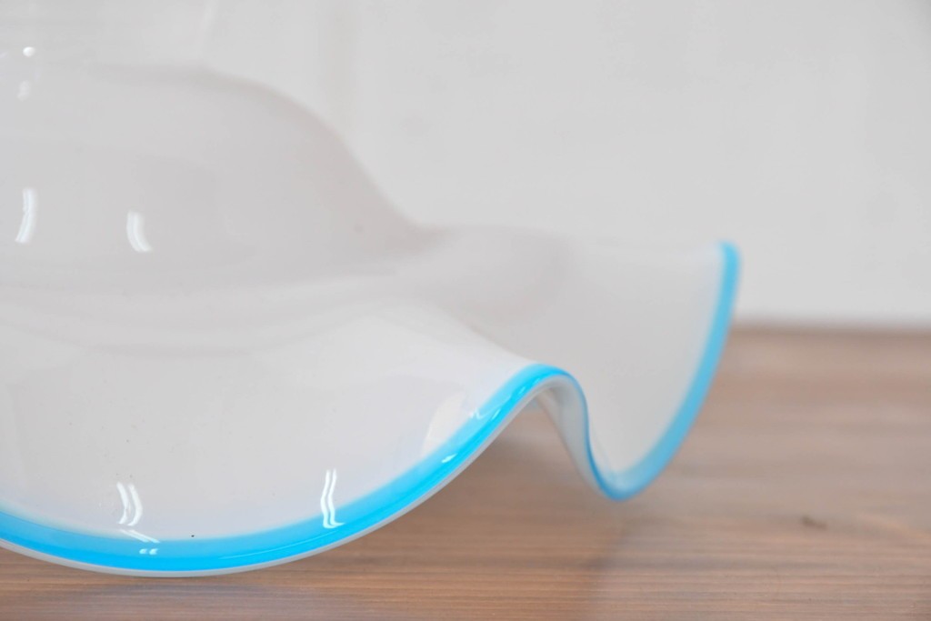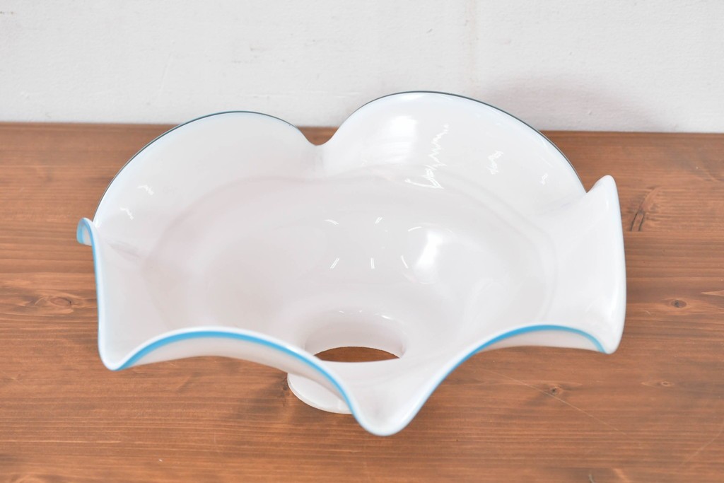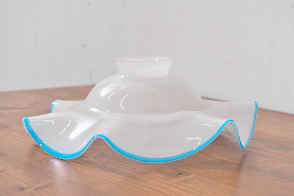 やわらかな白色ガラスに、明るい水色の縁取りを施したフリル形状が可愛らしい雰囲気を添えています。