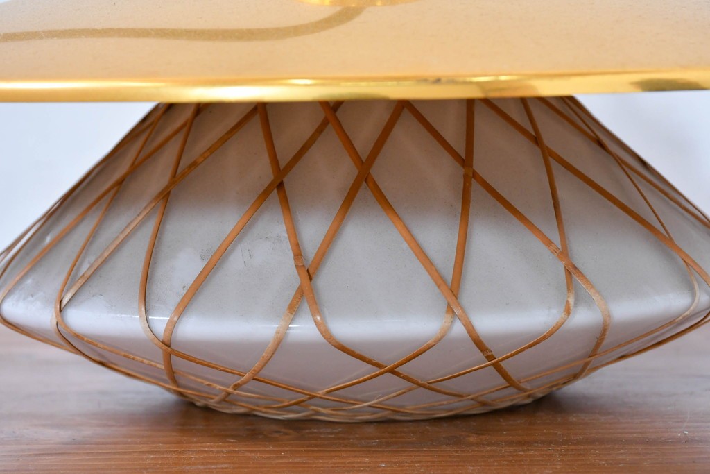 金色の笠と格子状の装飾をまとったガラスシェードが組み合わさり、華やかな佇まいを見せます。