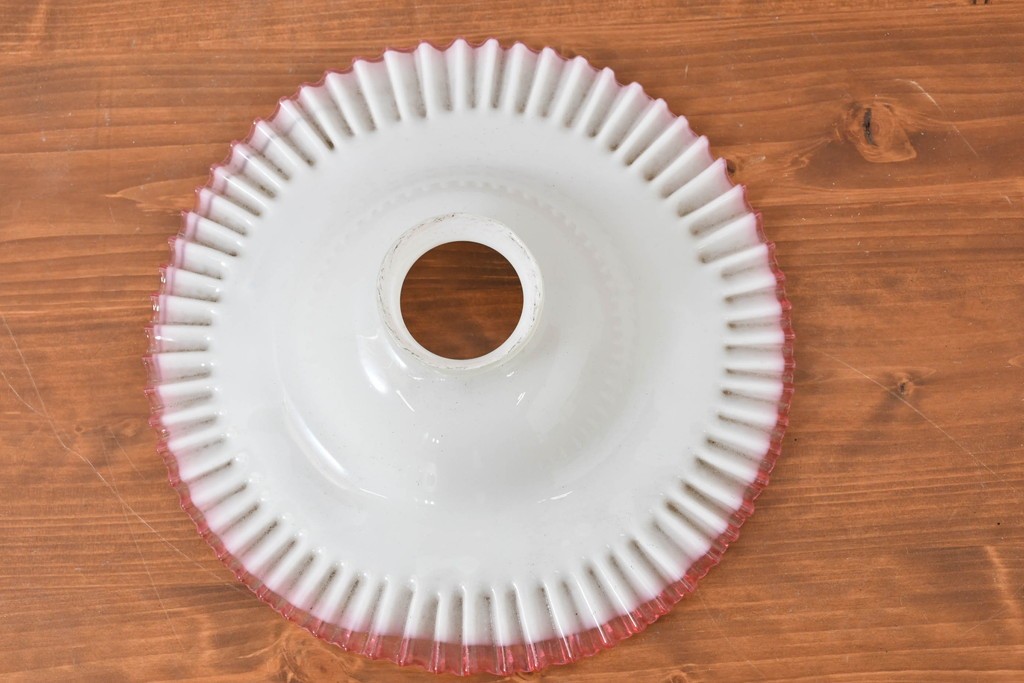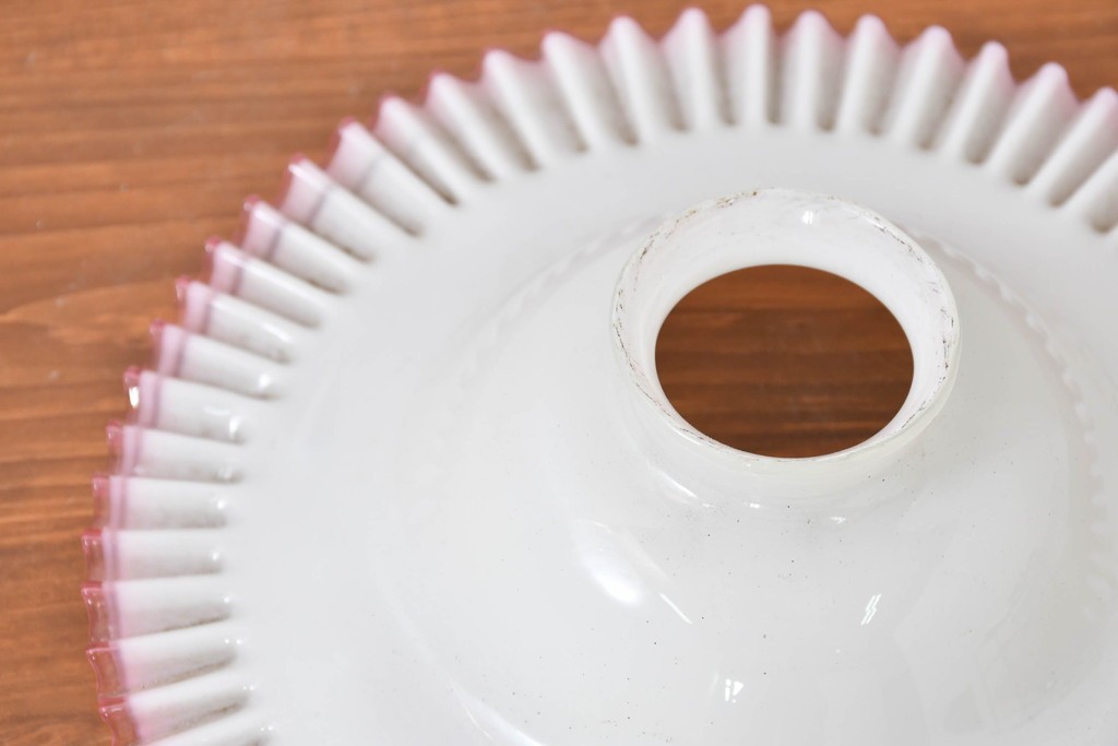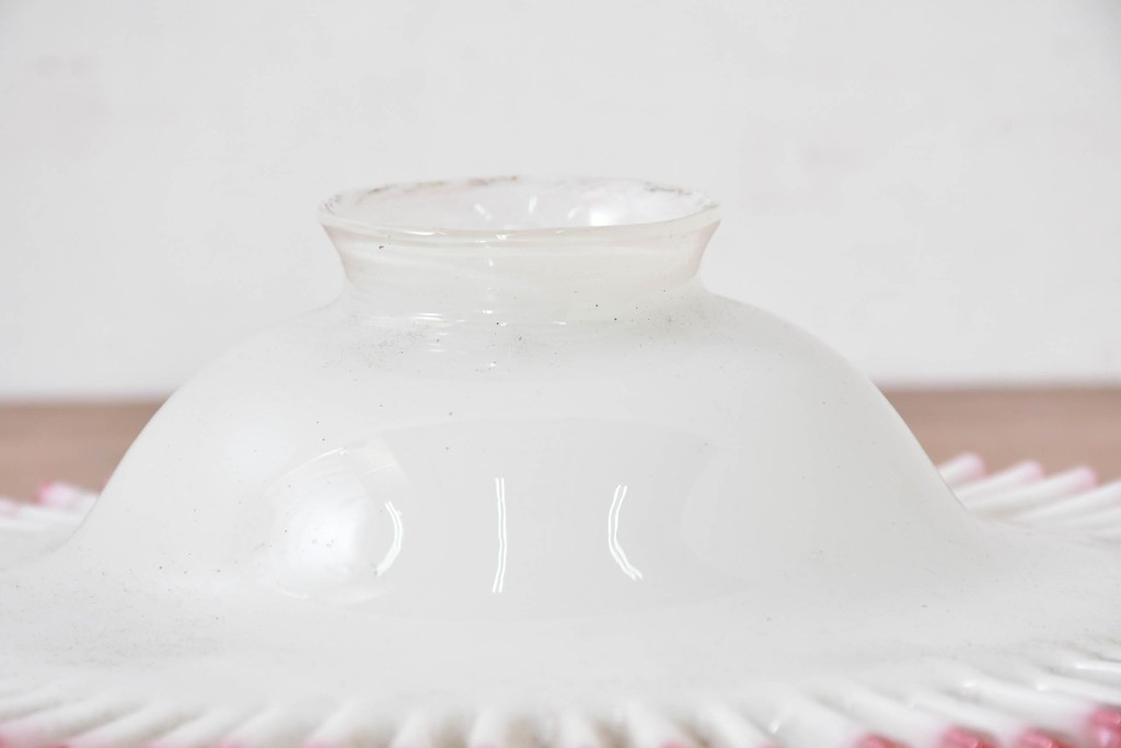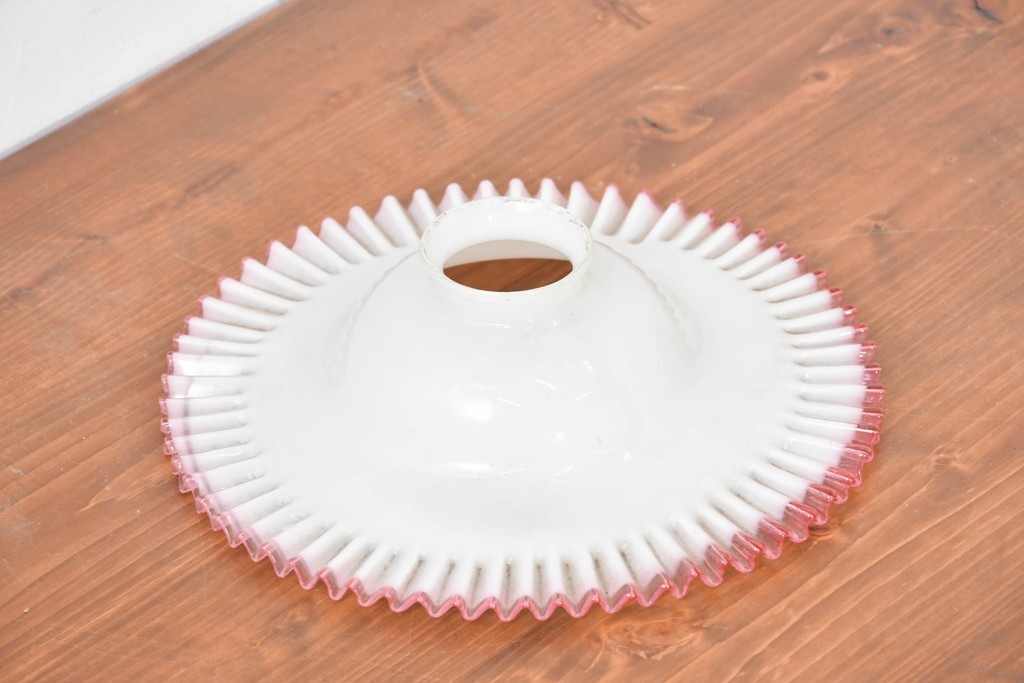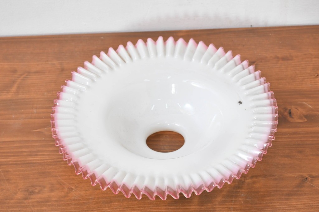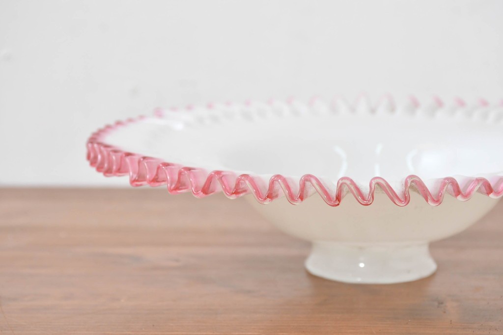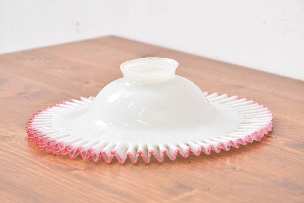乳白色のガラスに、縁を彩るピンクのフリル装飾が可憐さと華やぎを添えています。