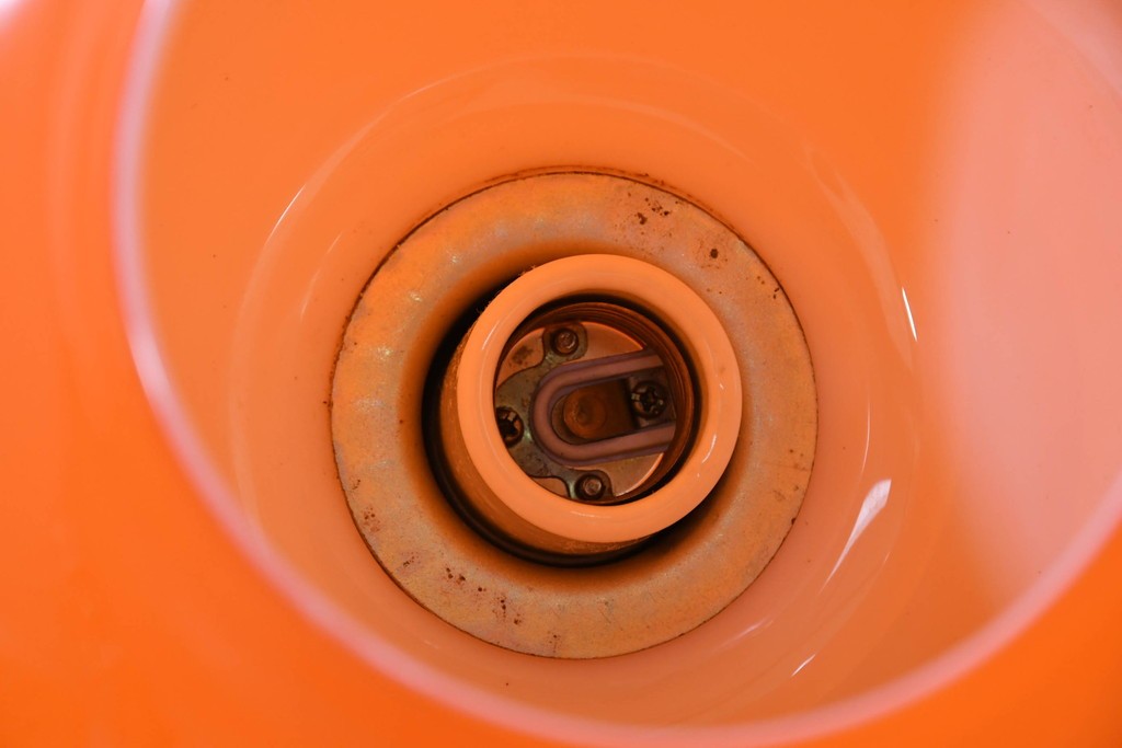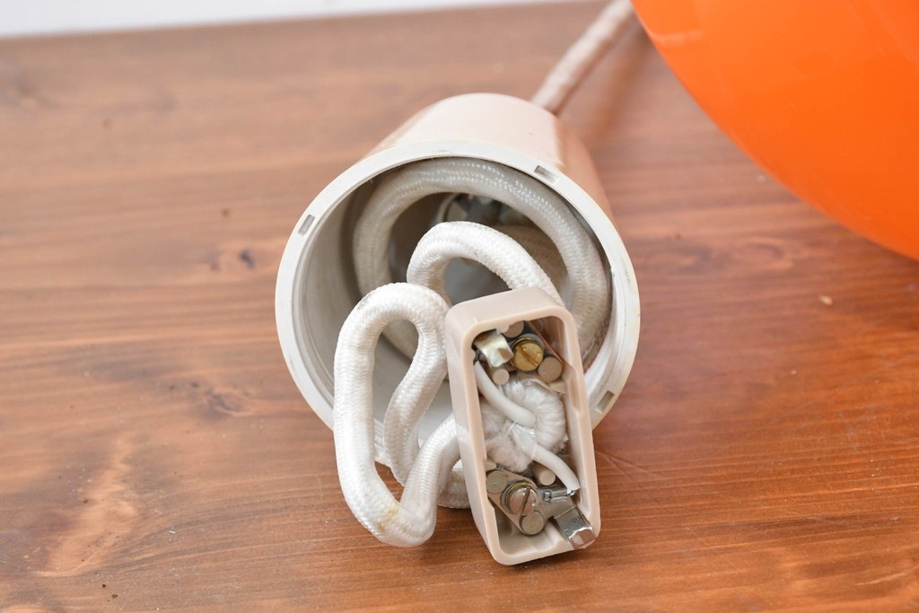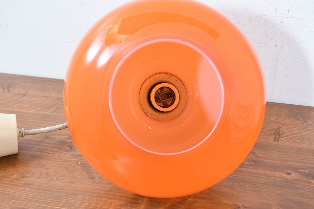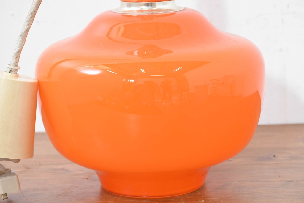 鮮やかなオレンジ色のシェードが空間にほどよいアクセントを添え、灯りをともすとガラス越しの光が優しく広がります。
