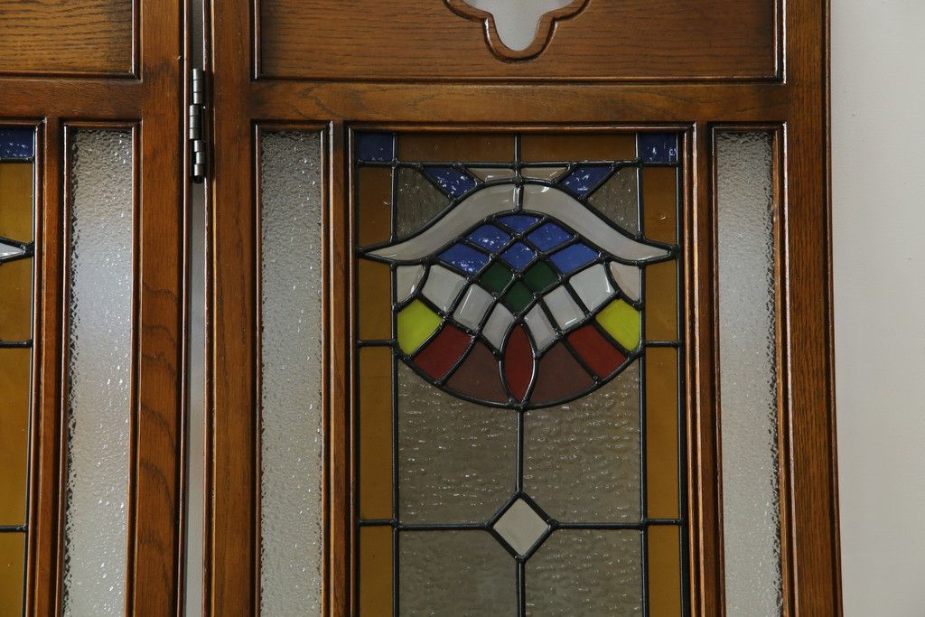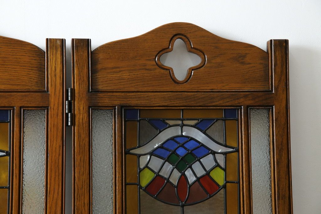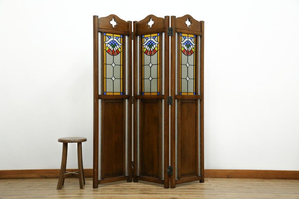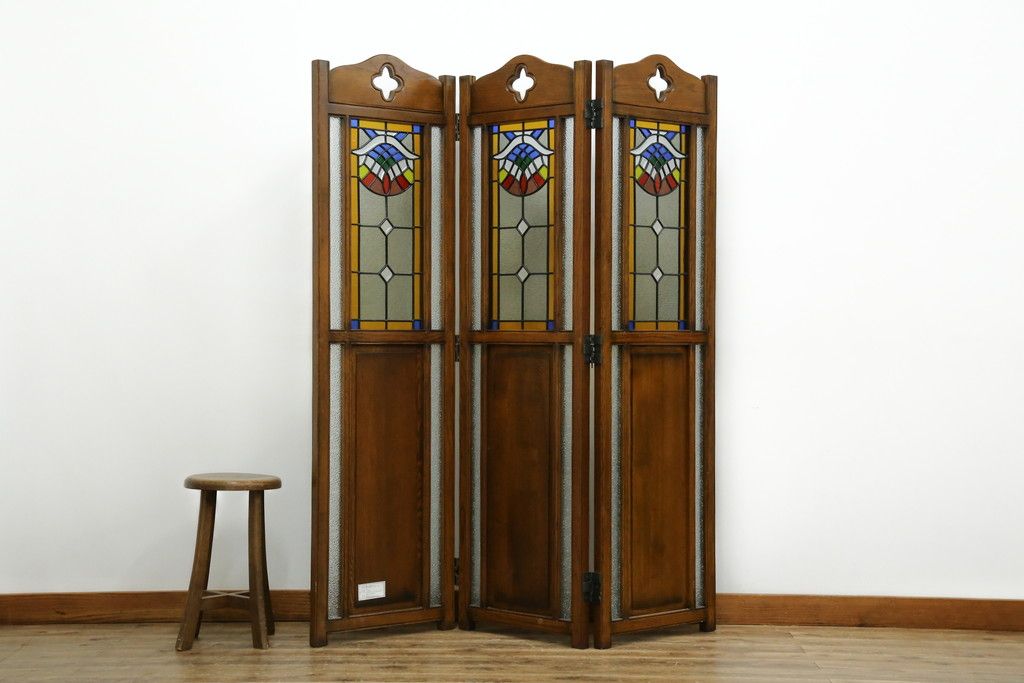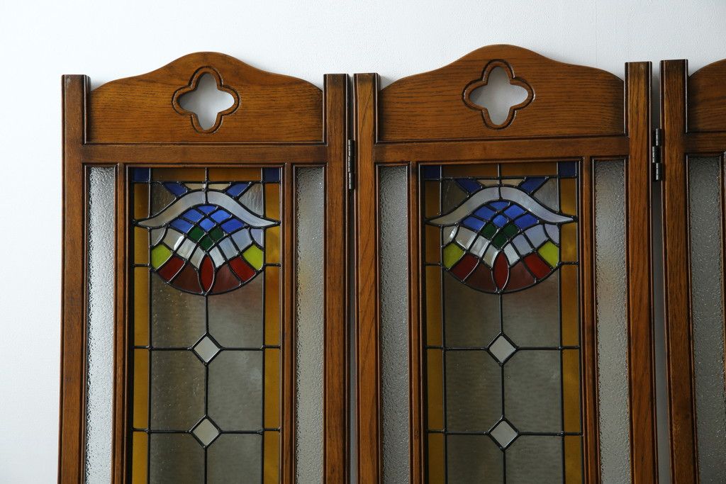 ステンドグラス > 中古 美品 鮮やかで美しいステンドグラス入りの3連衝立て(つい立て、衝い立て、パーテーション、スクリーン、間仕切り、店舗什器)(R-084251)