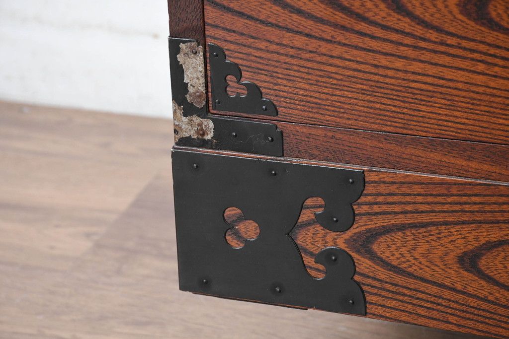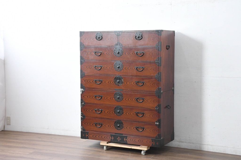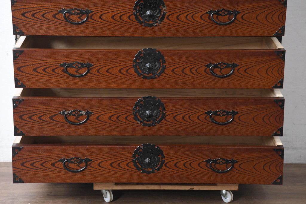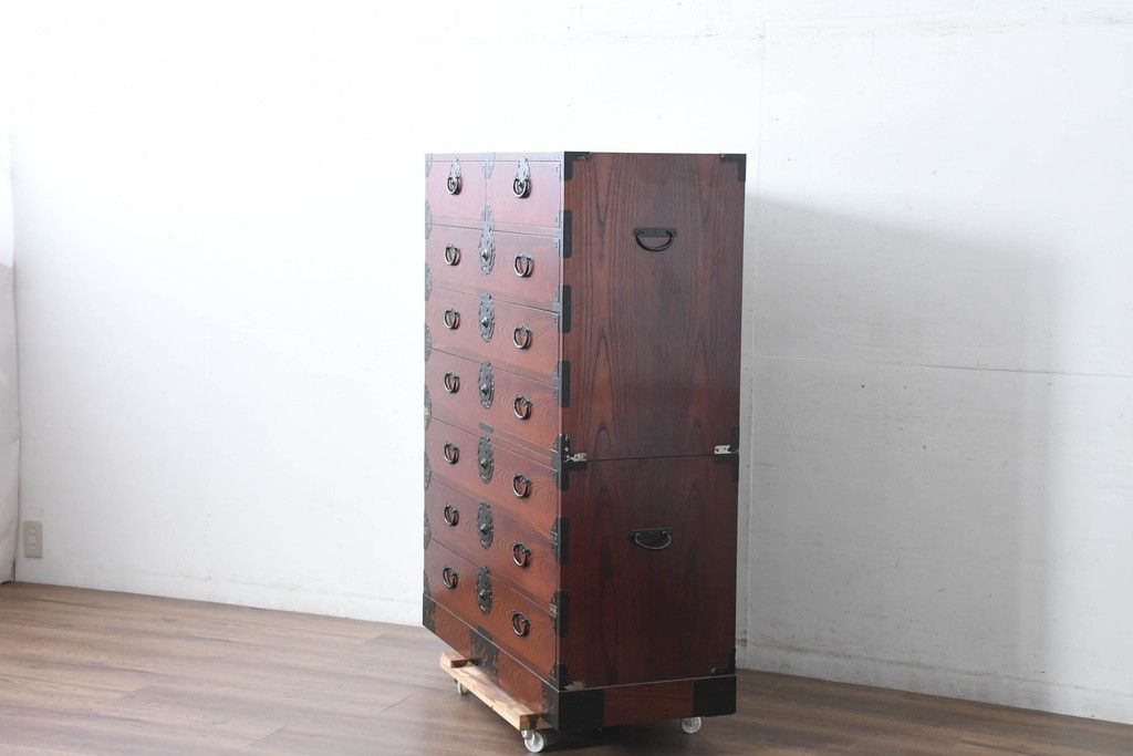 中古 美品 民芸家具 高級品!! 欅(ケヤキ)材 内部桐(キリ)材 蝶の図手打ち金具 伝統技術が息づく漆塗りの米沢箪笥(重ね箪笥、和タンス、収納箪笥、バラ売り可能)(R-084275)