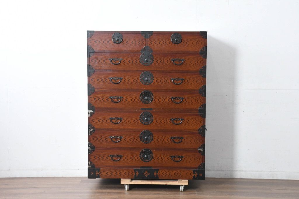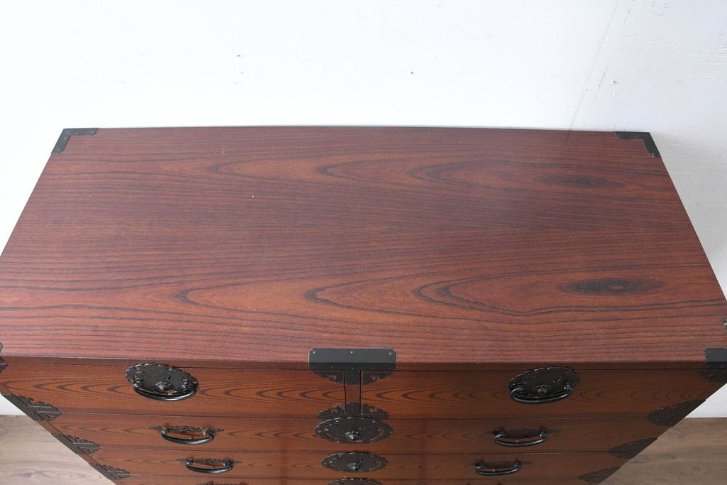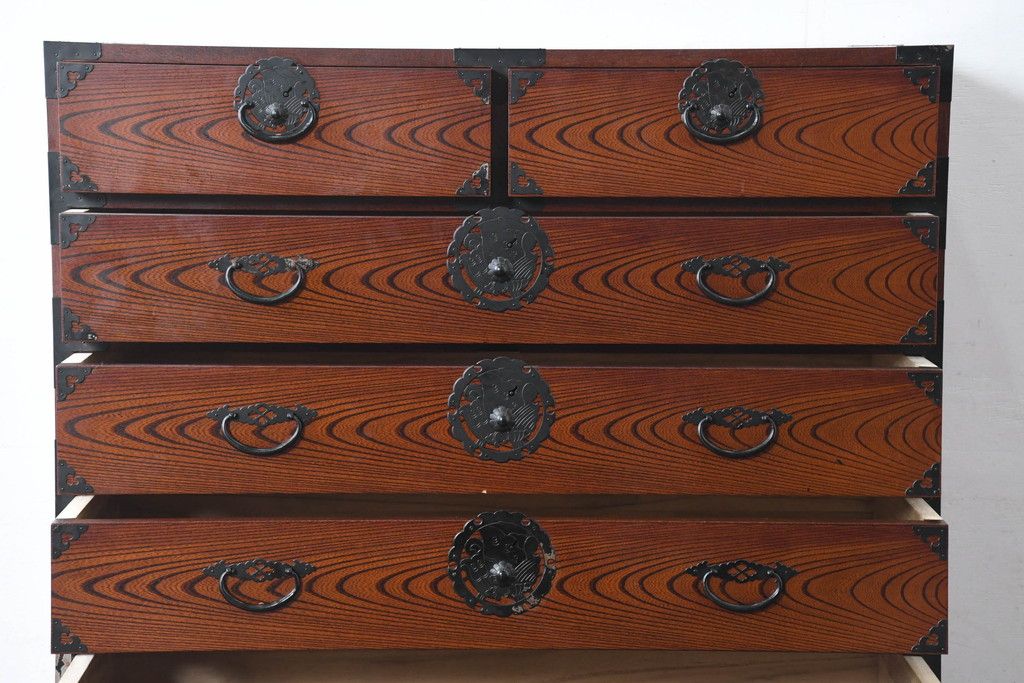 和箪笥> 衣装箪笥 > 中古 美品 民芸家具 高級品!! 欅(ケヤキ)材 内部桐(キリ)材 蝶の図手打ち金具 伝統技術が息づく漆塗りの米沢箪笥(重ね箪笥、和タンス、収納箪笥、バラ売り可能)(R-084275)