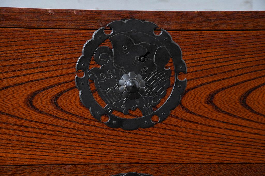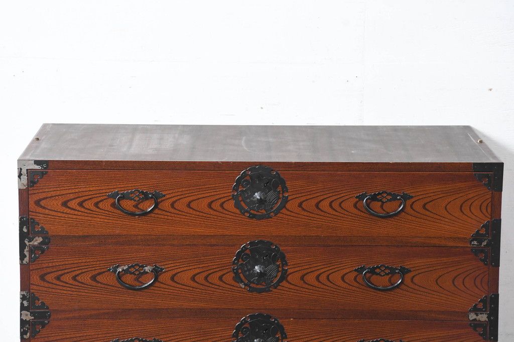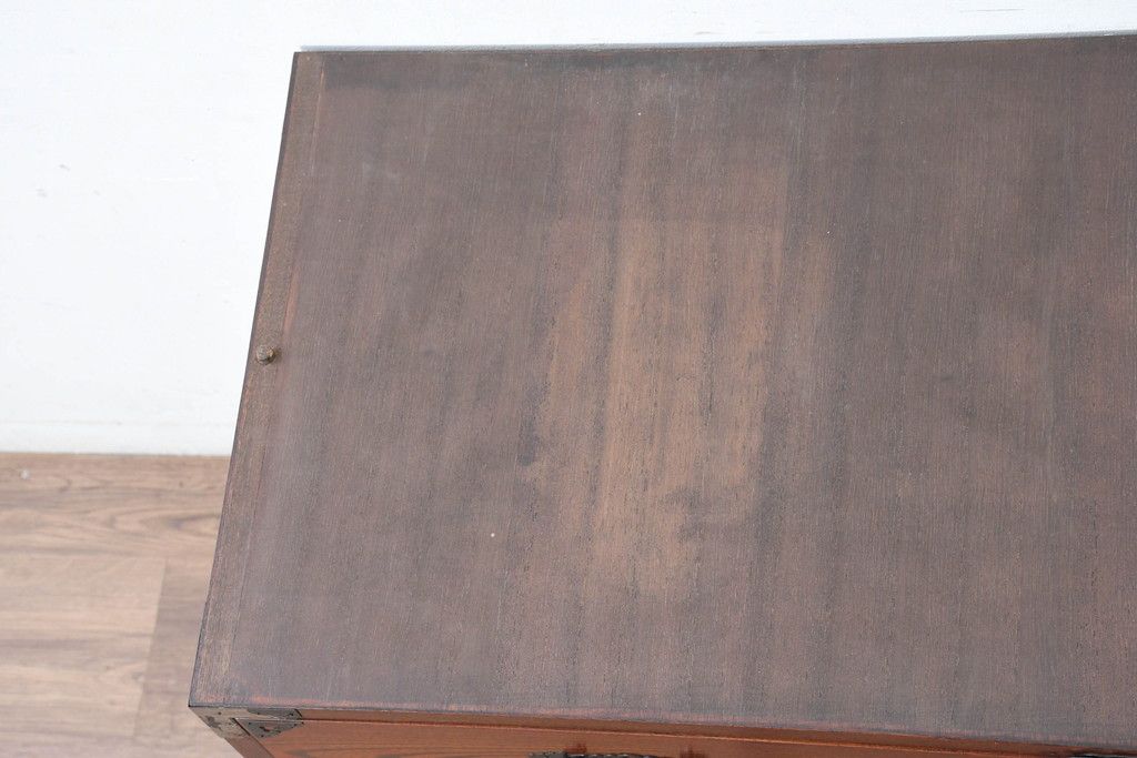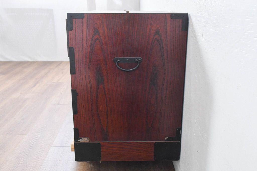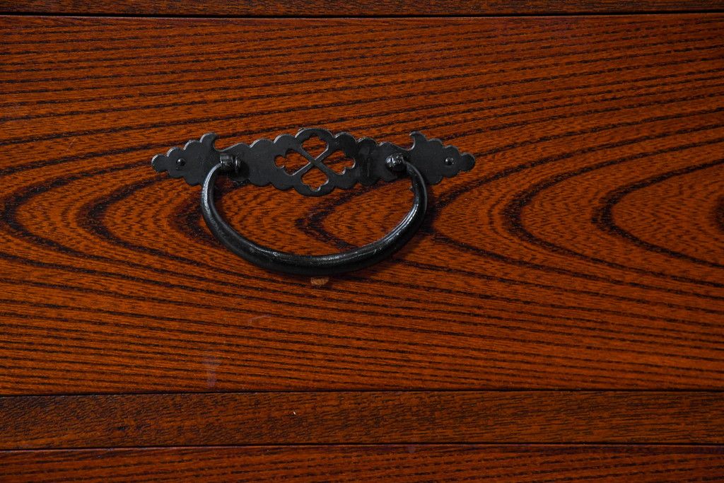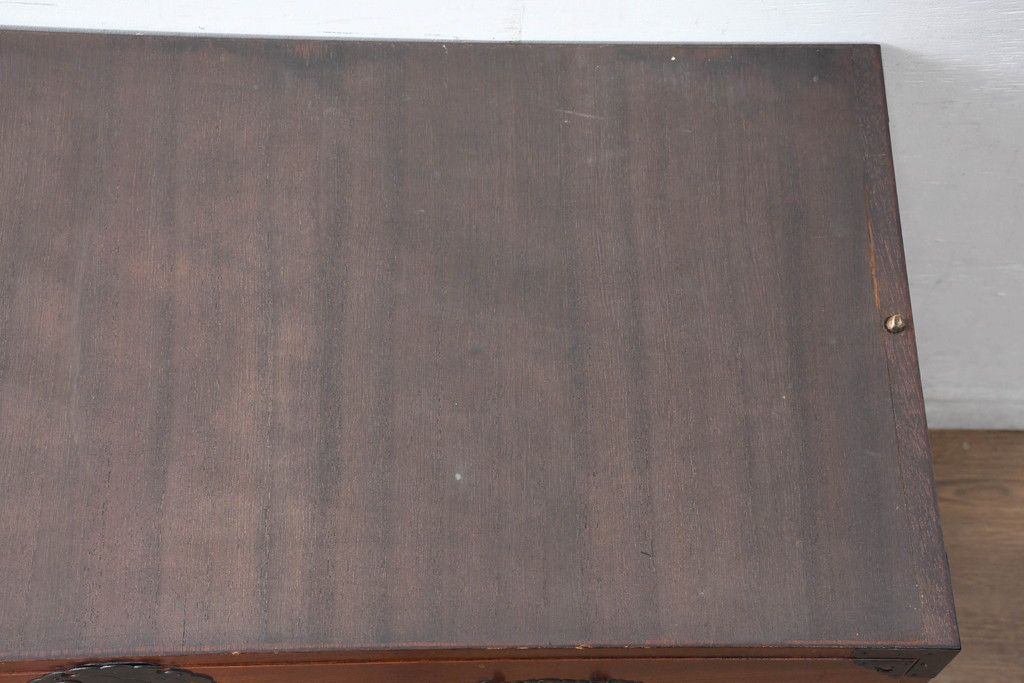 民芸家具 > 中古 美品 民芸家具 高級品!! 欅(ケヤキ)材 内部桐(キリ)材 天板リメイク 蝶の図手打ち金具 伝統技術が息づく漆塗りの米沢箪笥ローチェスト(和タンス、収納箪笥、整理箪笥、引き出し、ローボード、テレビ台、テレビボード)(R-084277)