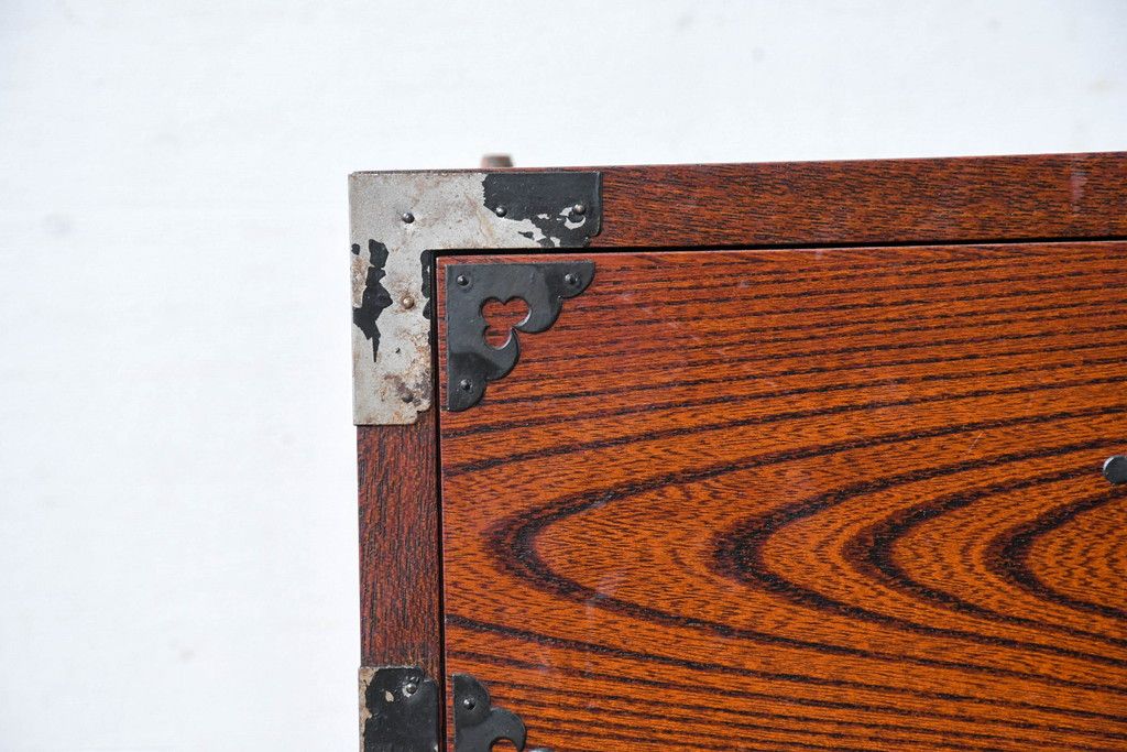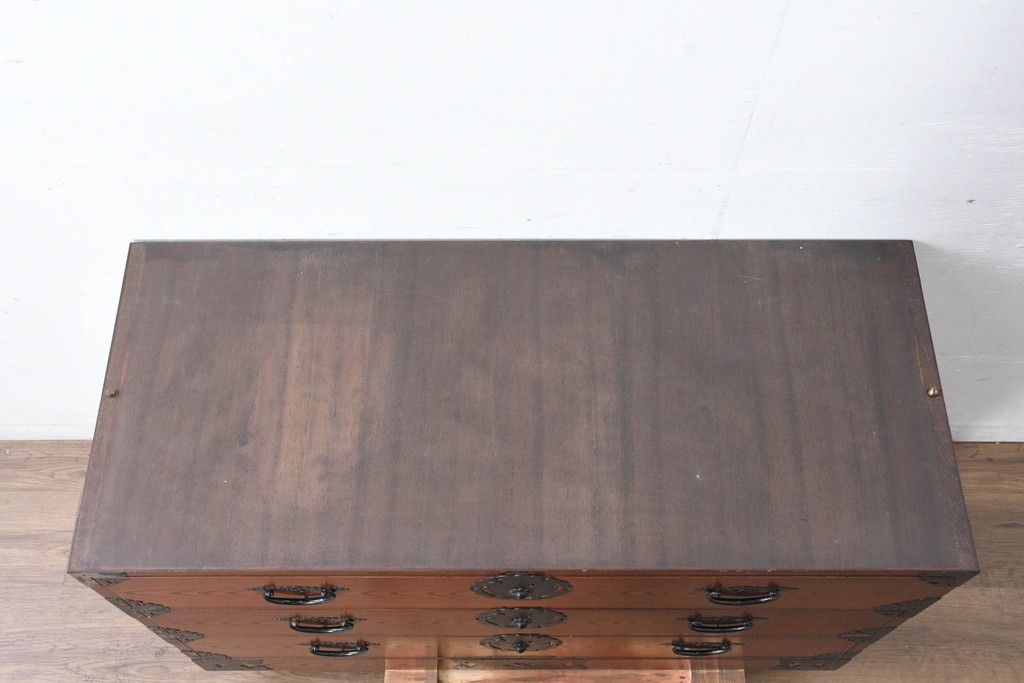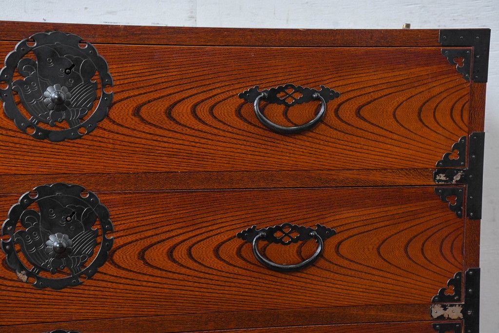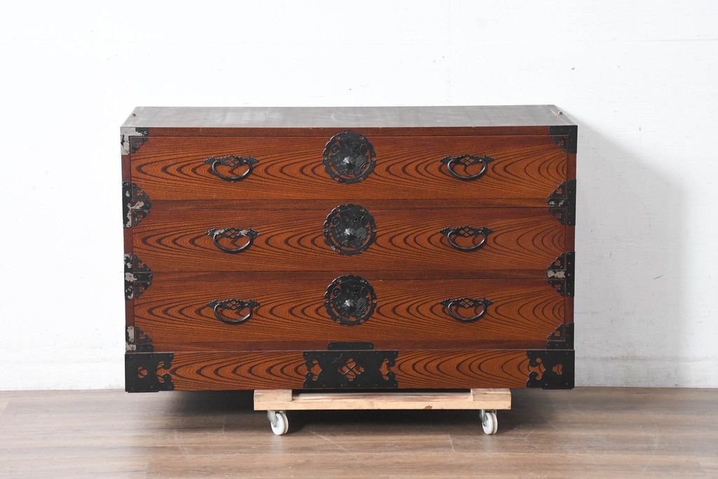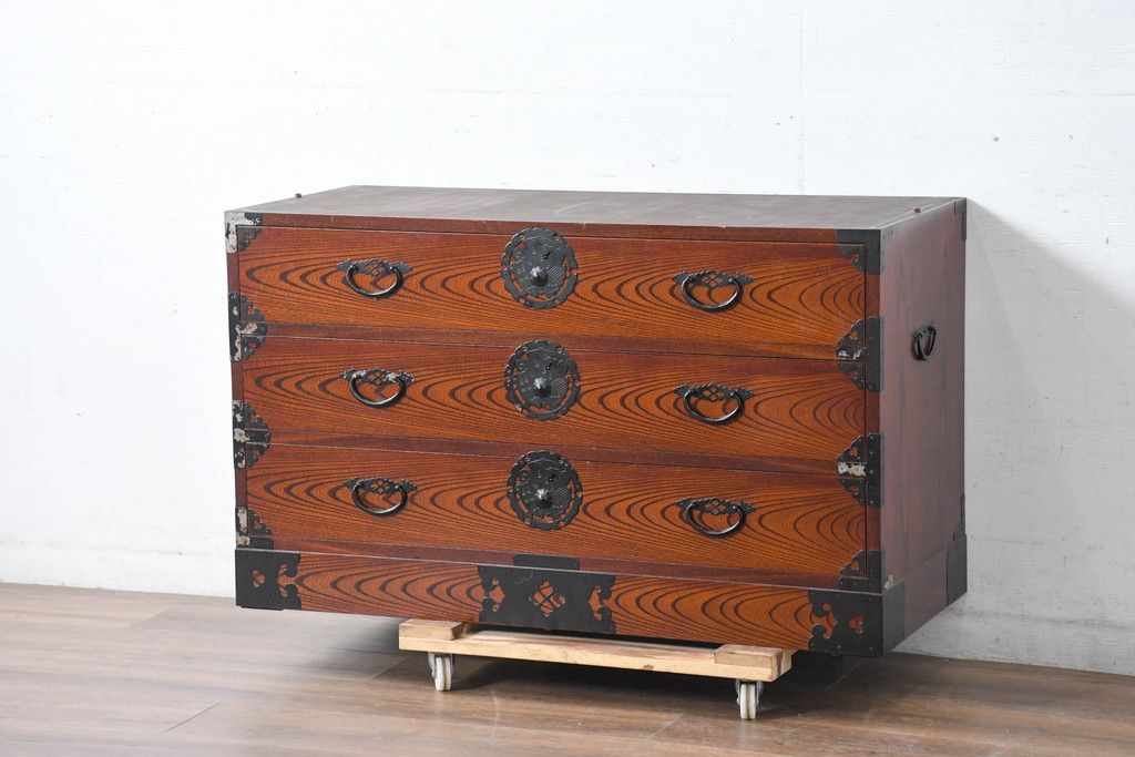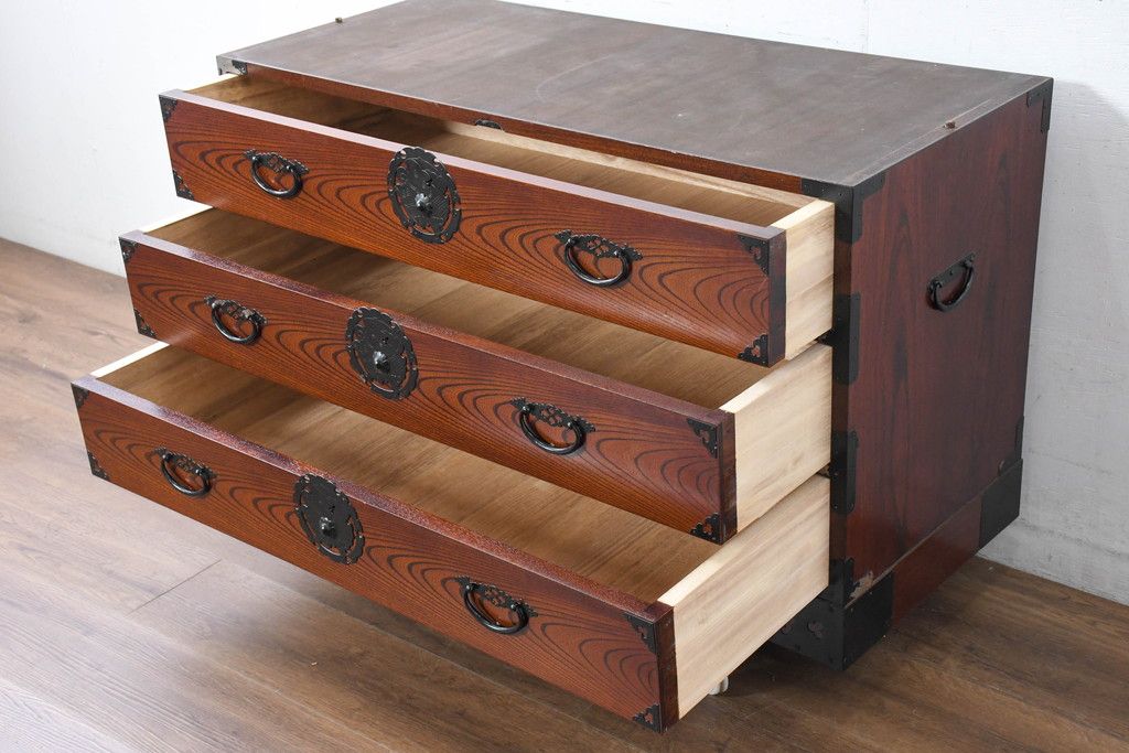 民芸家具 > 中古 美品 民芸家具 高級品!! 欅(ケヤキ)材 内部桐(キリ)材 天板リメイク 蝶の図手打ち金具 伝統技術が息づく漆塗りの米沢箪笥ローチェスト(和タンス、収納箪笥、整理箪笥、引き出し、ローボード、テレビ台、テレビボード)(R-084277)