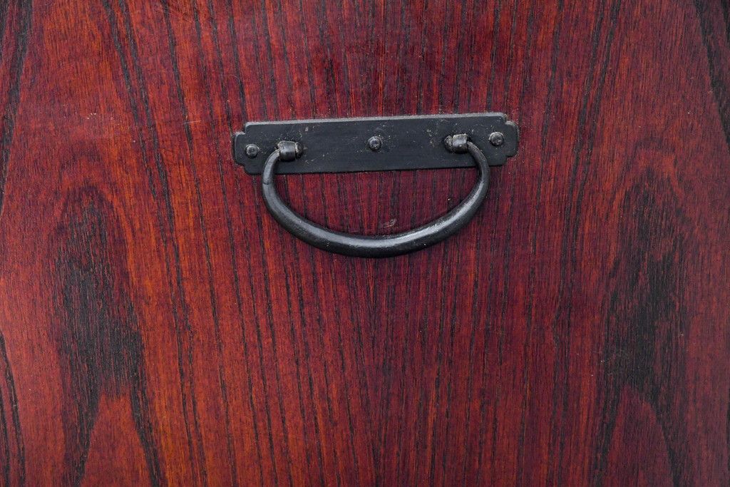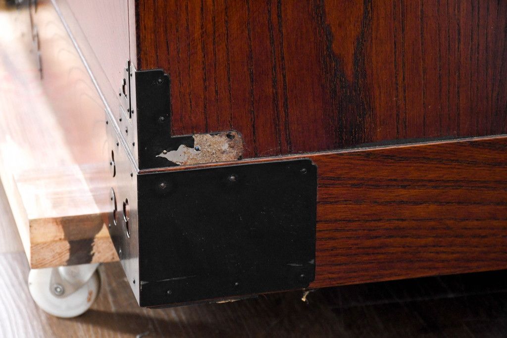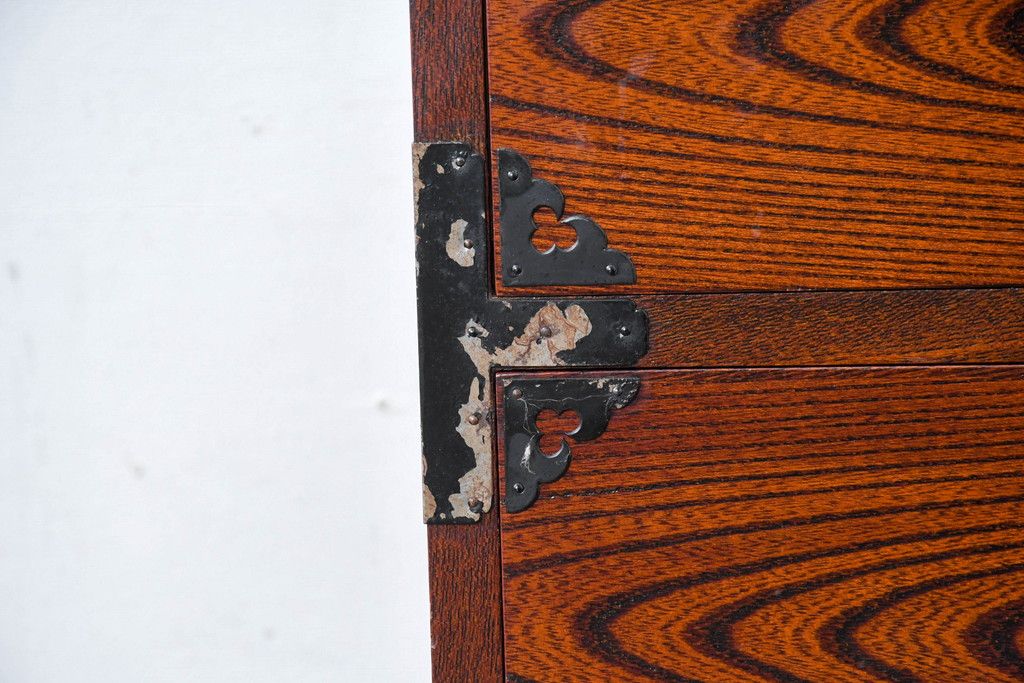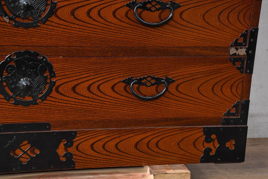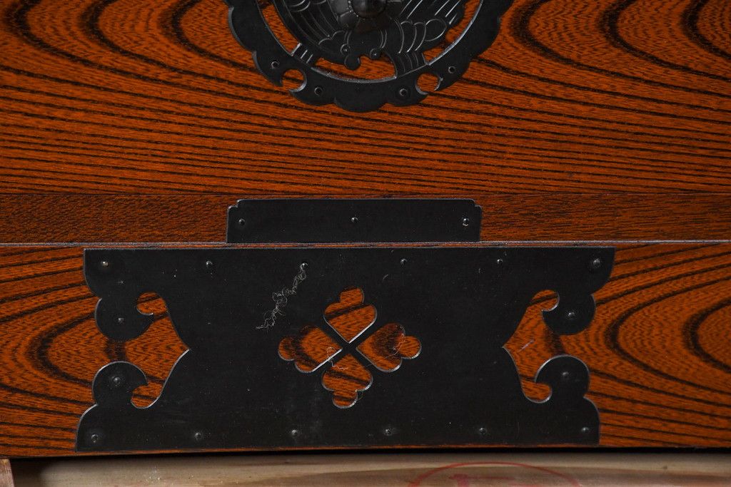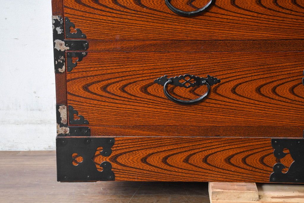 民芸家具 > 中古 美品 民芸家具 高級品!! 欅(ケヤキ)材 内部桐(キリ)材 天板リメイク 蝶の図手打ち金具 伝統技術が息づく漆塗りの米沢箪笥ローチェスト(和タンス、収納箪笥、整理箪笥、引き出し、ローボード、テレビ台、テレビボード)(R-084277)