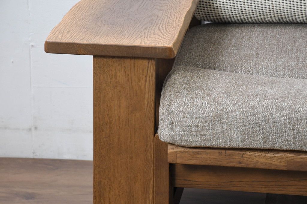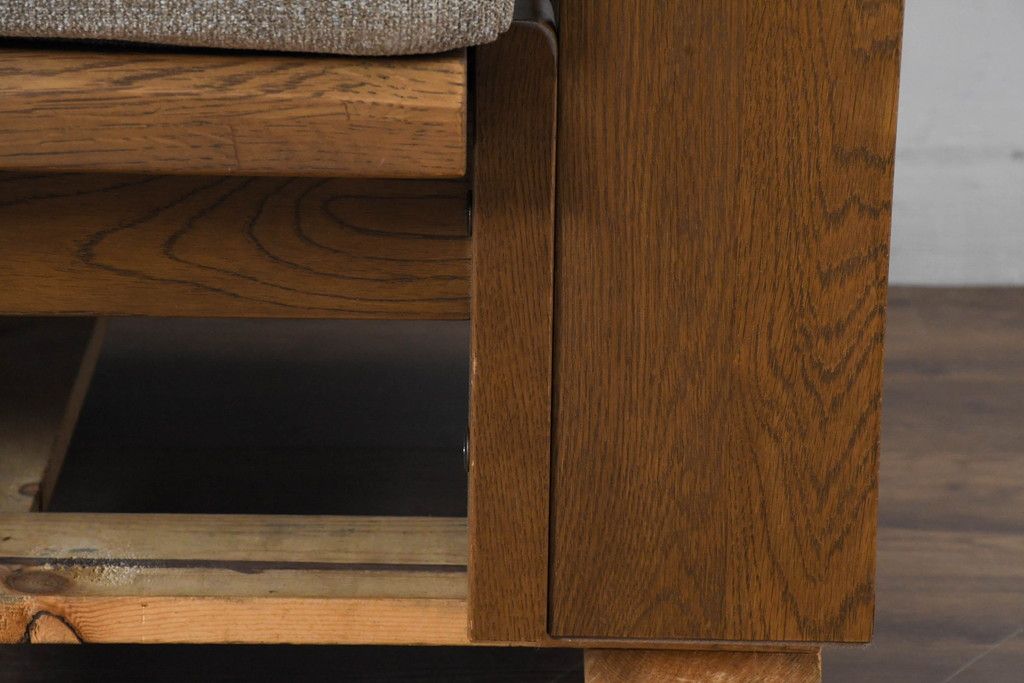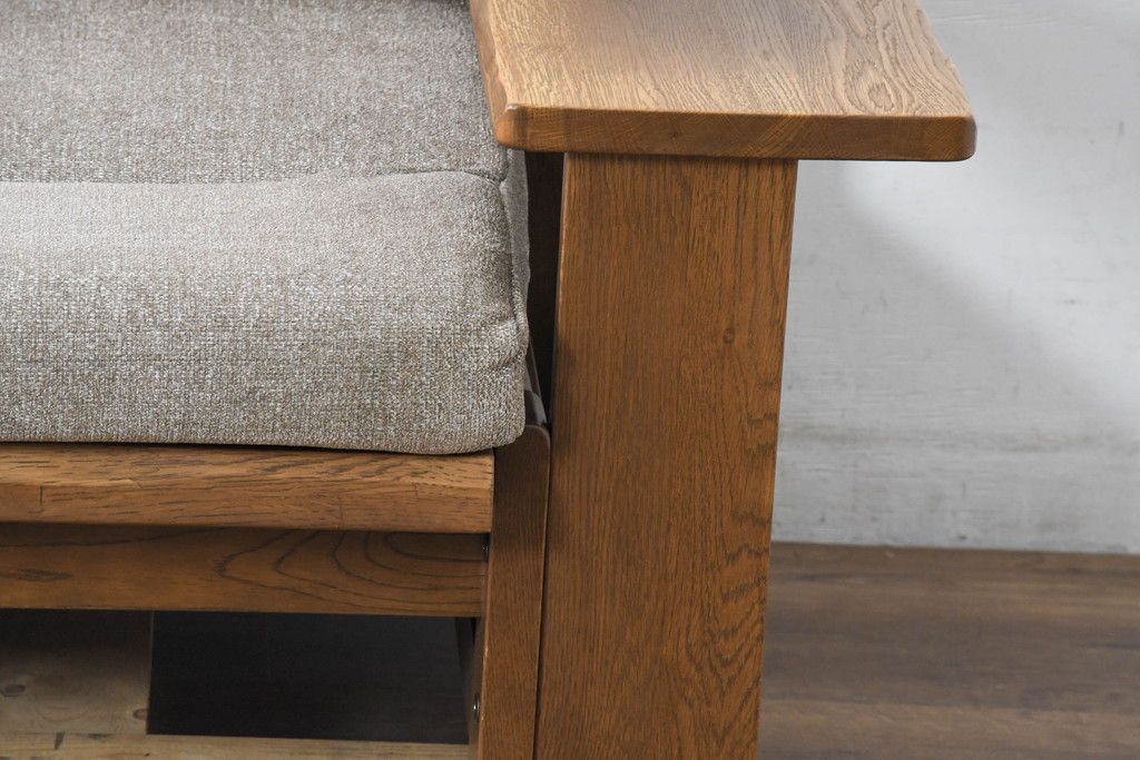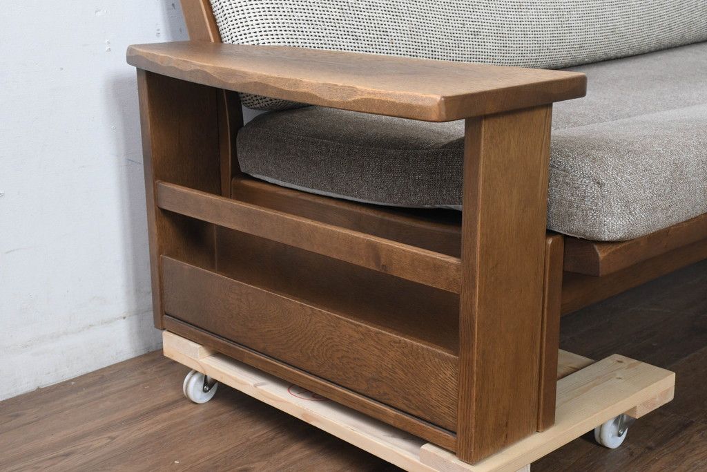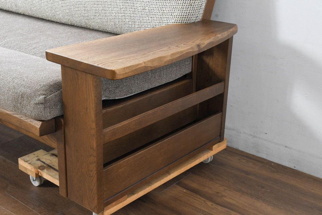 中古 希少な廃番品!! ナラ材の浮造り仕上げ!イバタインテリアのマガジンラックが付いた3人掛けソファ(三人掛け、アームソファ)(定価約27万円)(R-084295)