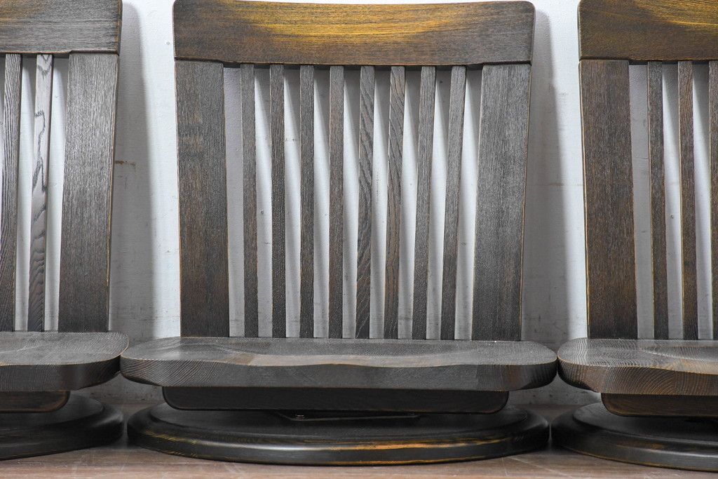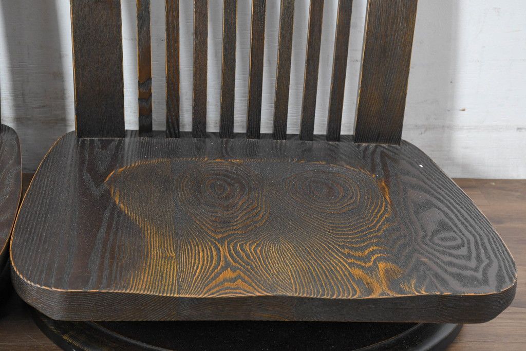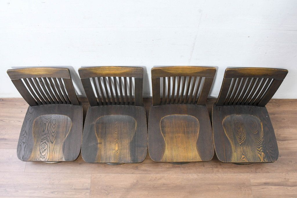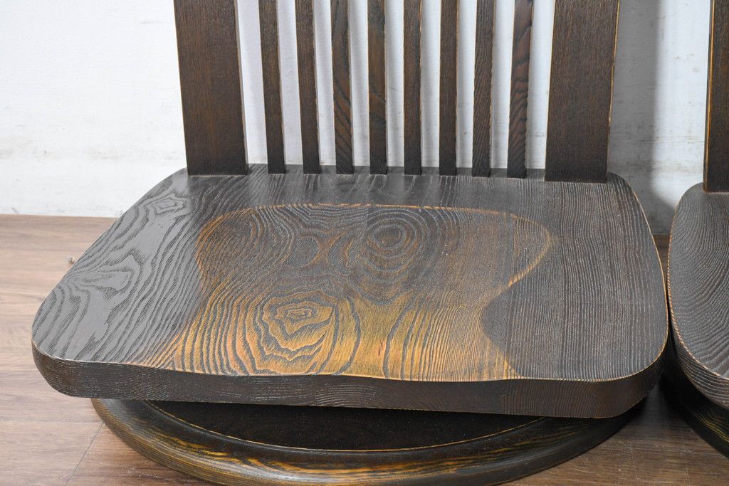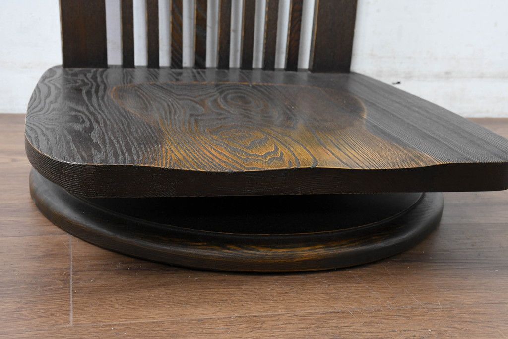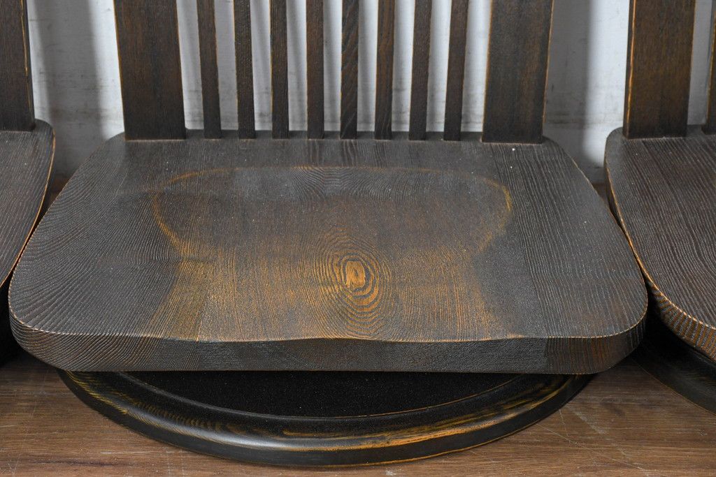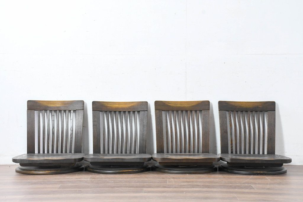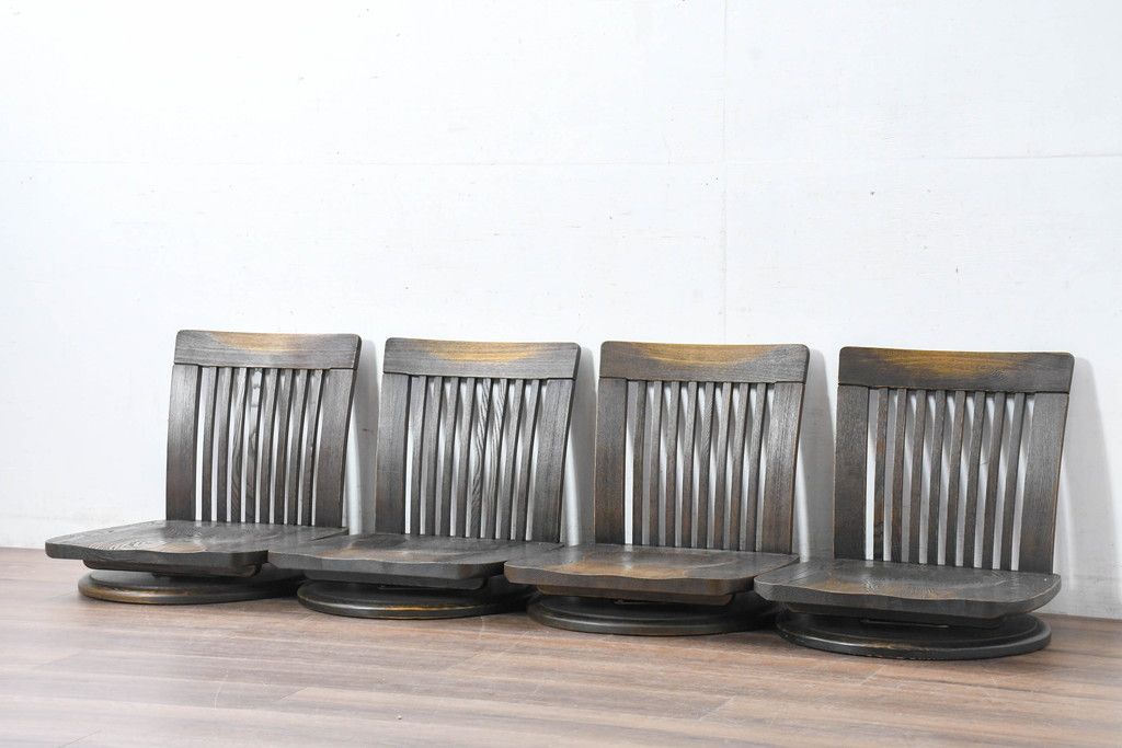 ラフジュ工房> 椅子・ベンチ> 座椅子 > 中古 希少な廃番品!! 葉山ガーデン取り扱い 国産 職人手作り品 タモ材 アンティーク調の回転座椅子4台セット(回転チェア、囲炉裏チェア、イス、椅子、バラ売り可能)(R-084300)