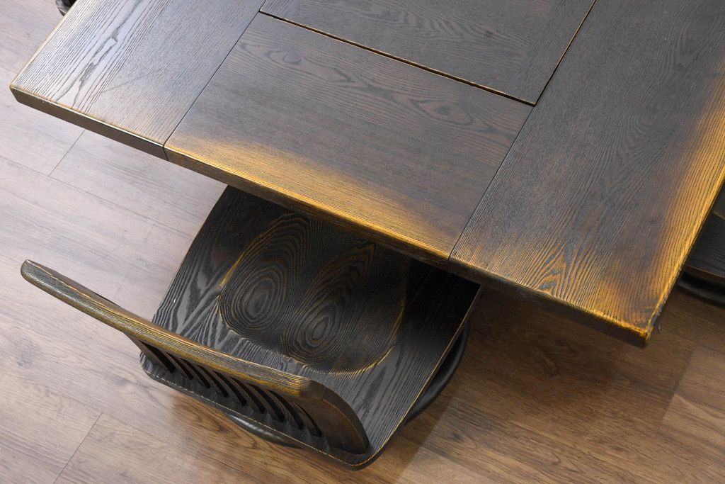 ラフジュ工房> 椅子・ベンチ> 回転椅子 > 中古 希少な廃番品!! 葉山ガーデン取り扱い 国産 職人手作り品 タモ材 アンティーク調の回転座椅子4台セット(回転チェア、囲炉裏チェア、イス、椅子、バラ売り可能)(R-084300)