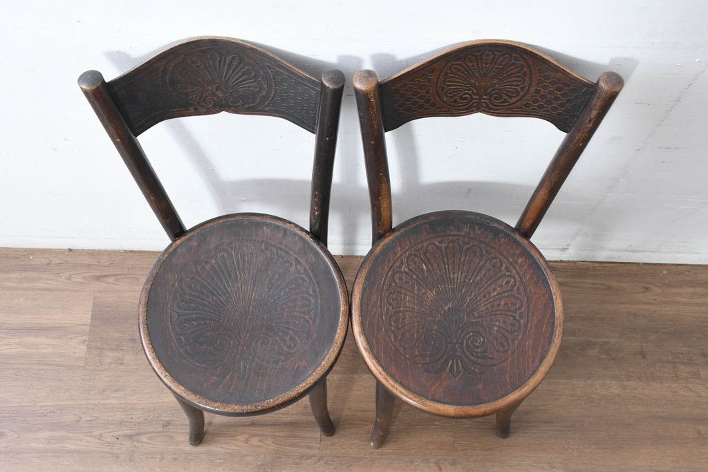 ヨーロッパアンティーク 背もたれの彫刻が優美な西洋アンティークのベントウッドチェア2脚セット(ダイニングチェア、椅子、イス、バラ売り可能)(R-084308)