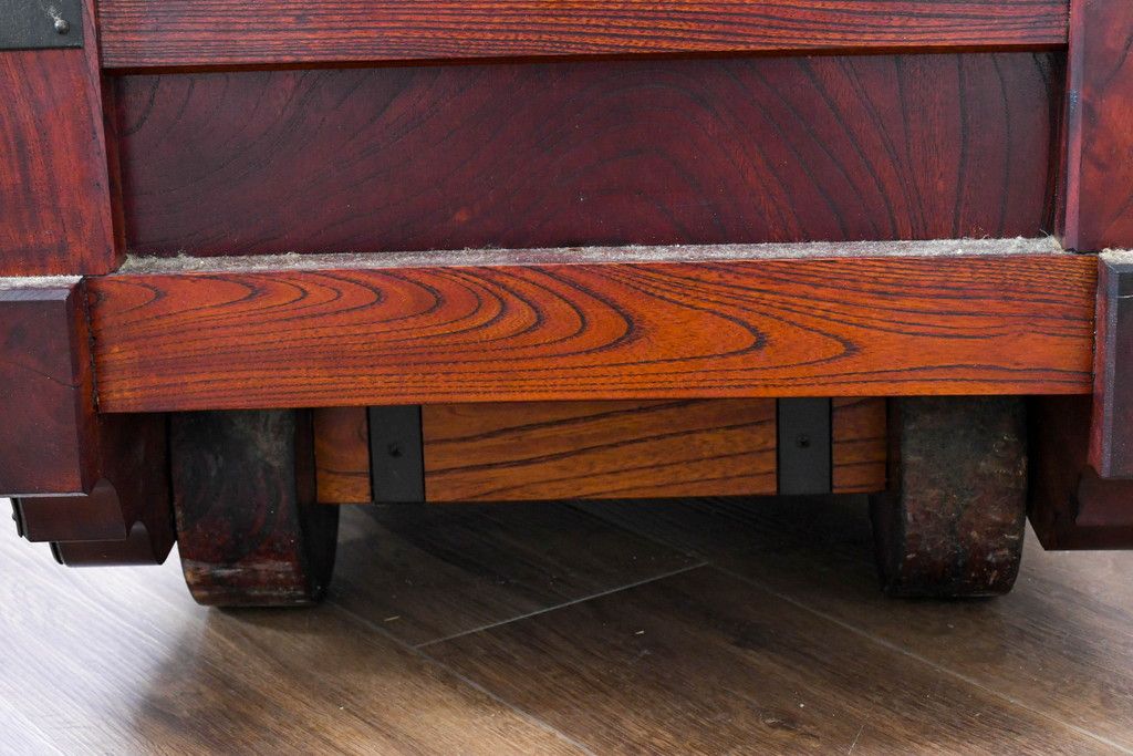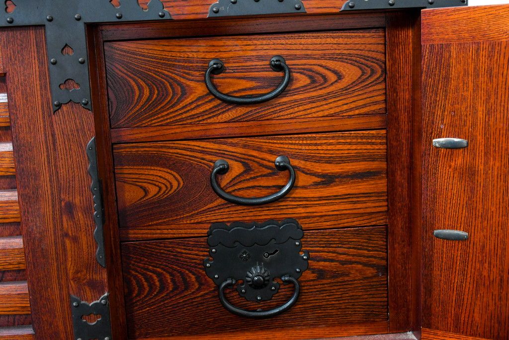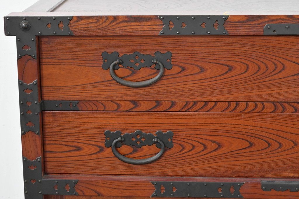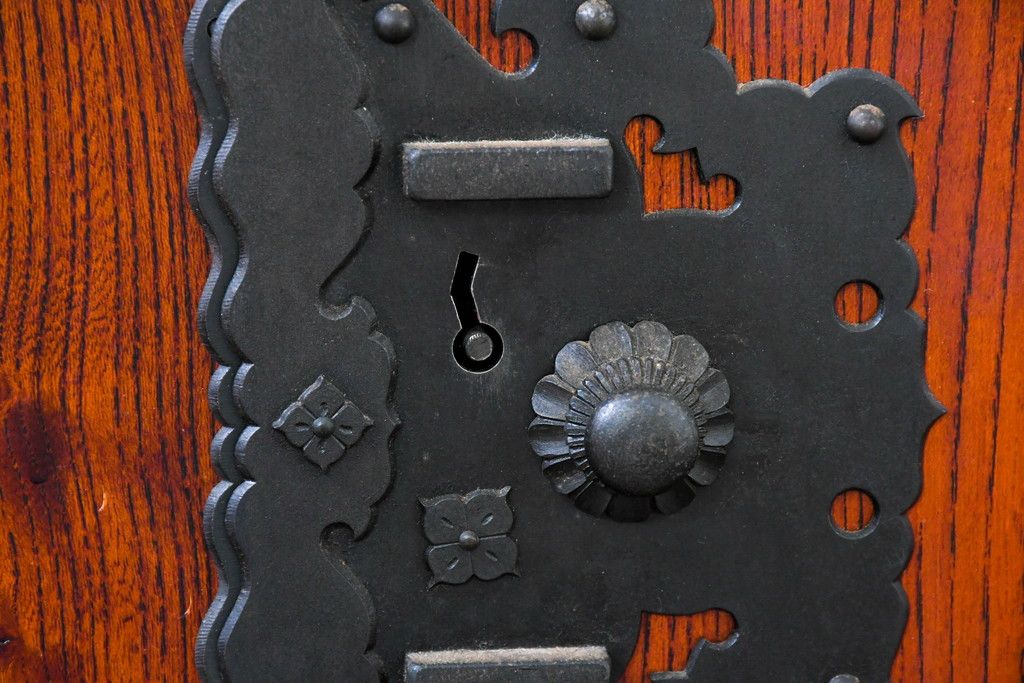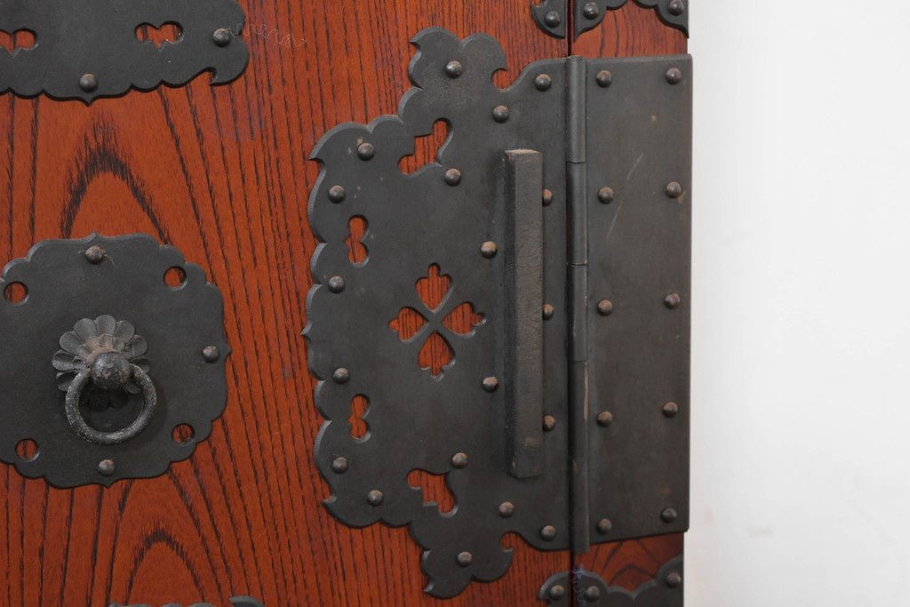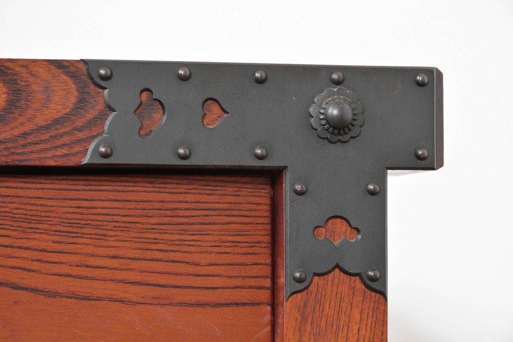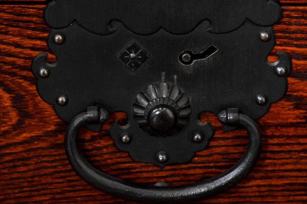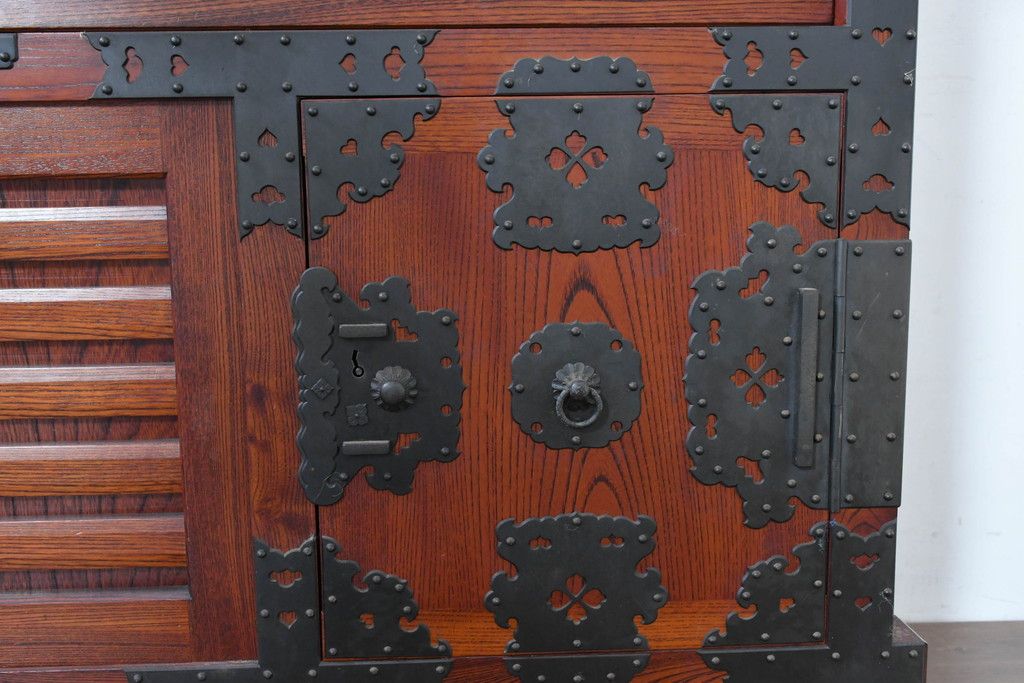 キャビネット・戸棚 > 中古 美品 高級工芸家具 閂(かんぬき)付き 職人手作り!!重厚な手打ち金具に欅(ケヤキ)の風合いと漆の艶調和が目を惹く三国デザインの車箪笥(和タンス、収納箪笥、整理箪笥、戸棚、キャビネット)(製作費推定250万円)(R-084337)