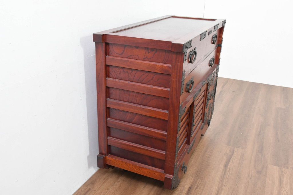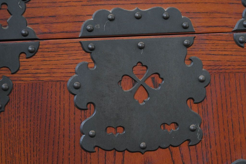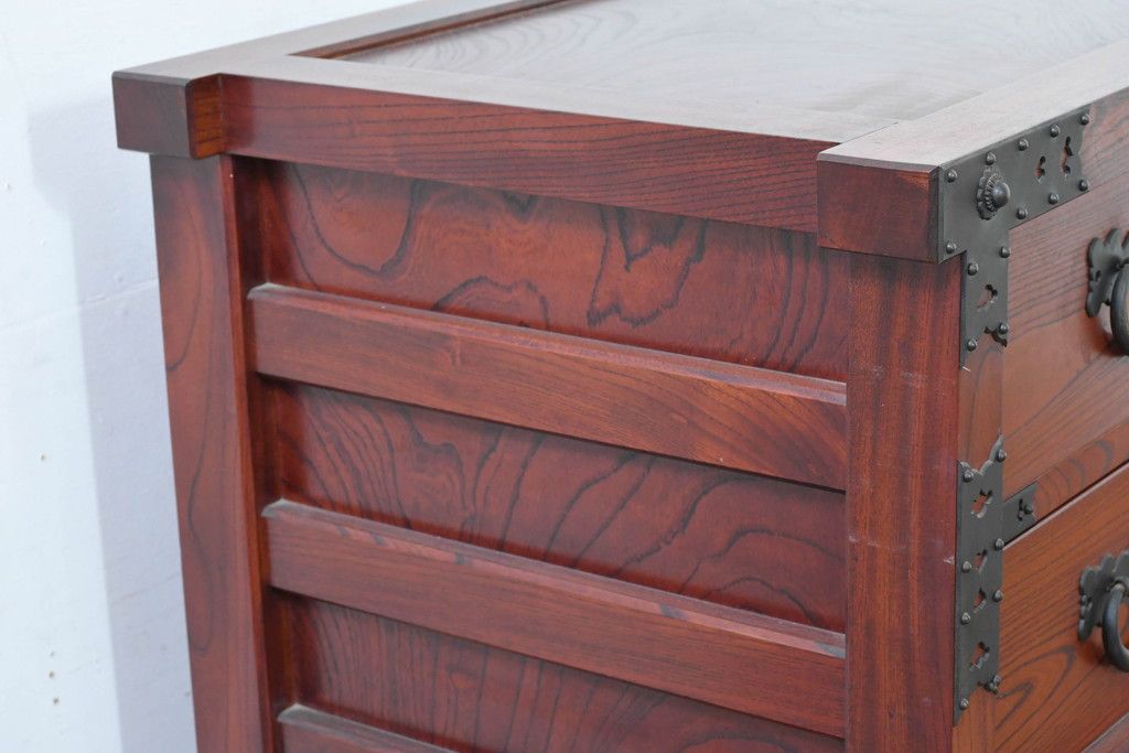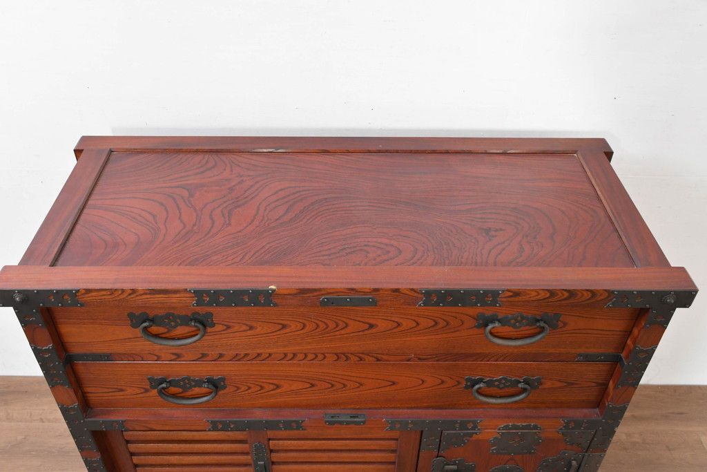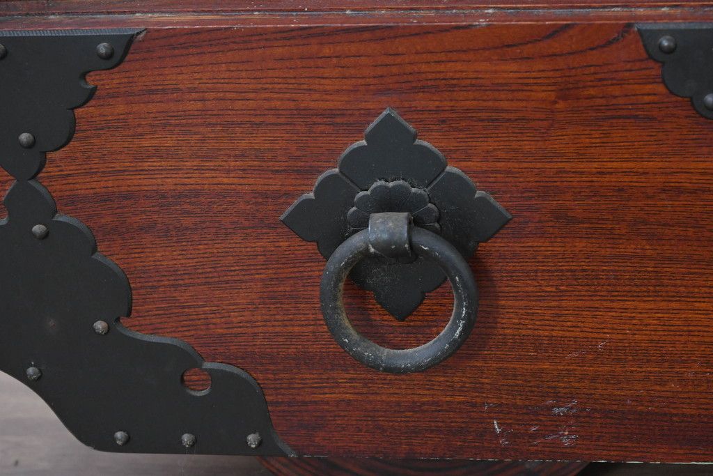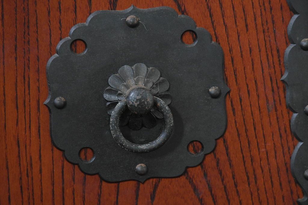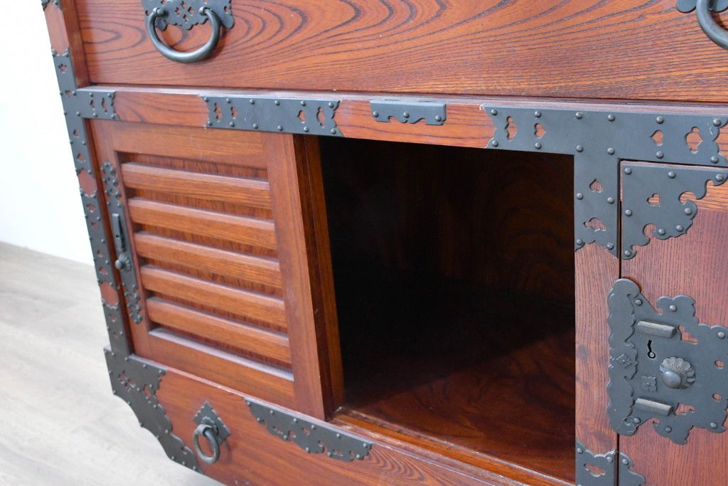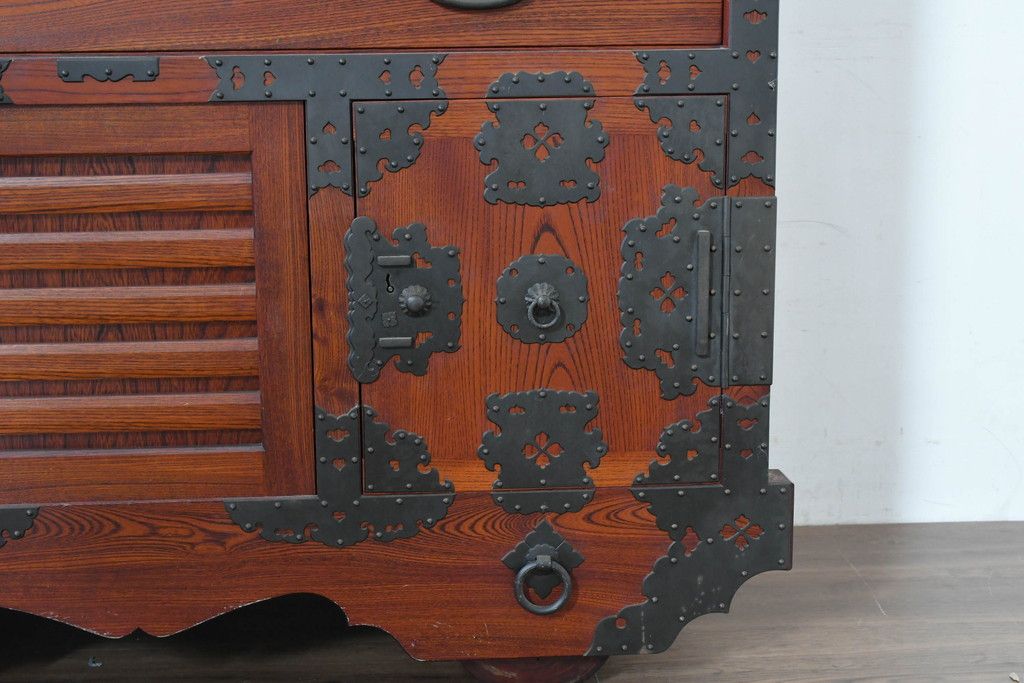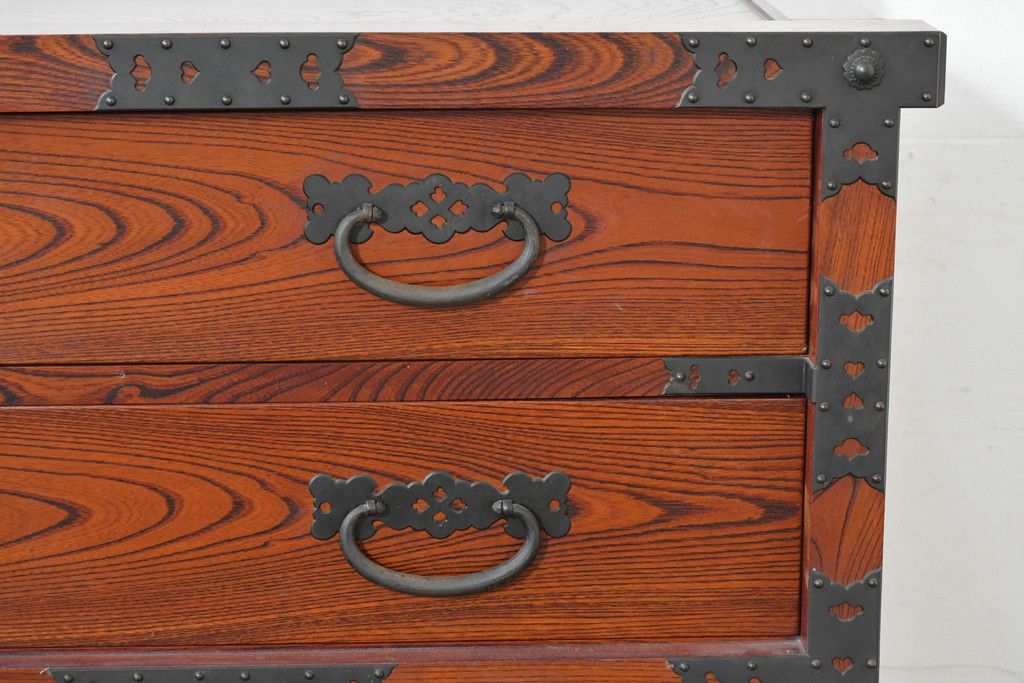 キャビネット・戸棚 > 中古 美品 高級工芸家具 閂(かんぬき)付き 職人手作り!!重厚な手打ち金具に欅(ケヤキ)の風合いと漆の艶調和が目を惹く三国デザインの車箪笥(和タンス、収納箪笥、整理箪笥、戸棚、キャビネット)(製作費推定250万円)(R-084337)