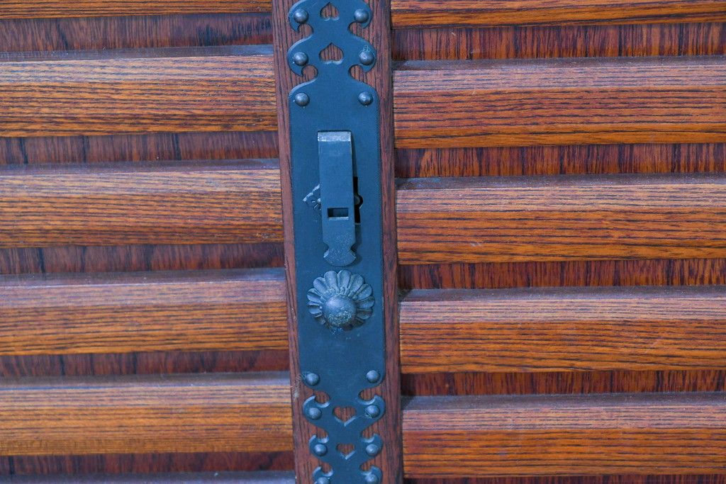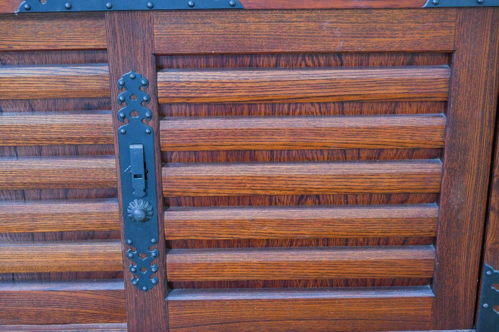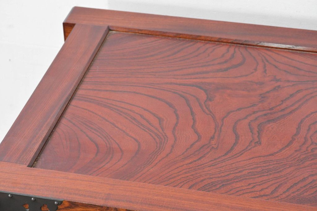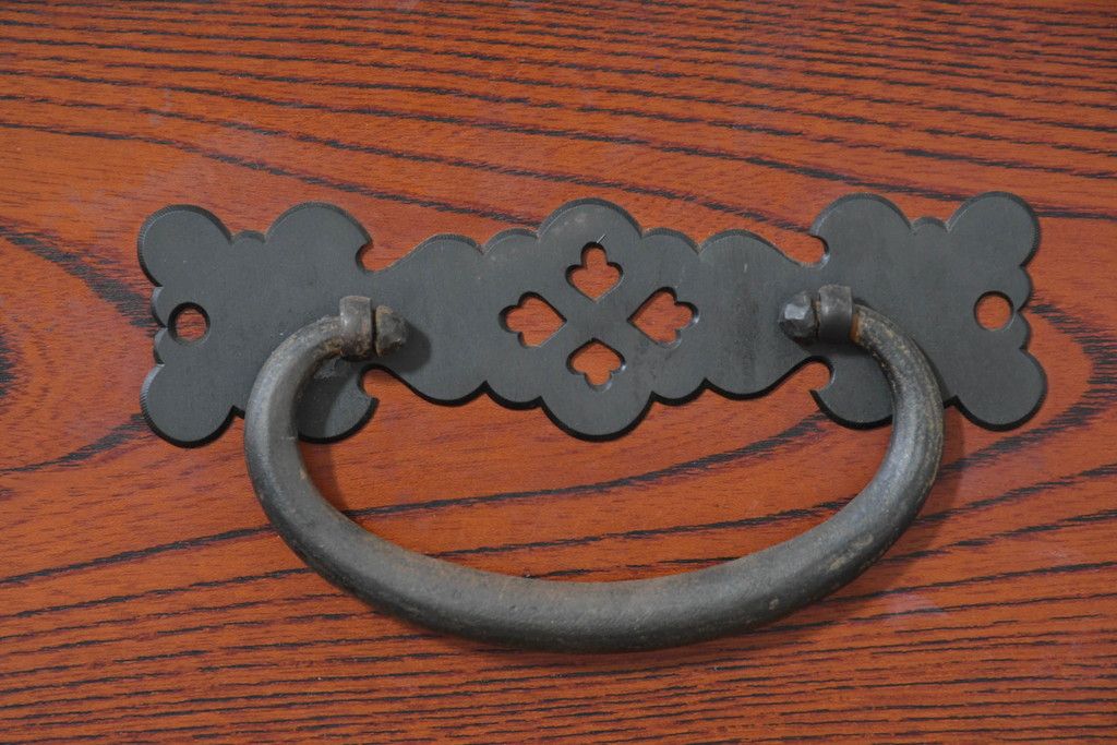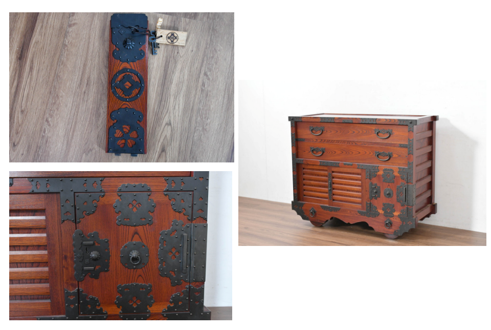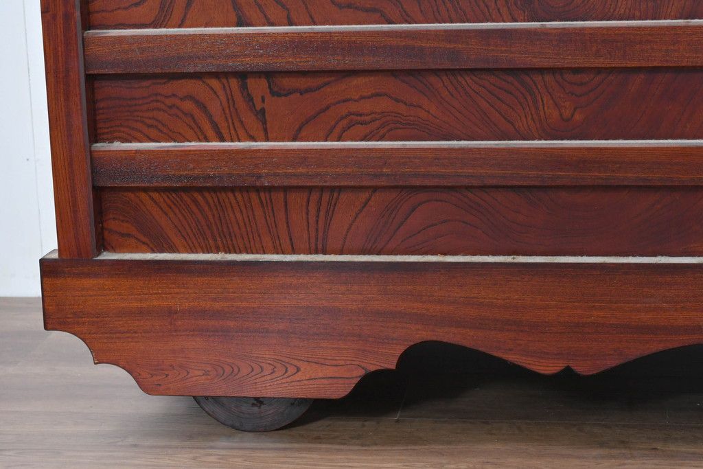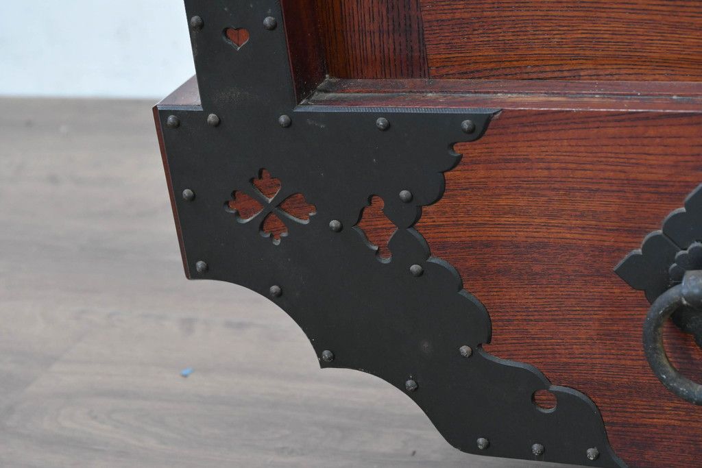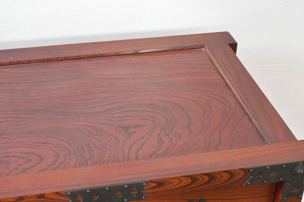 キャビネット・戸棚 > 中古 美品 高級工芸家具 閂(かんぬき)付き 職人手作り!!重厚な手打ち金具に欅(ケヤキ)の風合いと漆の艶調和が目を惹く三国デザインの車箪笥(和タンス、収納箪笥、整理箪笥、戸棚、キャビネット)(製作費推定250万円)(R-084337)