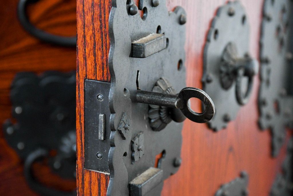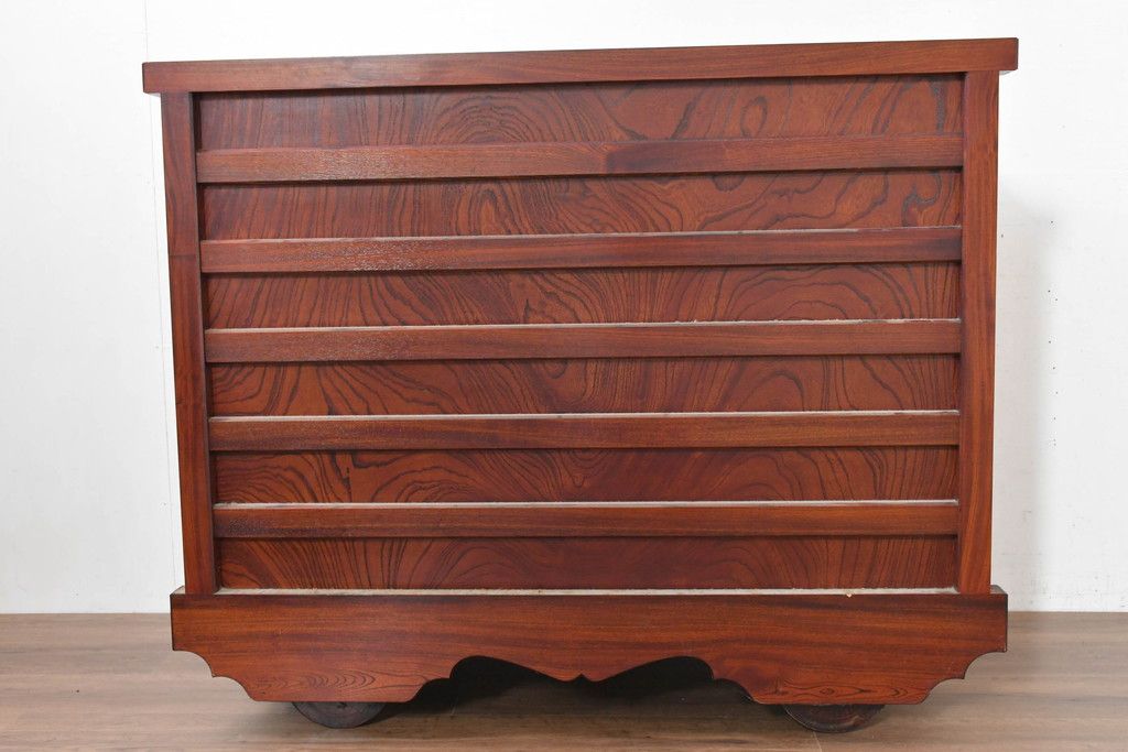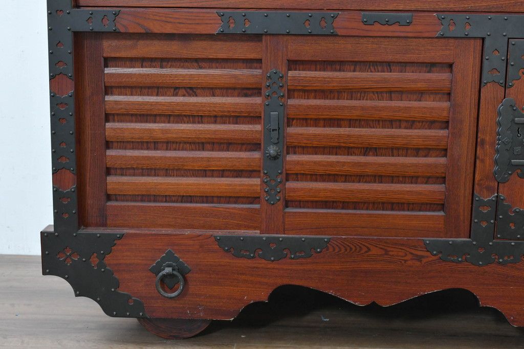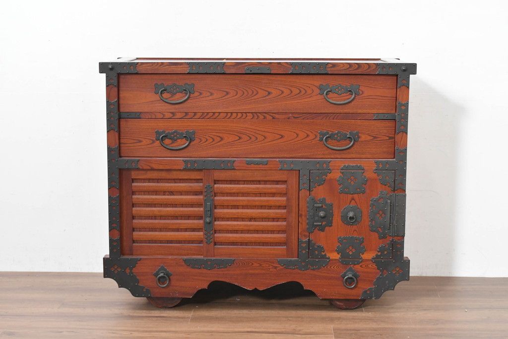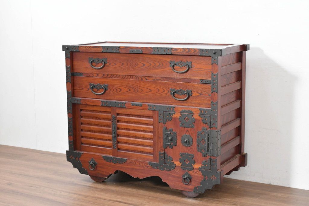 中古 美品 高級工芸家具 閂(かんぬき)付き 職人手作り!!重厚な手打ち金具に欅(ケヤキ)の風合いと漆の艶調和が目を惹く三国デザインの車箪笥(和タンス、収納箪笥、整理箪笥、戸棚、キャビネット)(製作費推定250万円)(R-084337)
