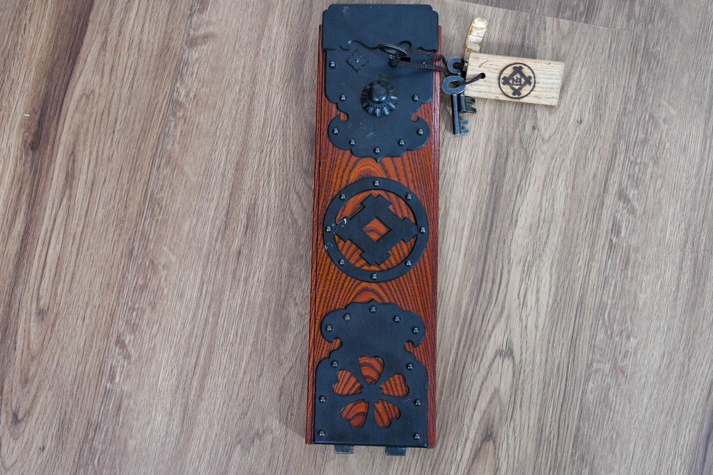 中古 美品 高級工芸家具 閂(かんぬき)付き 職人手作り!!重厚な手打ち金具に欅(ケヤキ)の風合いと漆の艶調和が目を惹く三国デザインの車箪笥(和タンス、収納箪笥、整理箪笥、戸棚、キャビネット)(製作費推定250万円)(R-084337)です。