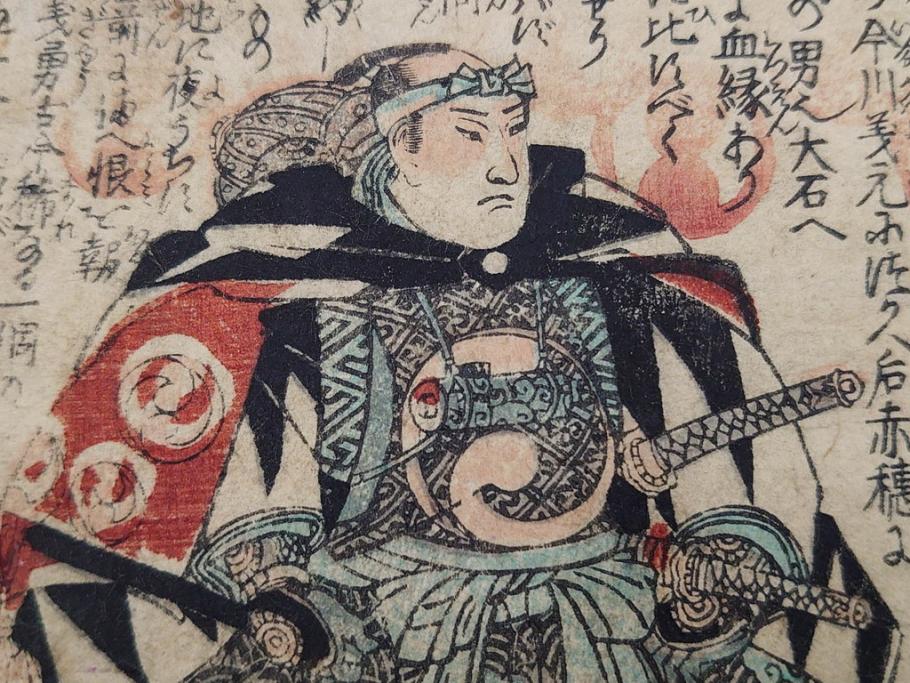 武士たちの姿が力強く表され、物語性のある構図と柔らかな色調が時代の空気を伝えます。