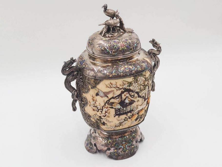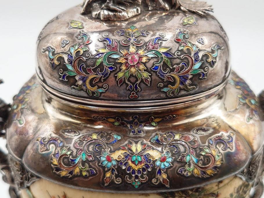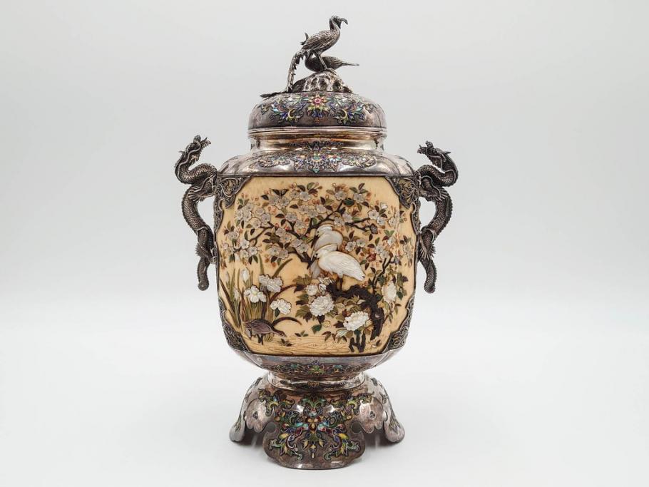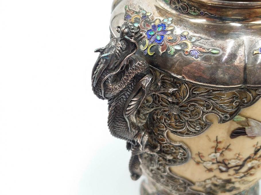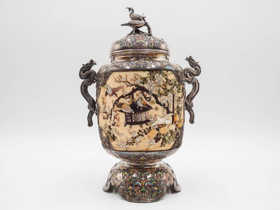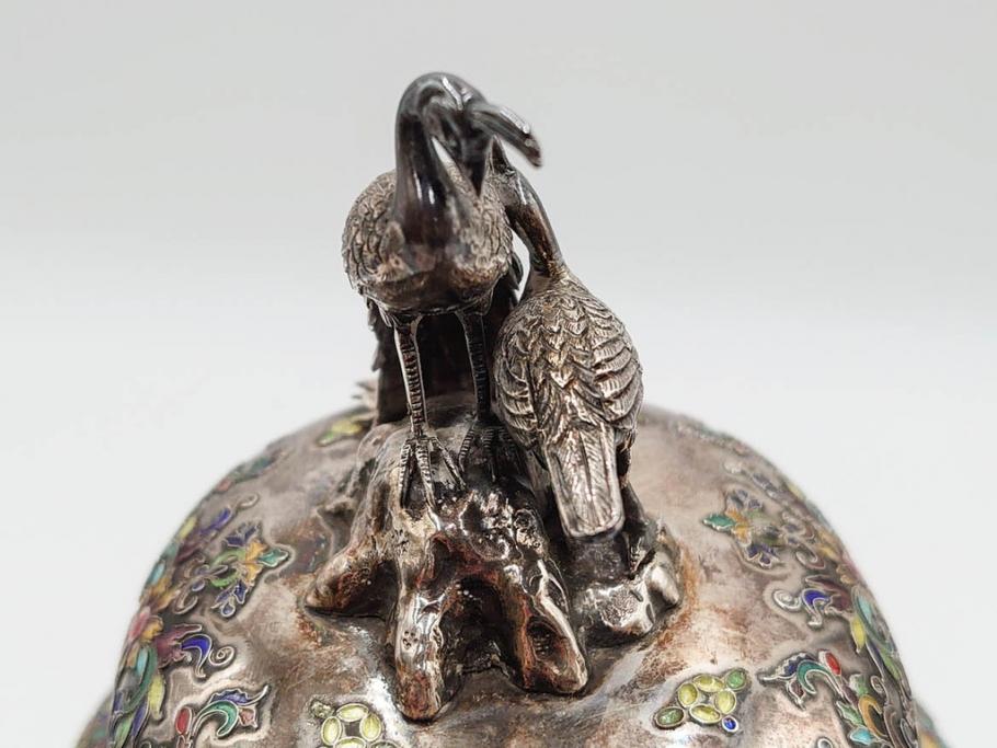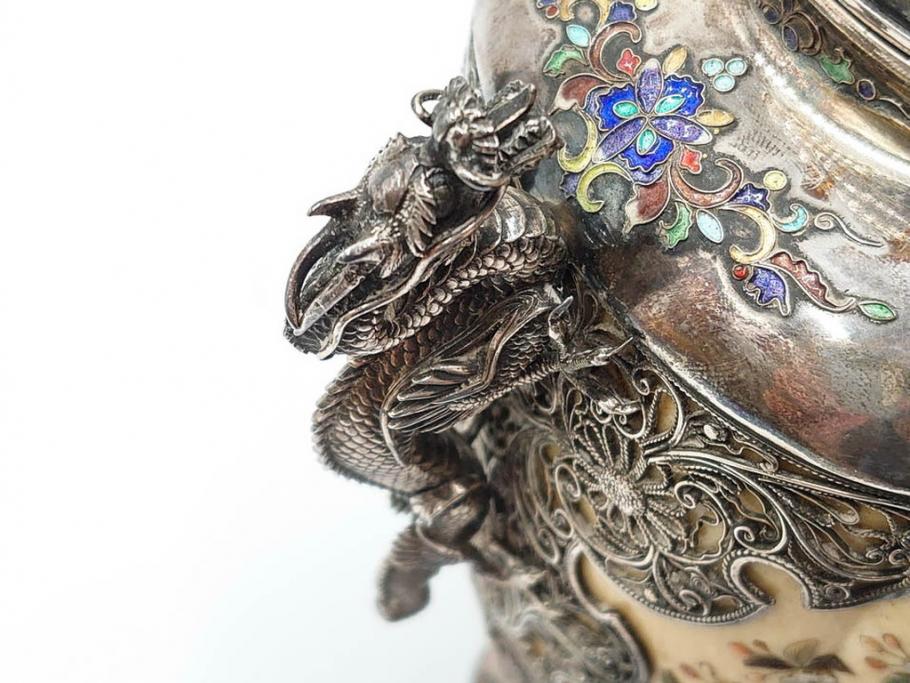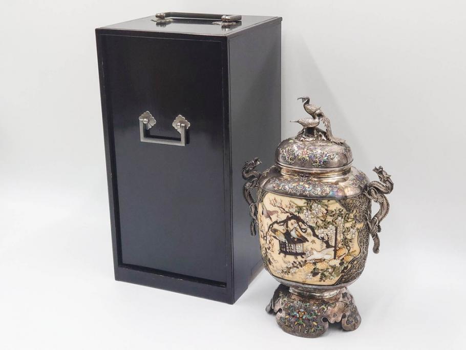 ラフジュ工房> 和食器・茶道具> 茶道具・鉄瓶 > 明治期 芝山象嵌 花鳥図 双龍耳 一琴刻 螺鈿 純銀 七宝 共箱 精緻な職人技と芸術性が融合した見事な香炉(芝山細工、彫刻、香爐、仏具、茶道具)(R-084370)
