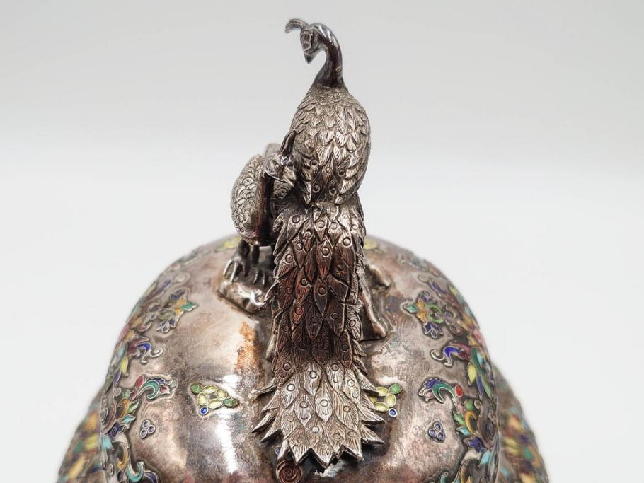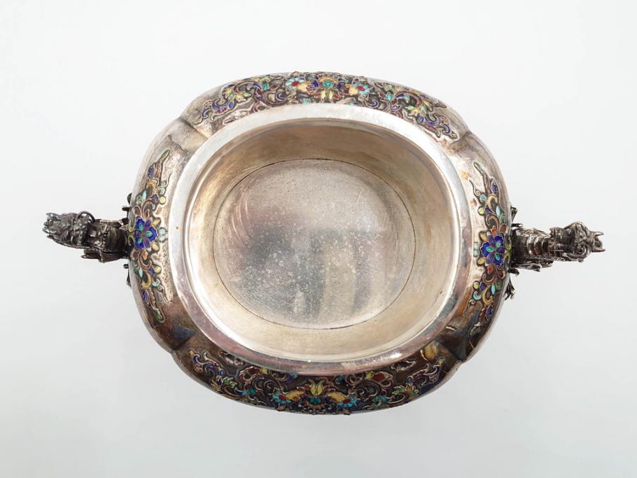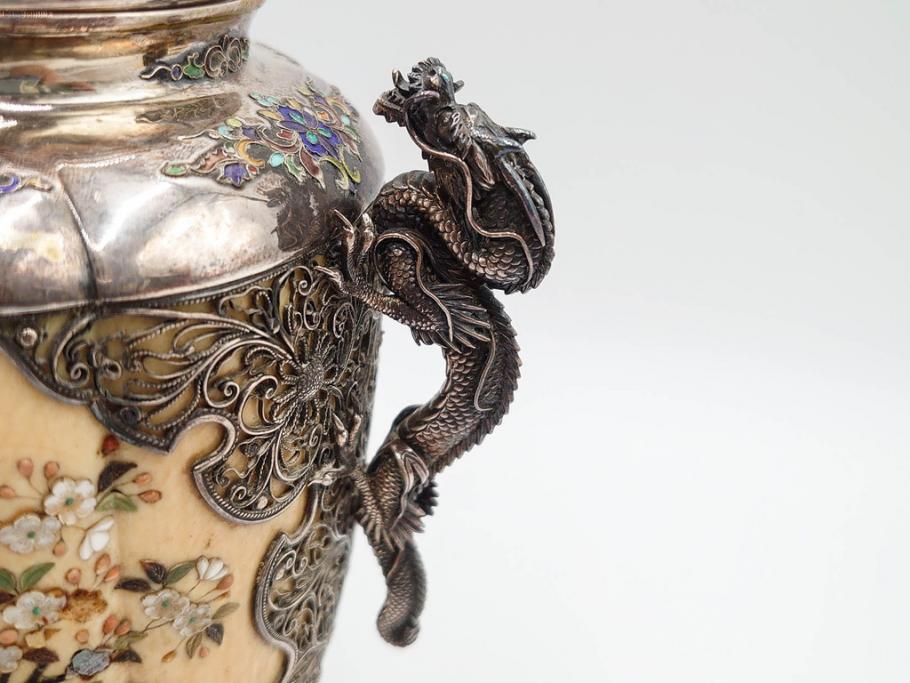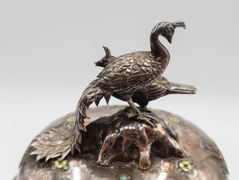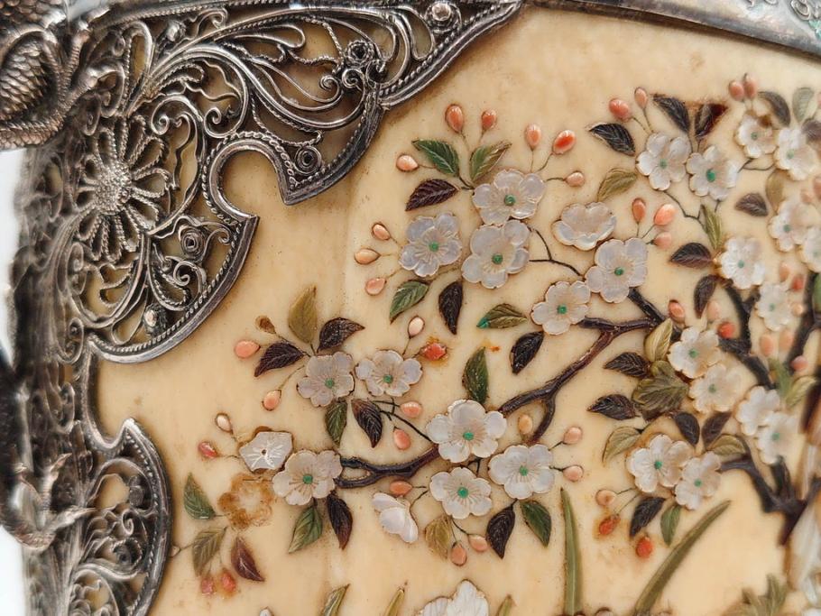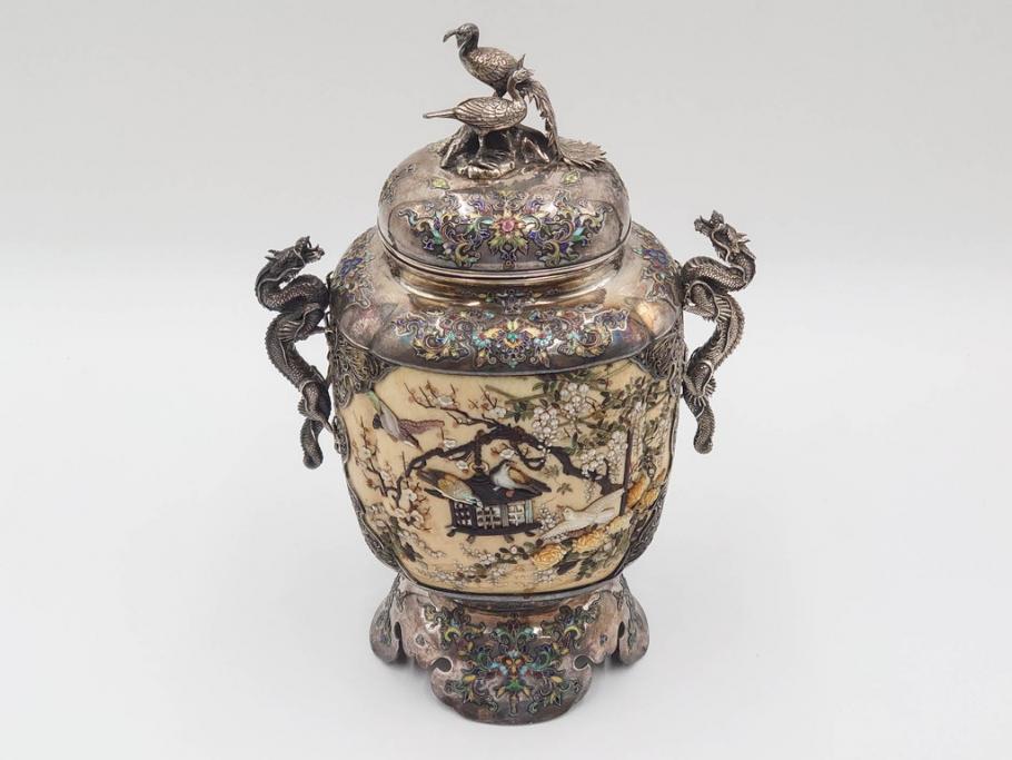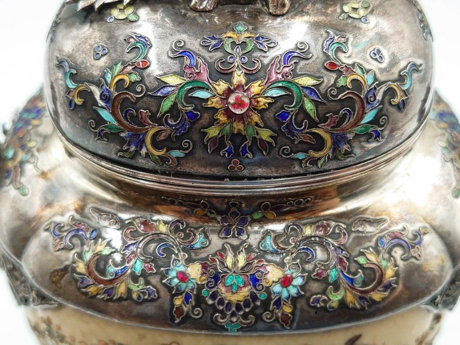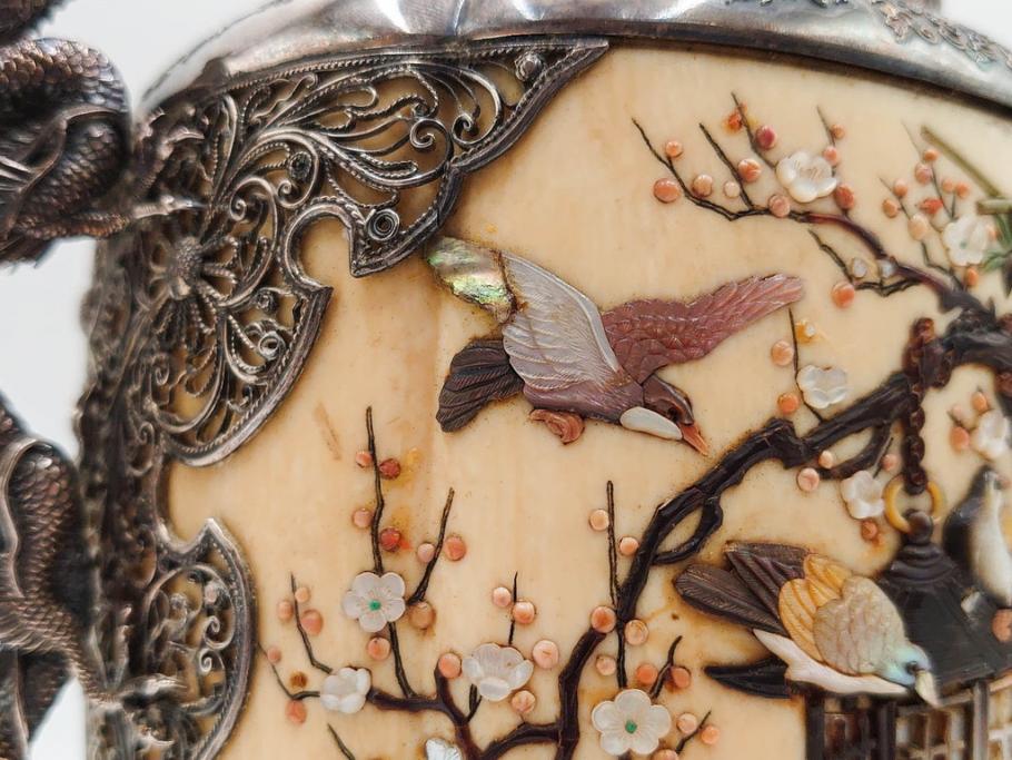 ラフジュ工房> 和食器・茶道具> 茶道具・鉄瓶 > 明治期 芝山象嵌 花鳥図 双龍耳 一琴刻 螺鈿 純銀 七宝 共箱 精緻な職人技と芸術性が融合した見事な香炉(芝山細工、彫刻、香爐、仏具、茶道具)(R-084370)