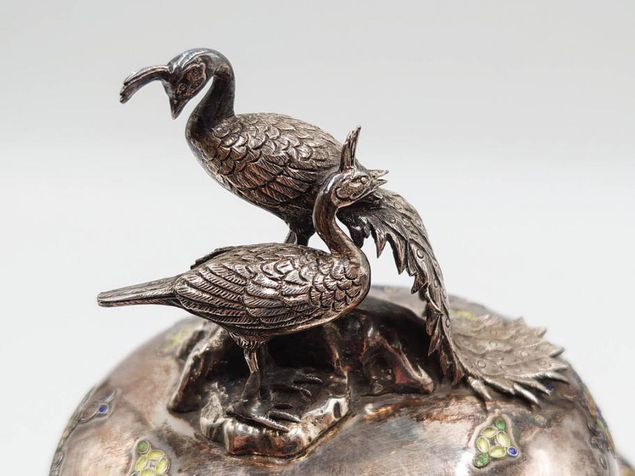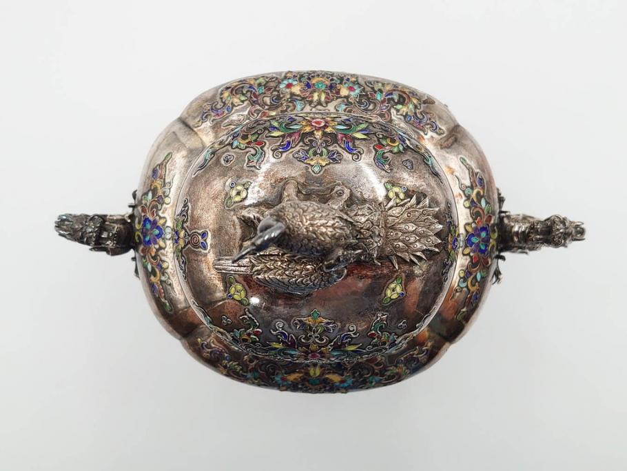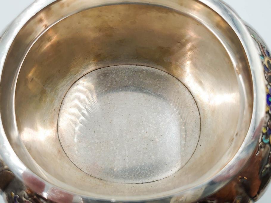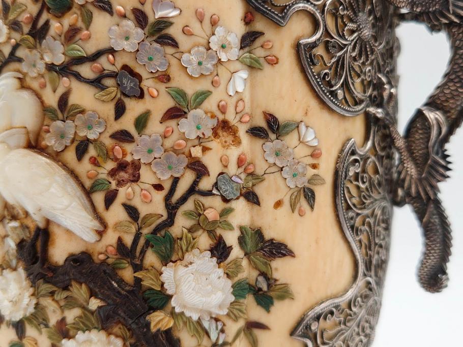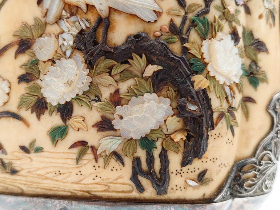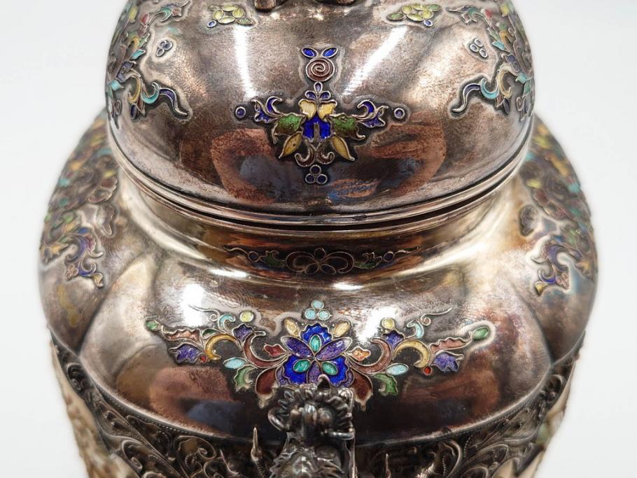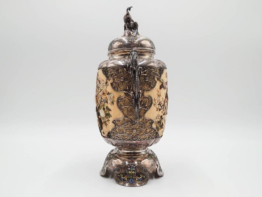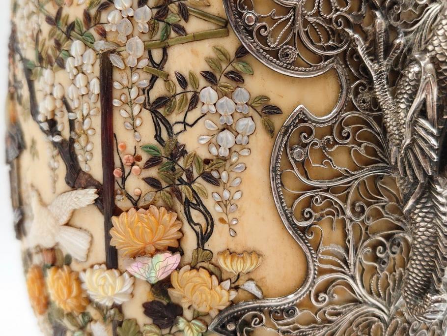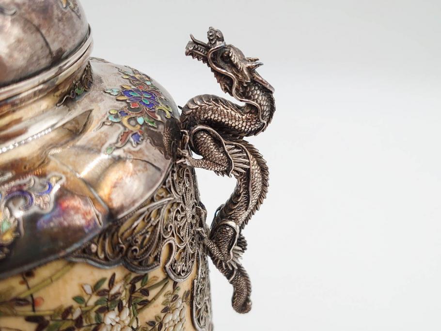 ラフジュ工房> 和食器・茶道具> 茶道具・鉄瓶 > 明治期 芝山象嵌 花鳥図 双龍耳 一琴刻 螺鈿 純銀 七宝 共箱 精緻な職人技と芸術性が融合した見事な香炉(芝山細工、彫刻、香爐、仏具、茶道具)(R-084370)
