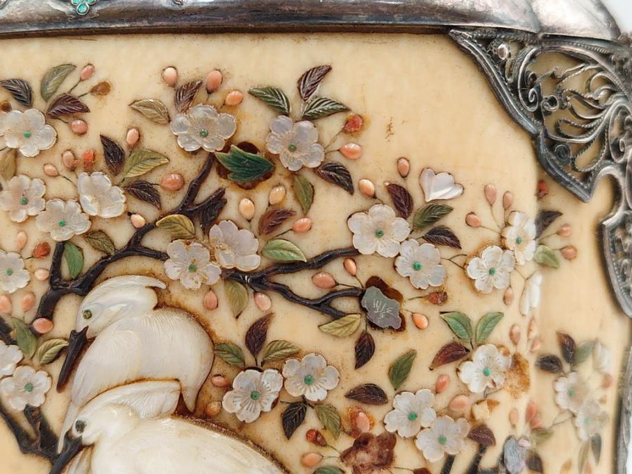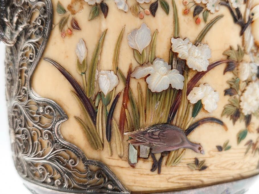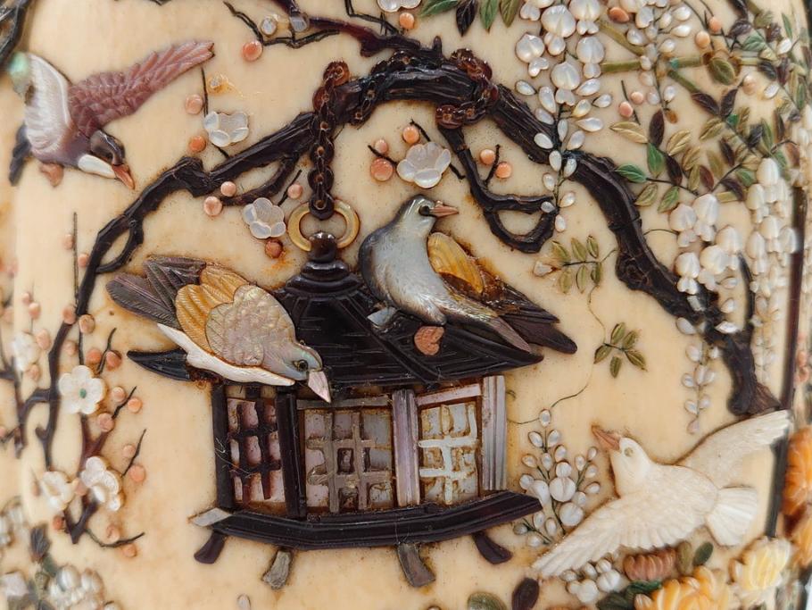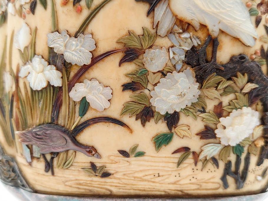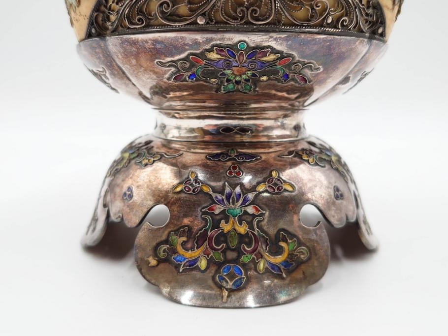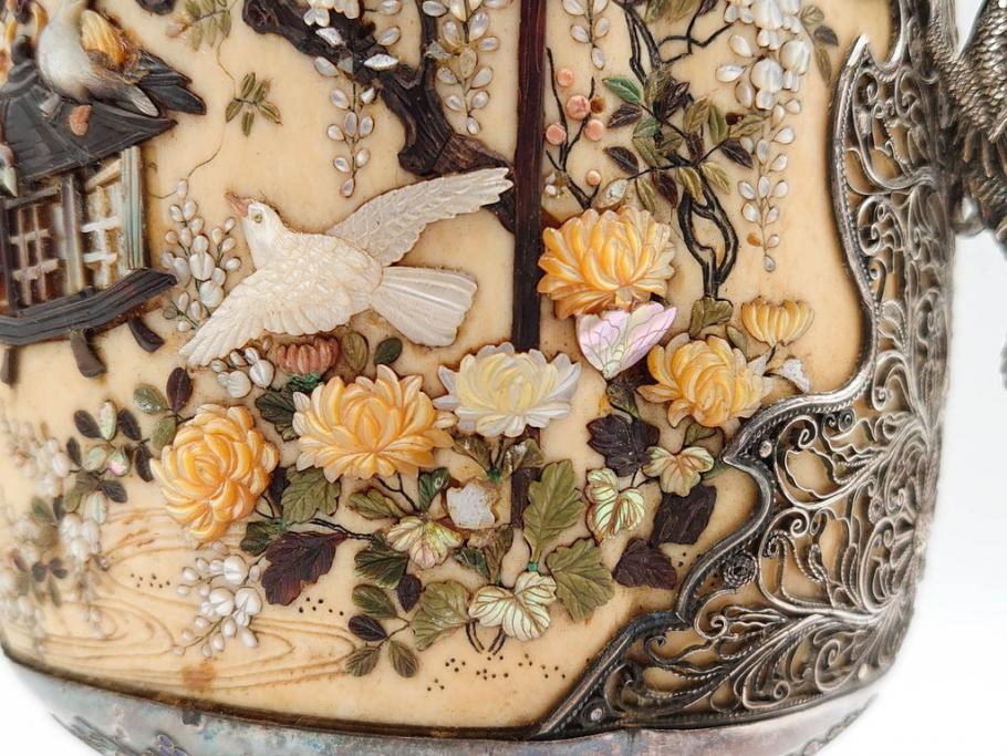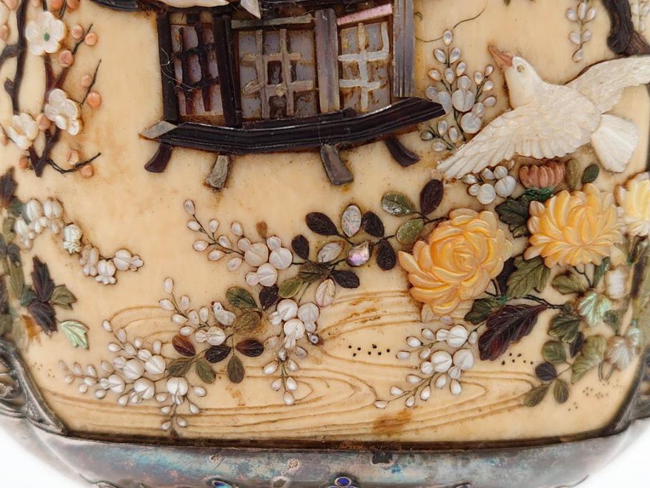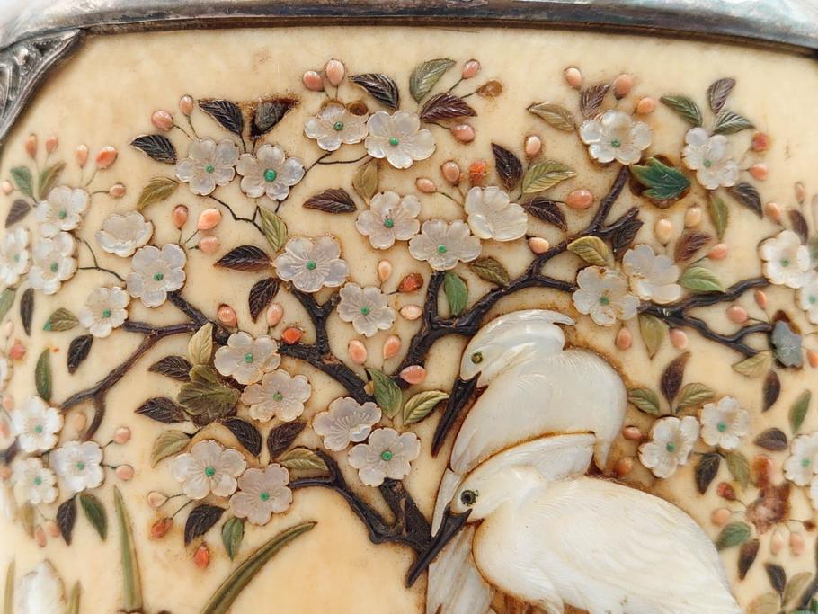 ラフジュ工房> 和食器・茶道具> 茶道具・鉄瓶 > 明治期 芝山象嵌 花鳥図 双龍耳 一琴刻 螺鈿 純銀 七宝 共箱 精緻な職人技と芸術性が融合した見事な香炉(芝山細工、彫刻、香爐、仏具、茶道具)(R-084370)