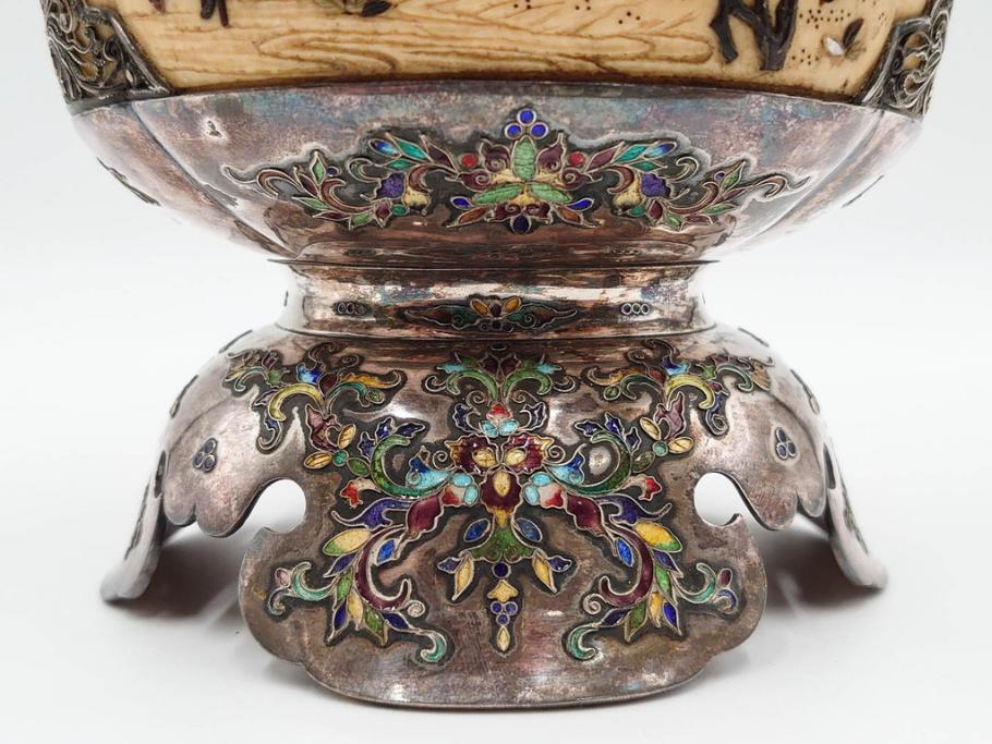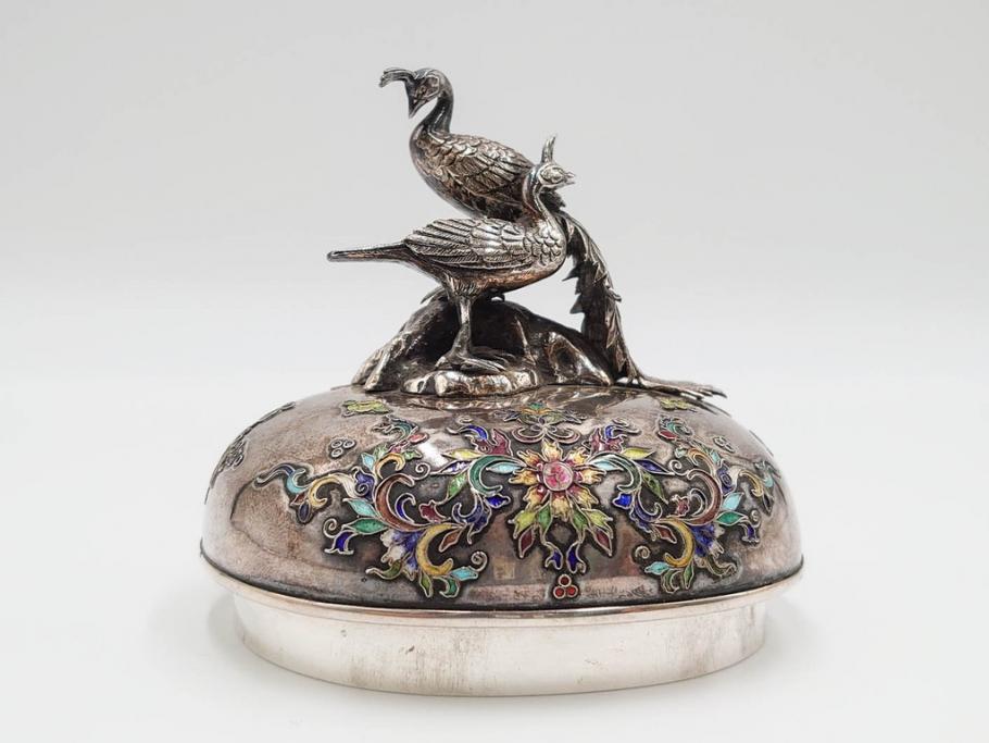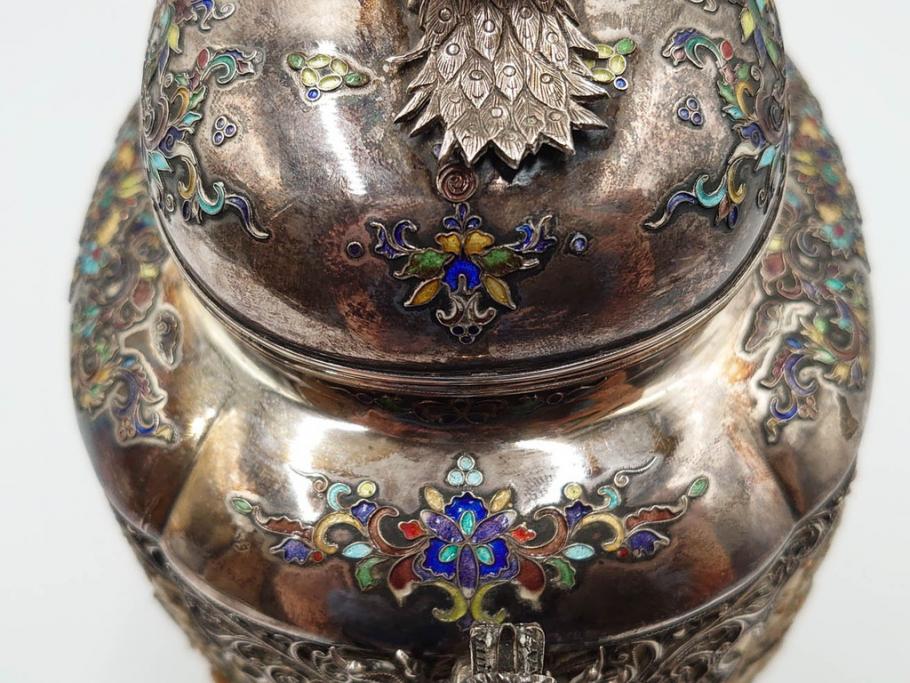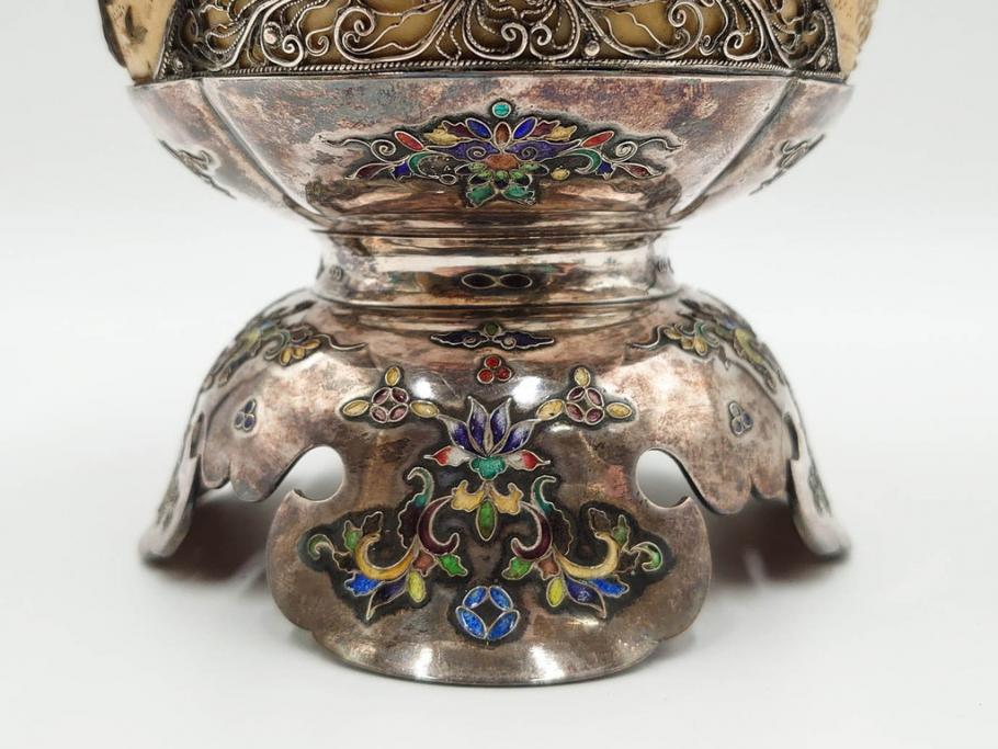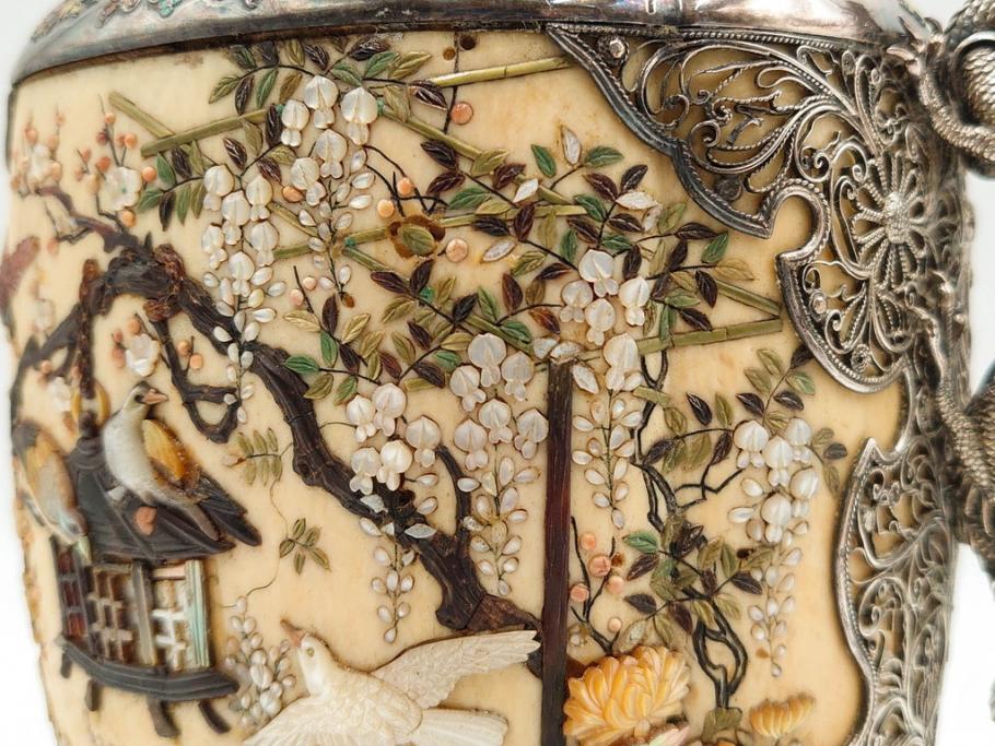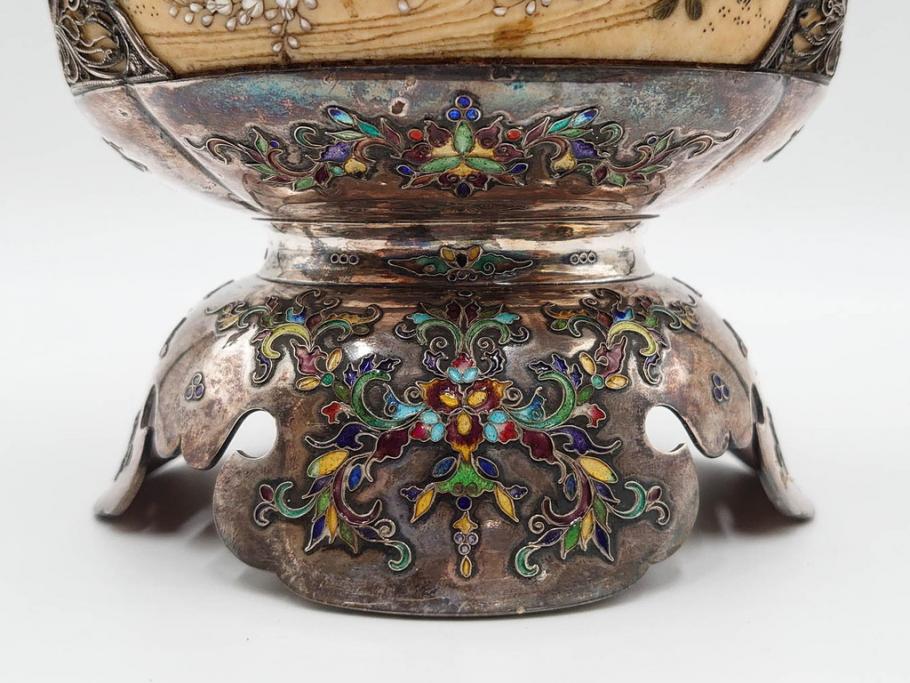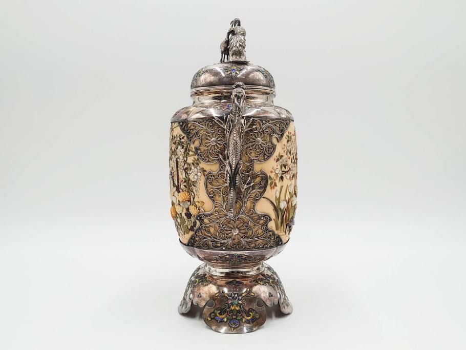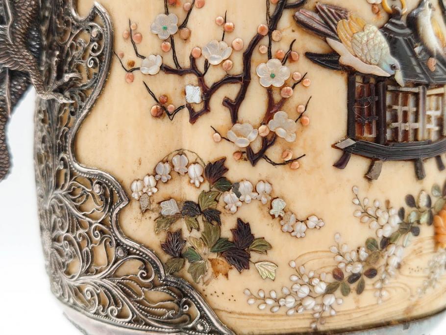 ラフジュ工房> 和食器・茶道具> 茶道具・鉄瓶 > 明治期 芝山象嵌 花鳥図 双龍耳 一琴刻 螺鈿 純銀 七宝 共箱 精緻な職人技と芸術性が融合した見事な香炉(芝山細工、彫刻、香爐、仏具、茶道具)(R-084370)