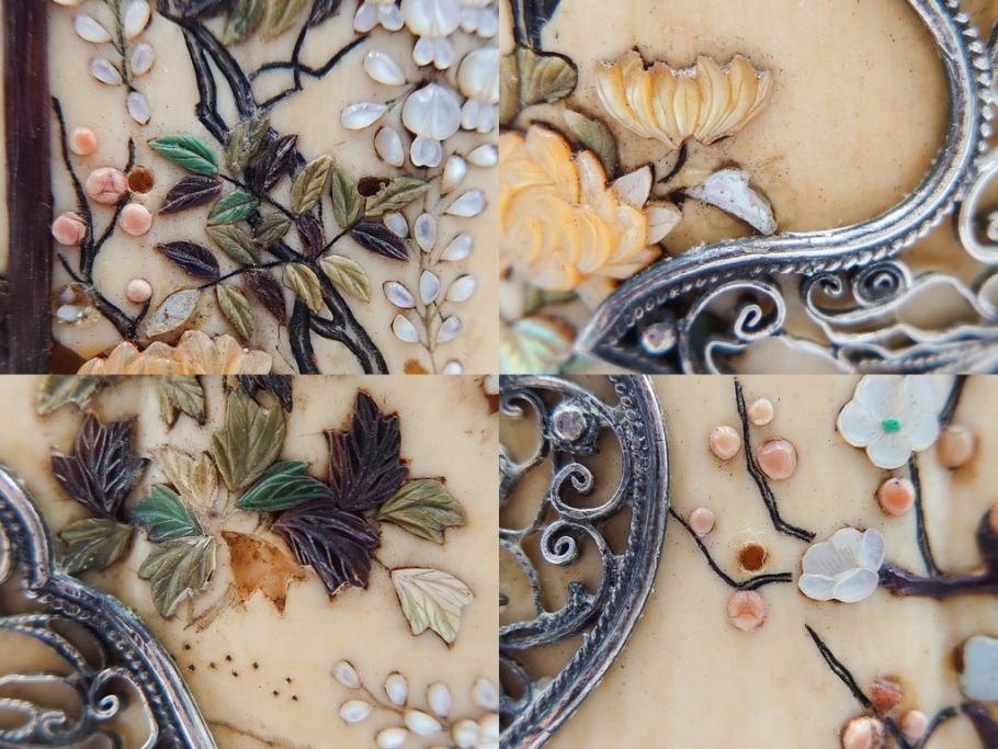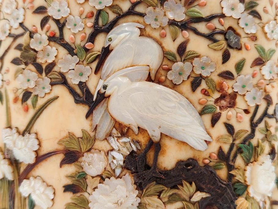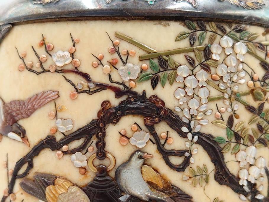 明治期 芝山象嵌 花鳥図 双龍耳 一琴刻 螺鈿 純銀 七宝 共箱 精緻な職人技と芸術性が融合した見事な香炉(芝山細工、彫刻、香爐、仏具、茶道具)(R-084370)