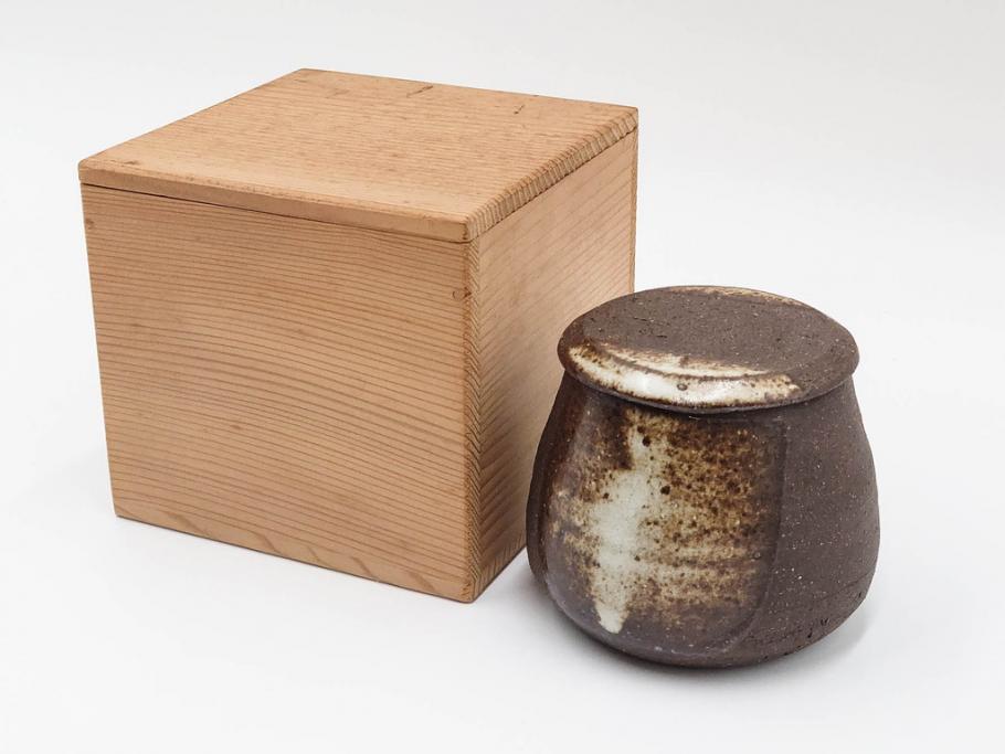 1981年作 ジャネット・リーチ(Janet Leach) バーナード・リーチ夫人 2.8寸 手作りの温かみを感じさせる素朴な風合いが魅力の蓋物(J・L、蓋付き器、小物入れ、香合、調味料入れ、菓子鉢、茶壷、共箱付、二寸八分)(R-084378)