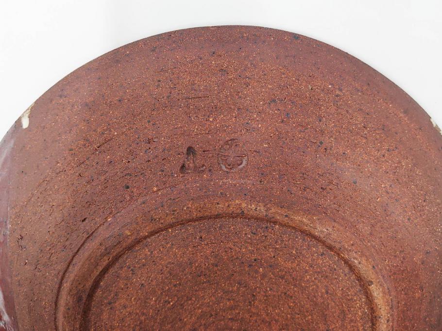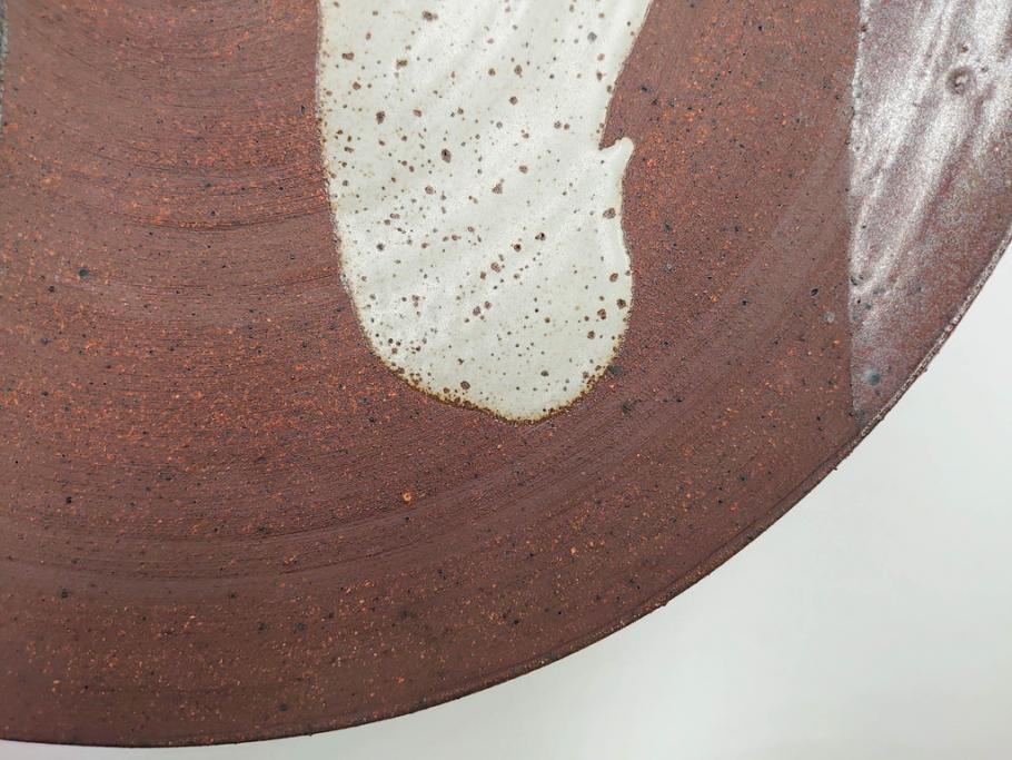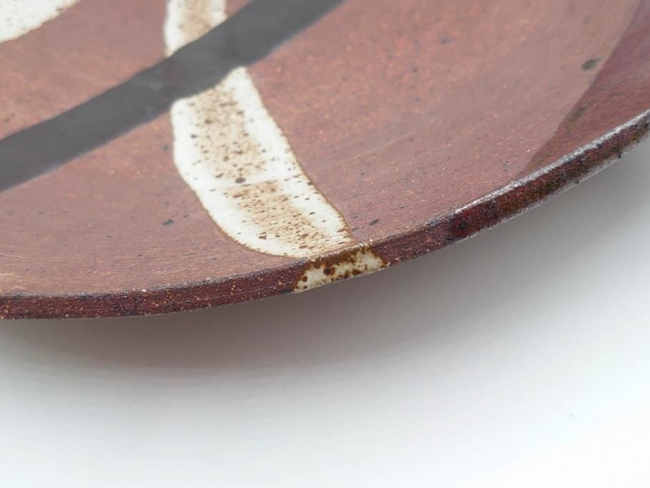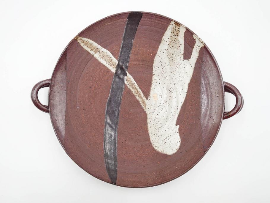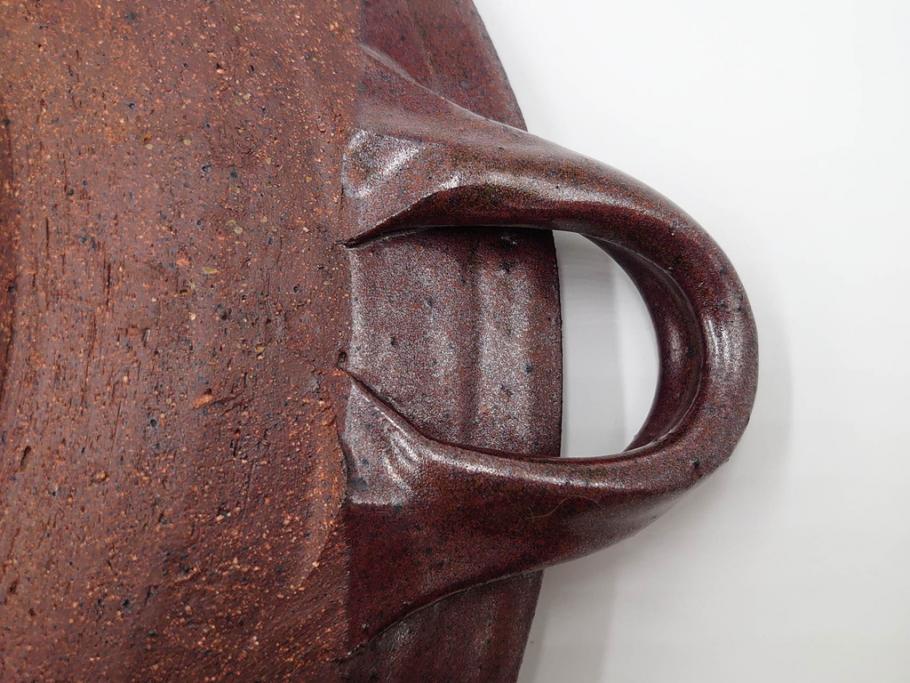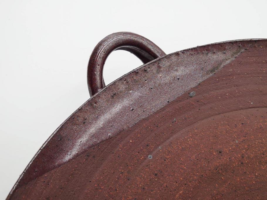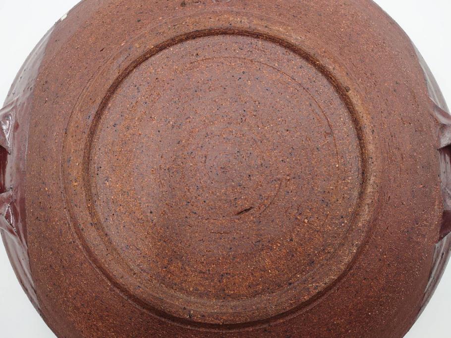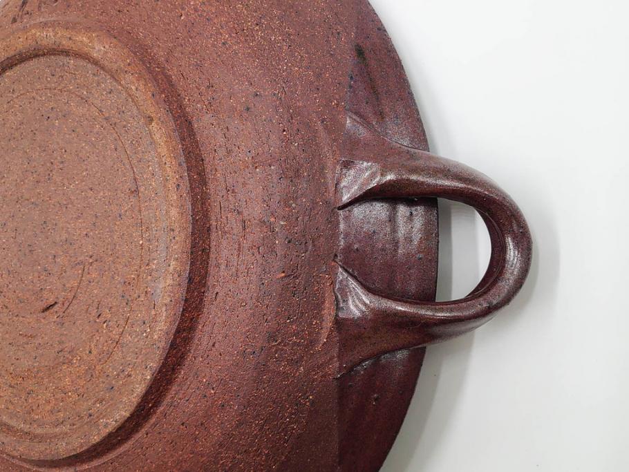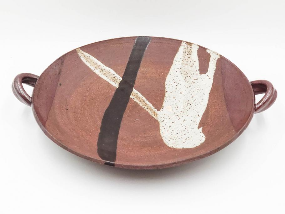 ラフジュ工房> 和食器・茶道具> 皿 > 1981年作 ジャネット・リーチ(Janet Leach) 取っ手付 赤地流釉 バーナード・リーチ夫人 約39cm 趣ある大皿(J・L、陶器、共箱付)(R-084379)