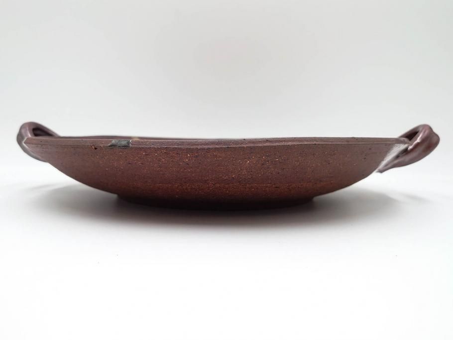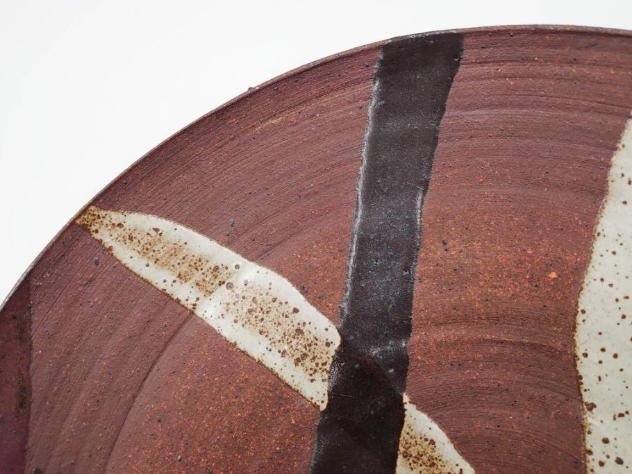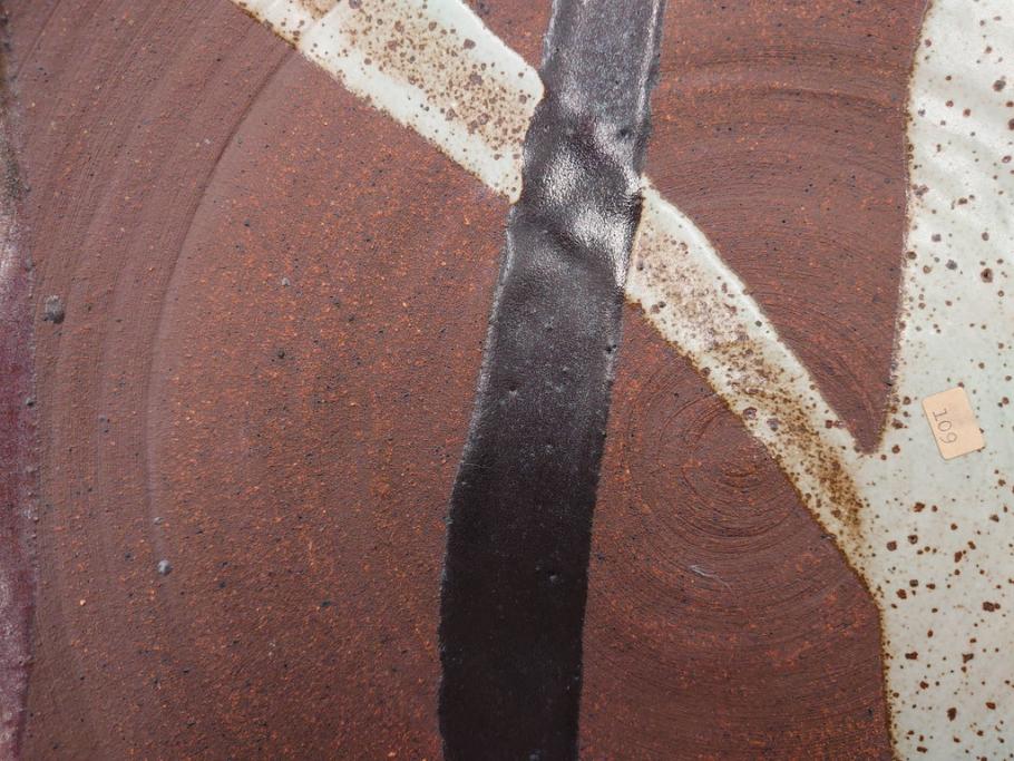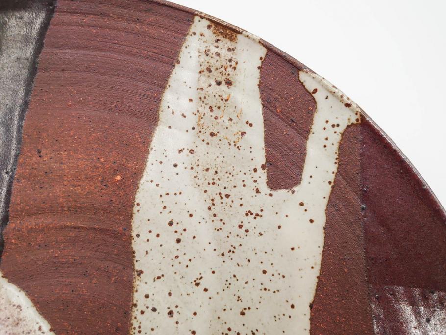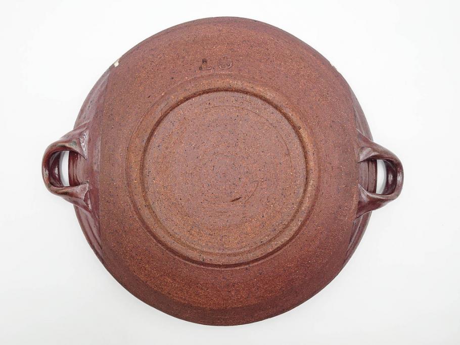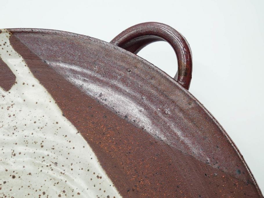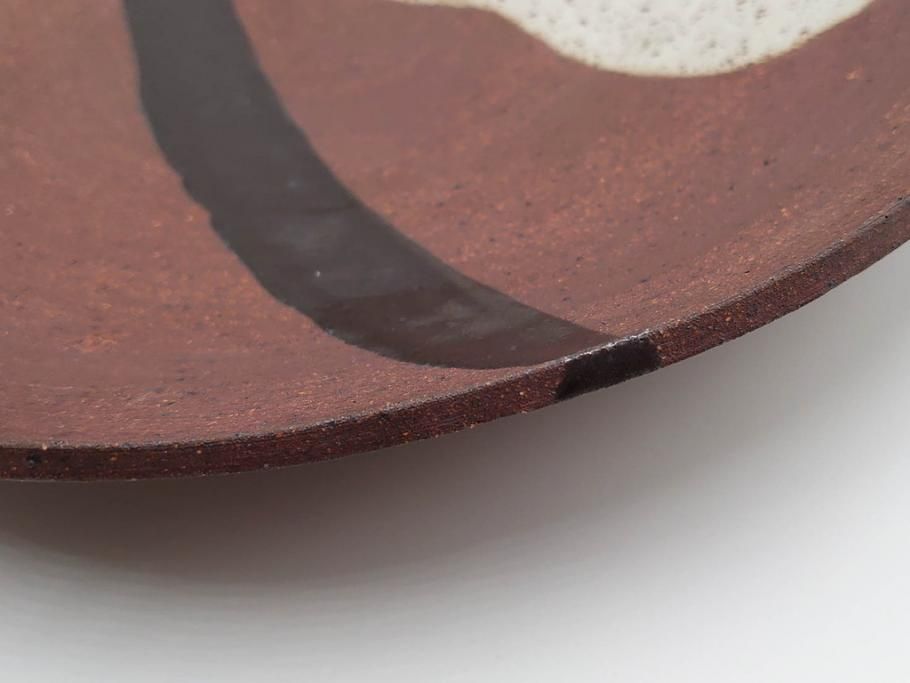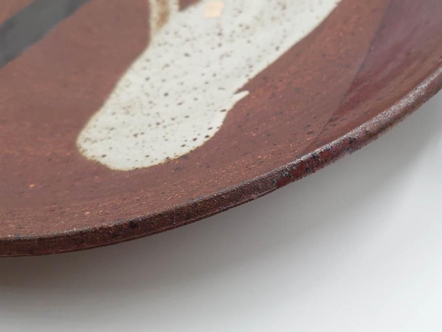 ラフジュ工房> 和食器・茶道具> 皿 > 1981年作 ジャネット・リーチ(Janet Leach) 取っ手付 赤地流釉 バーナード・リーチ夫人 約39cm 趣ある大皿(J・L、陶器、共箱付)(R-084379)