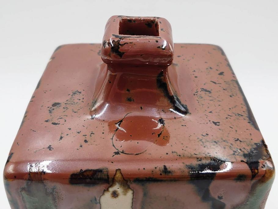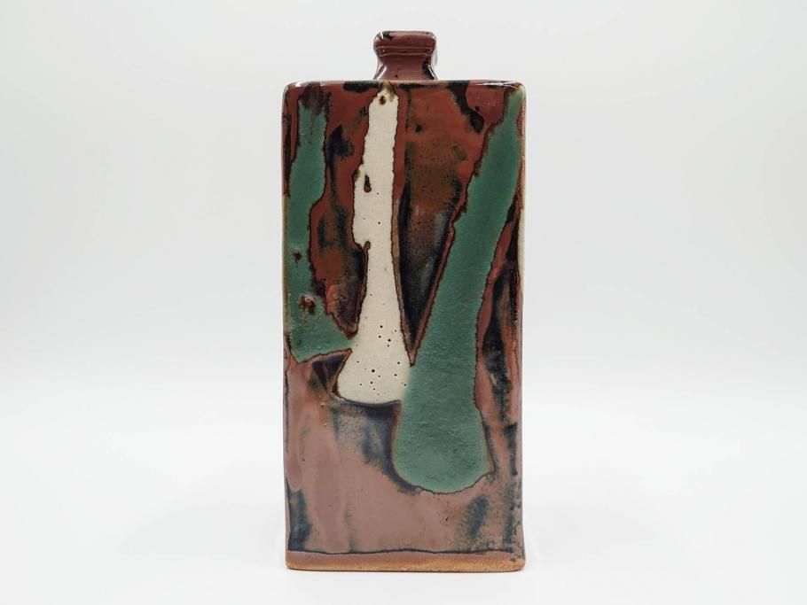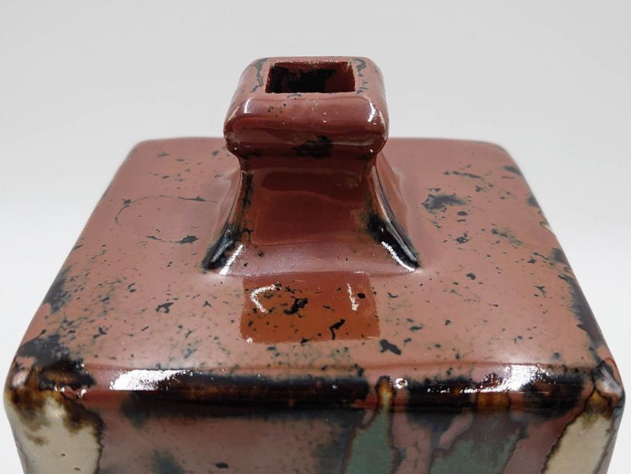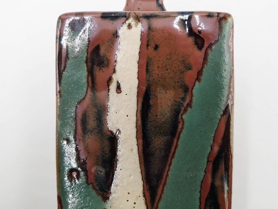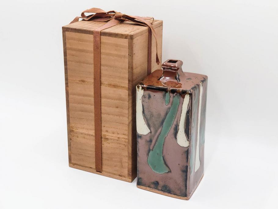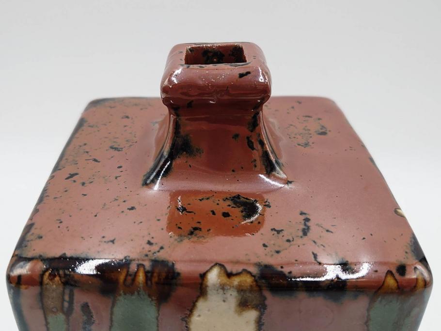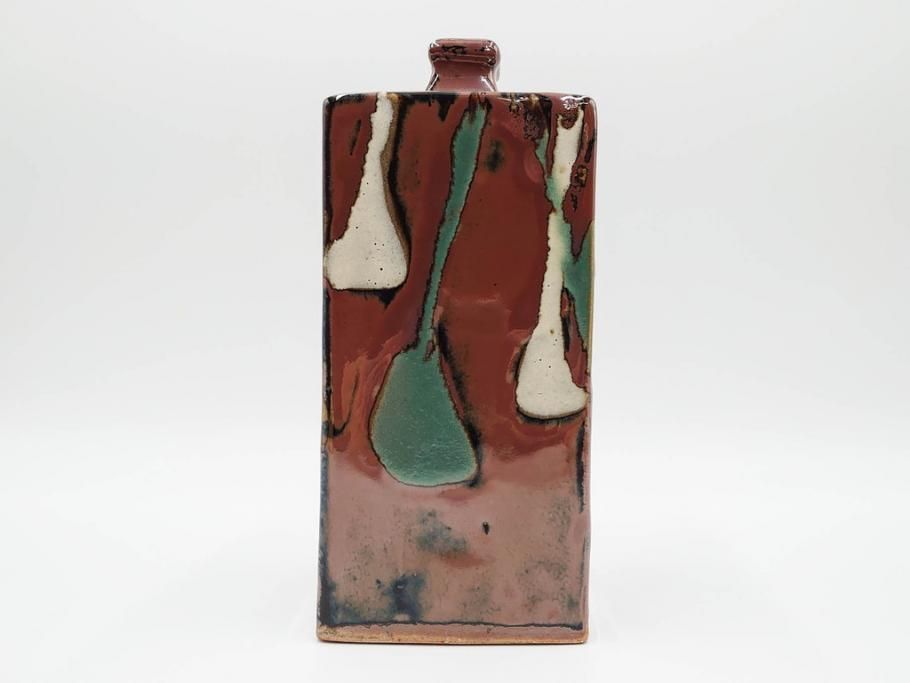 ラフジュ工房> 骨董・美術品> 骨董-陶磁器 > 人間国宝 濱田庄司(浜田庄司) 益子焼 柿釉青流 空間に奥行きと趣を与える角瓶(花瓶、花生、花入、花器、フラワーベース、壺、壷、共箱付)(R-084380)