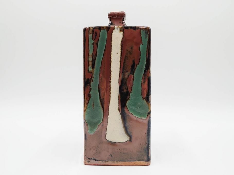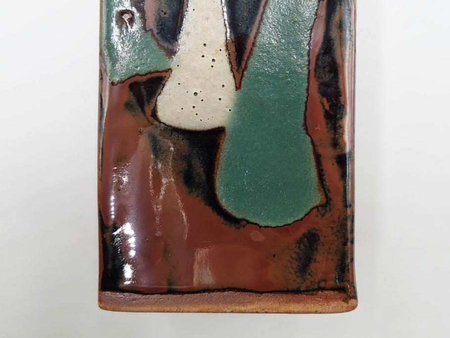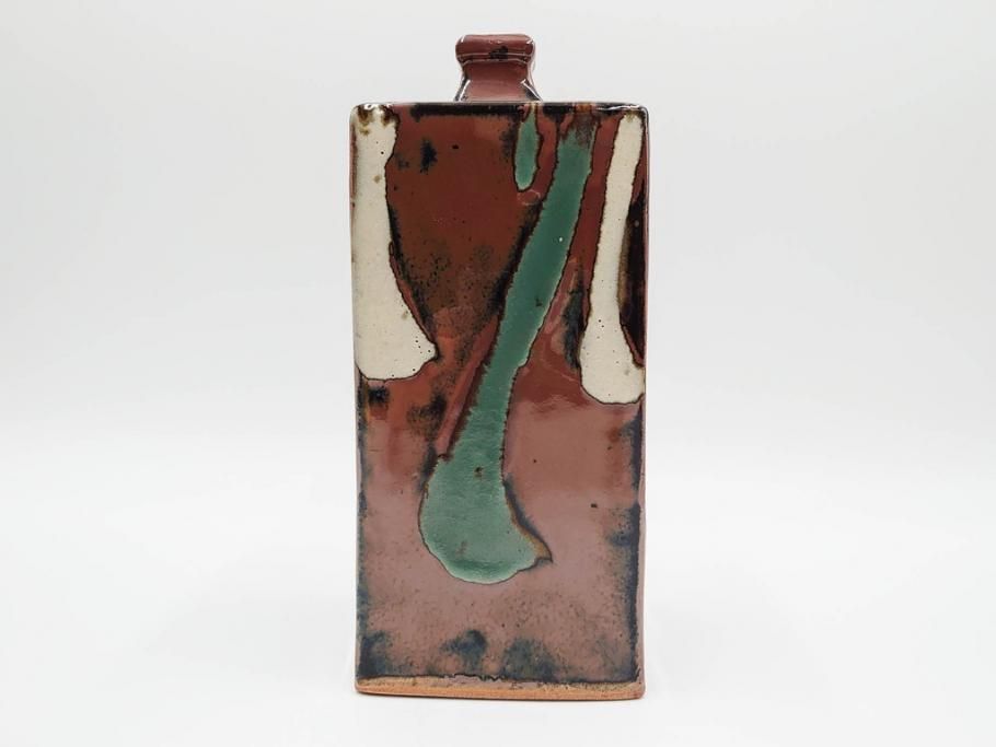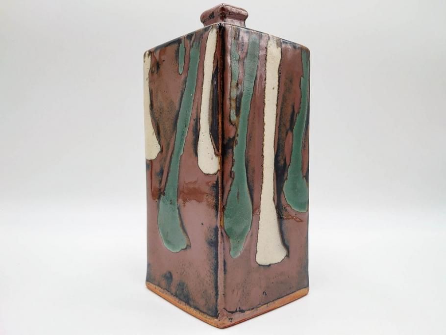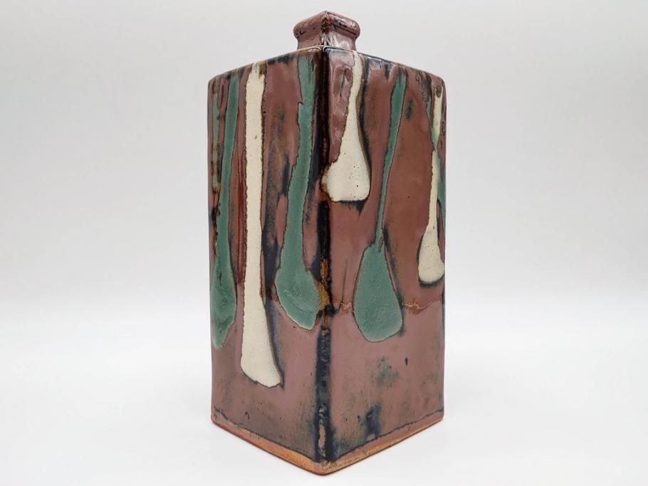 ラフジュ工房> 雑貨> ガラス瓶・花瓶 > 人間国宝 濱田庄司(浜田庄司) 益子焼 柿釉青流 空間に奥行きと趣を与える角瓶(花瓶、花生、花入、花器、フラワーベース、壺、壷、共箱付)(R-084380)