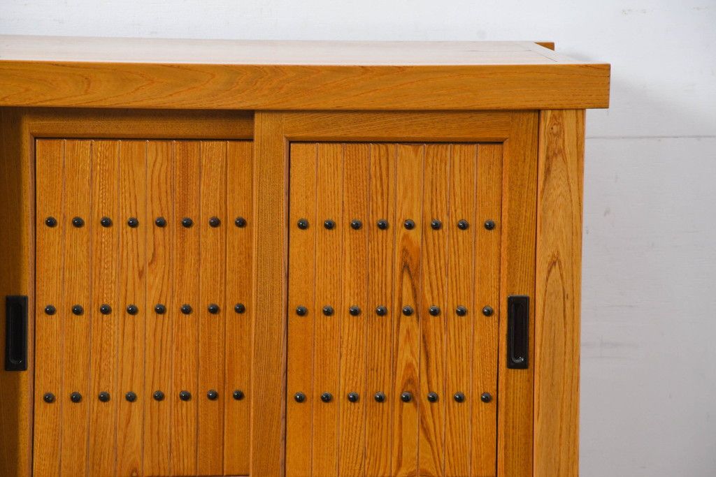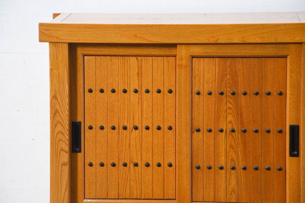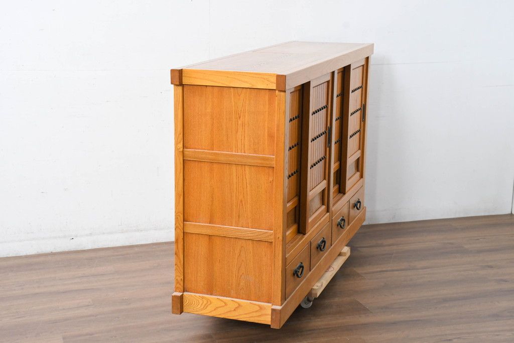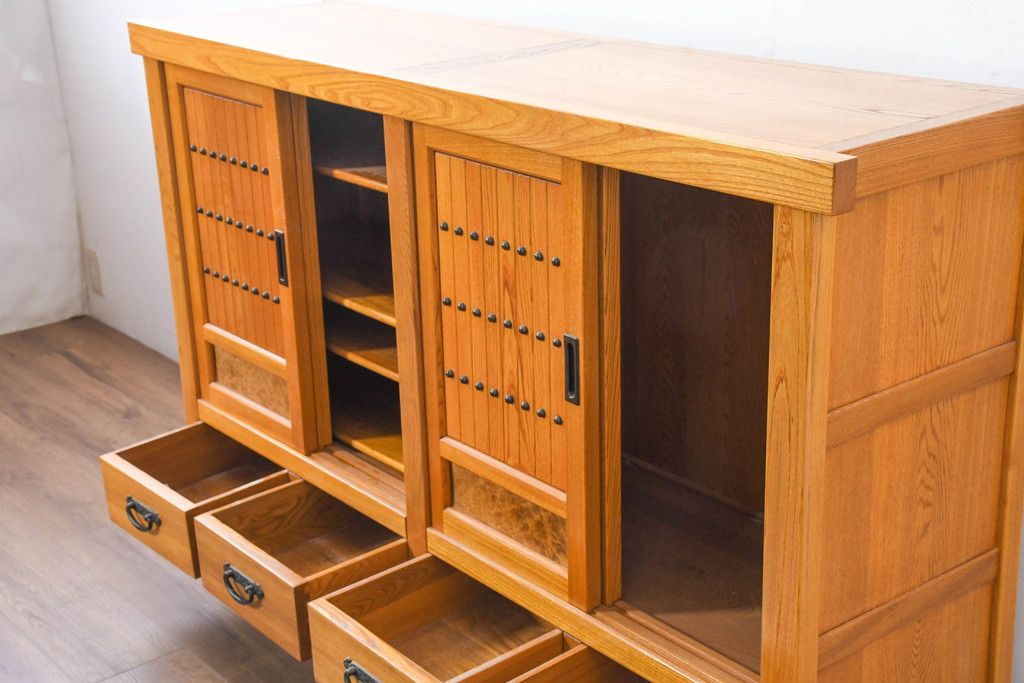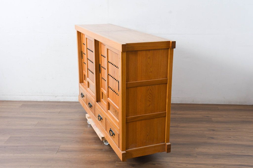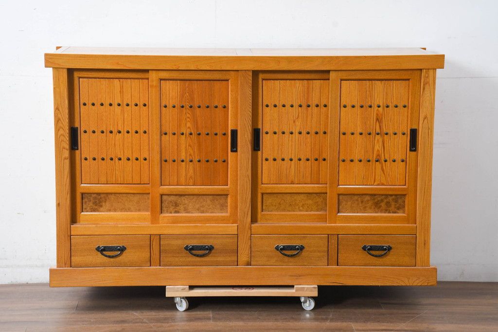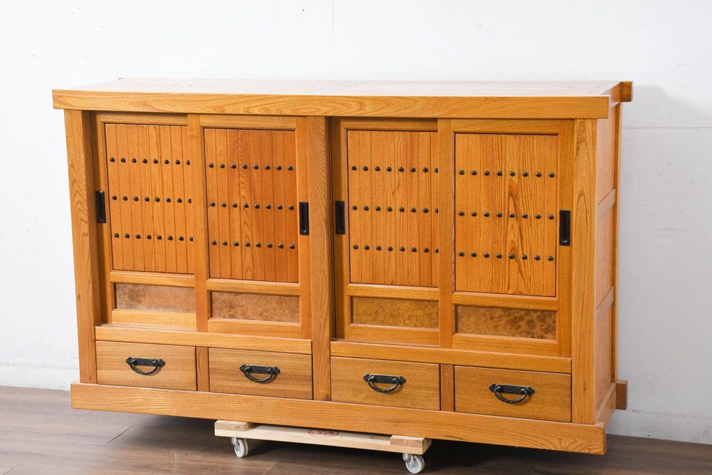 中古 美品 ニレ材 暮らしに和の温もりと重厚な存在感を添える水屋箪笥サイドボード(食器棚、収納棚、戸棚、カップボード、サイドキャビネット)(R-084394)です。