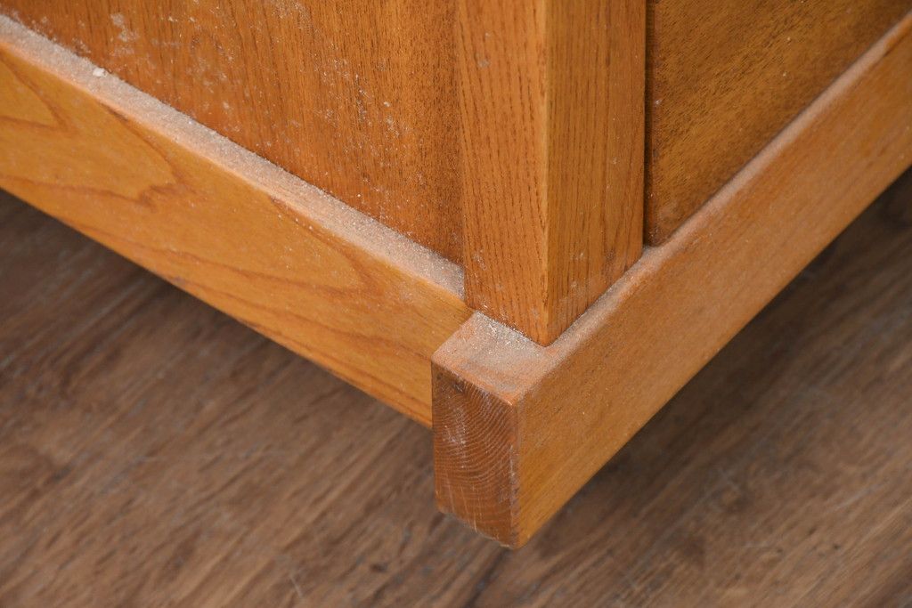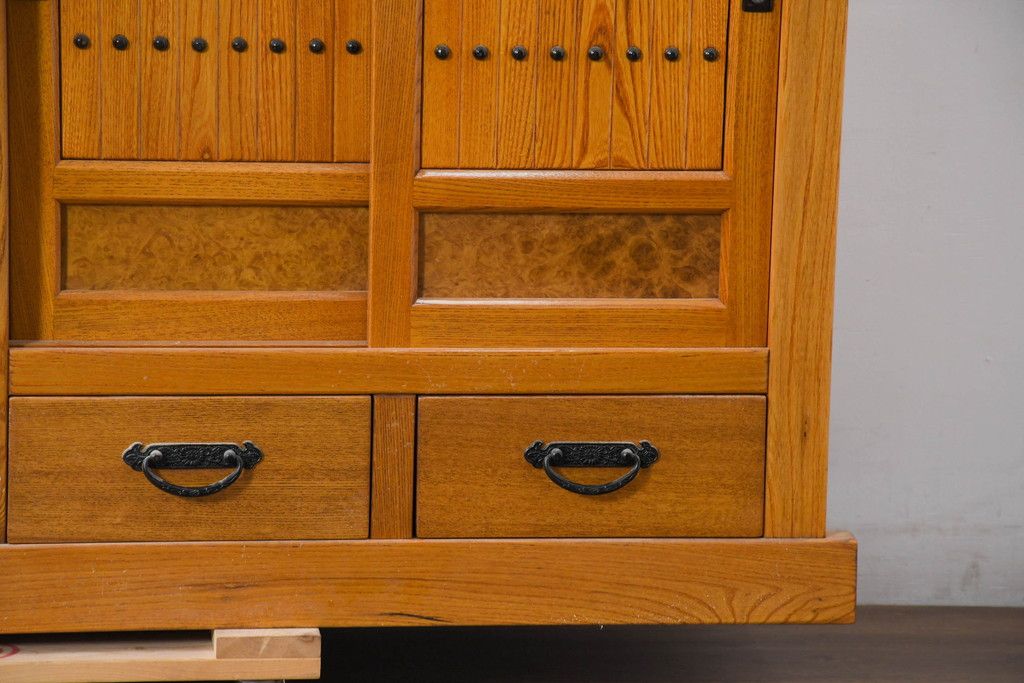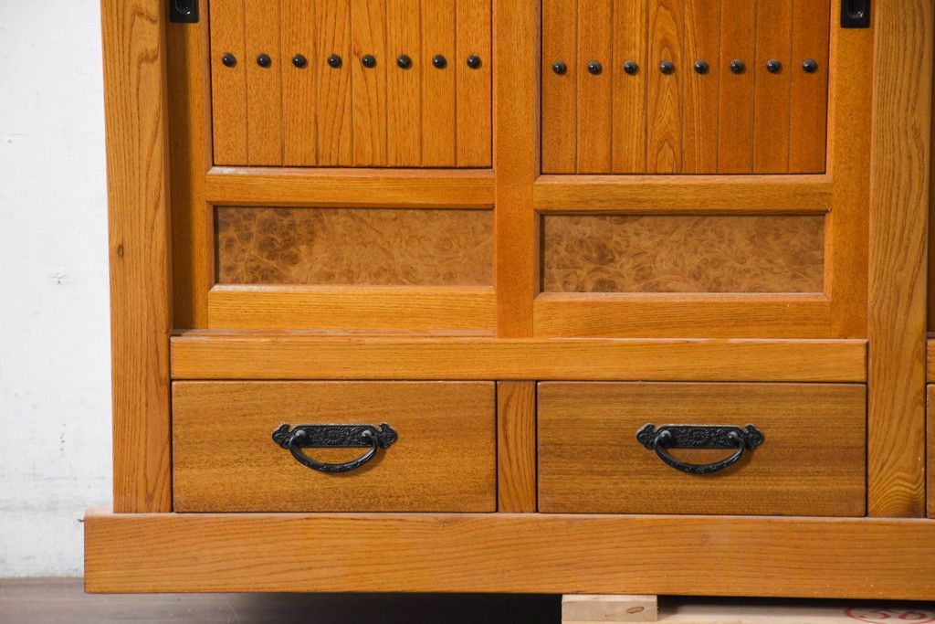 中古 美品 ニレ材 暮らしに和の温もりと重厚な存在感を添える水屋箪笥サイドボード(食器棚、収納棚、戸棚、カップボード、サイドキャビネット)(R-084394)