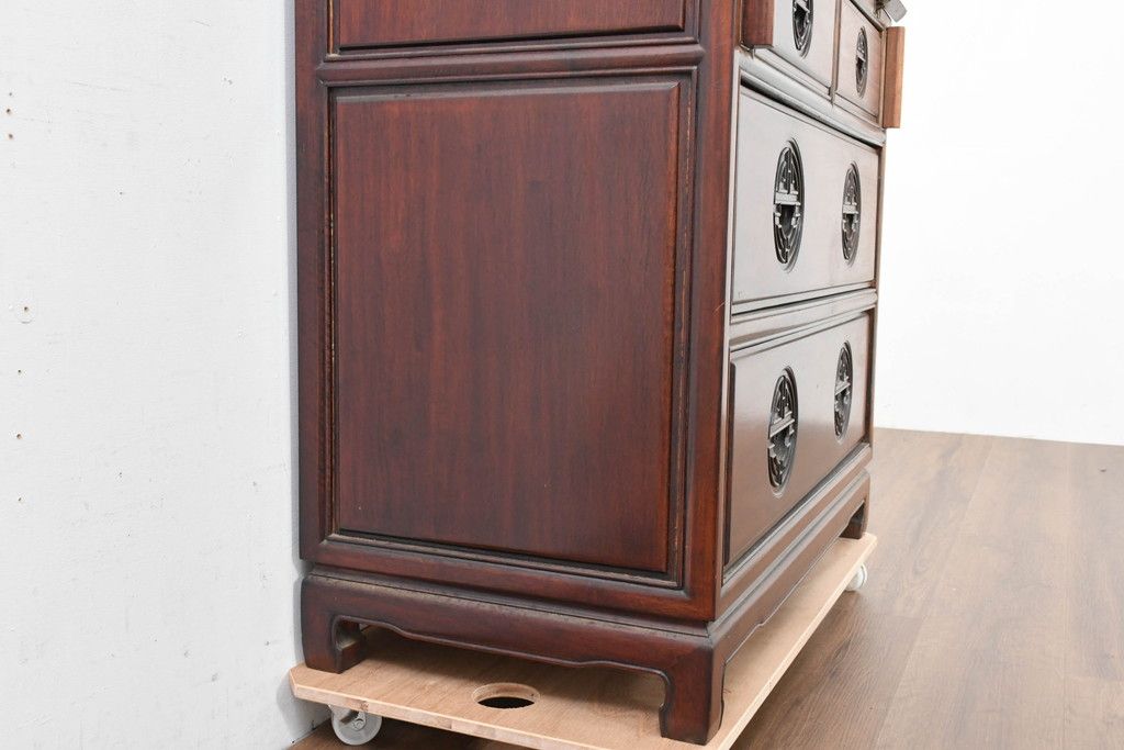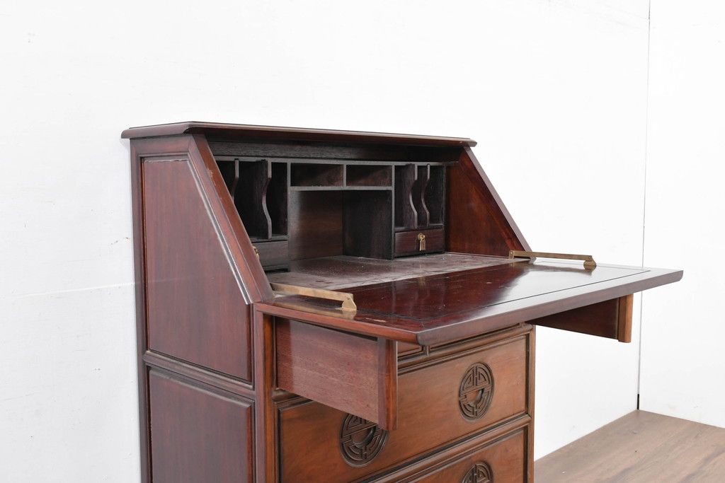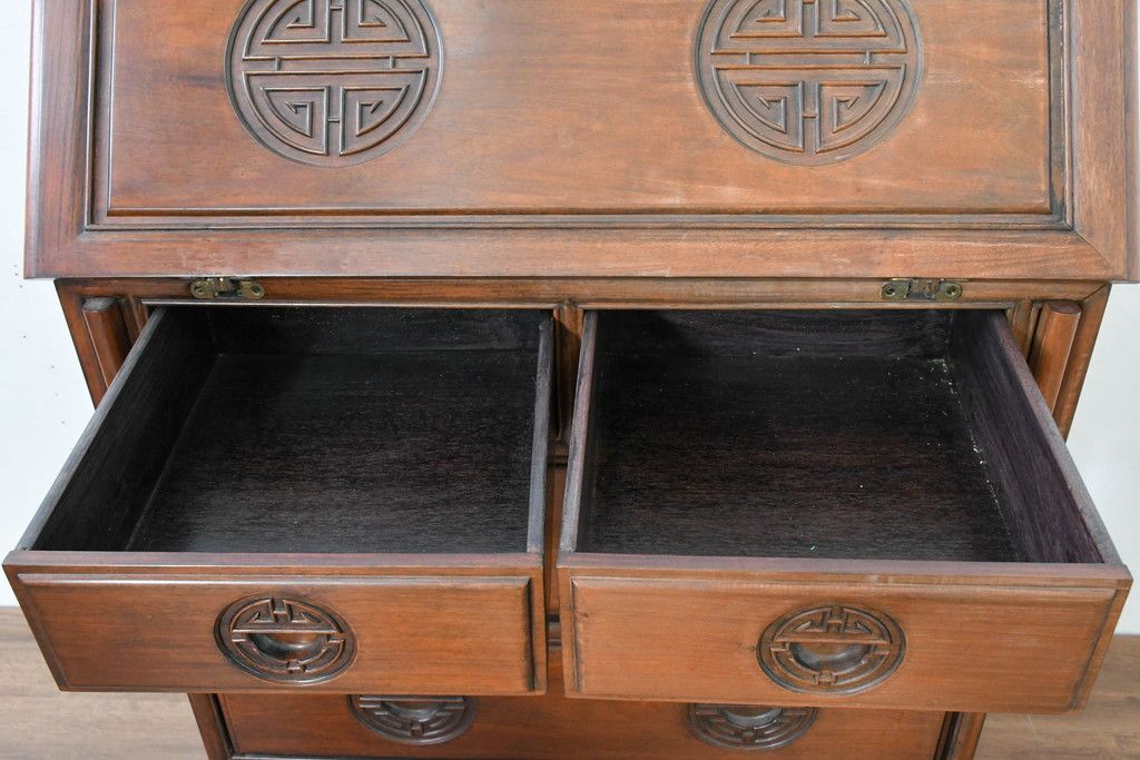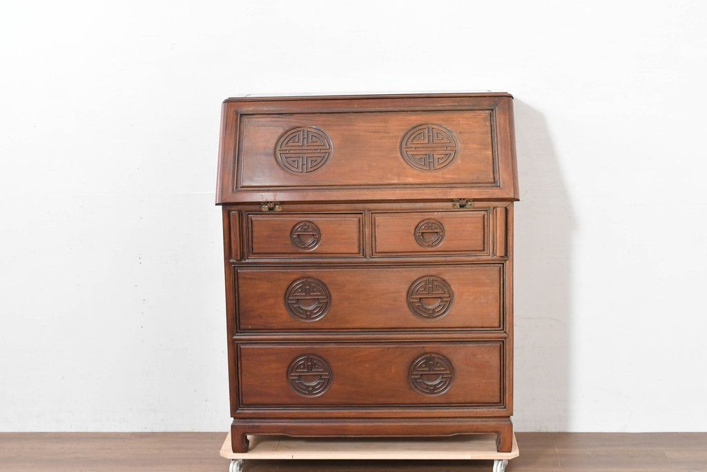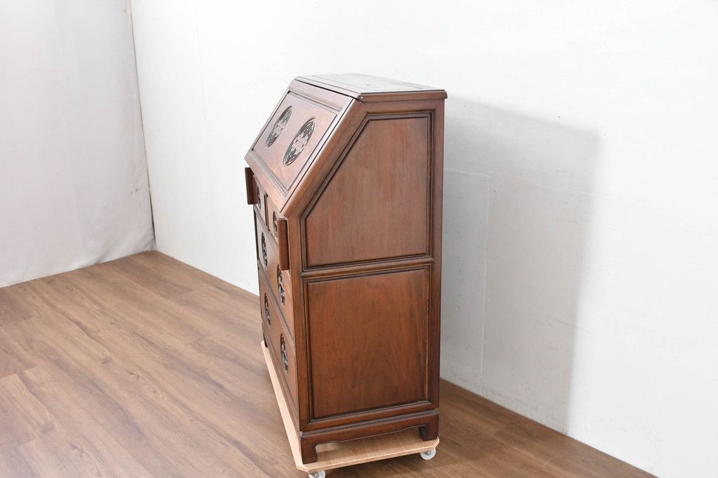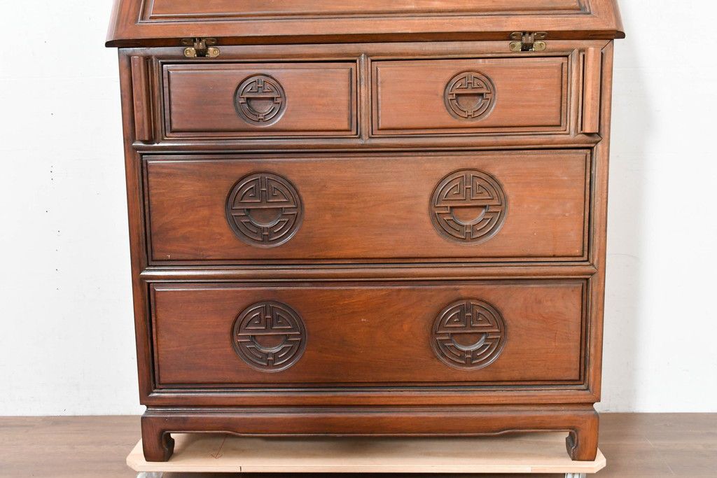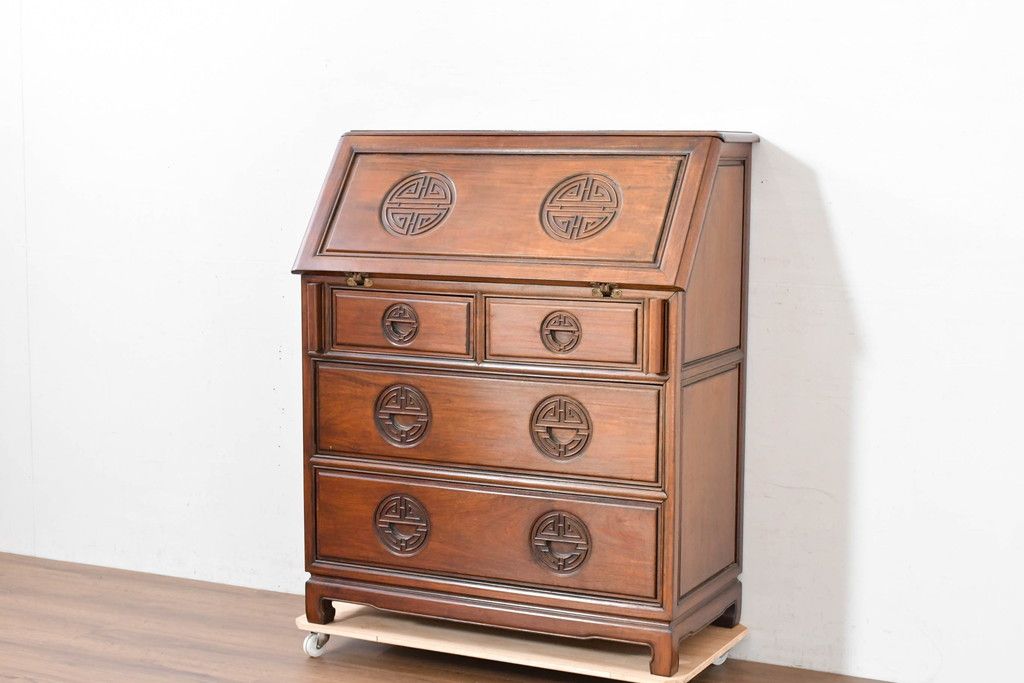 中国ビンテージ 花梨(カリン)材 唐木 寿字文(じゅじもん)入り 縁起の良い彫刻装飾が施されたライティングビューロー(簿記机、ワークデスク、在宅用、在宅ワーク用、サイドチェスト、引き出し、ヴィンテージ)(R-084409)