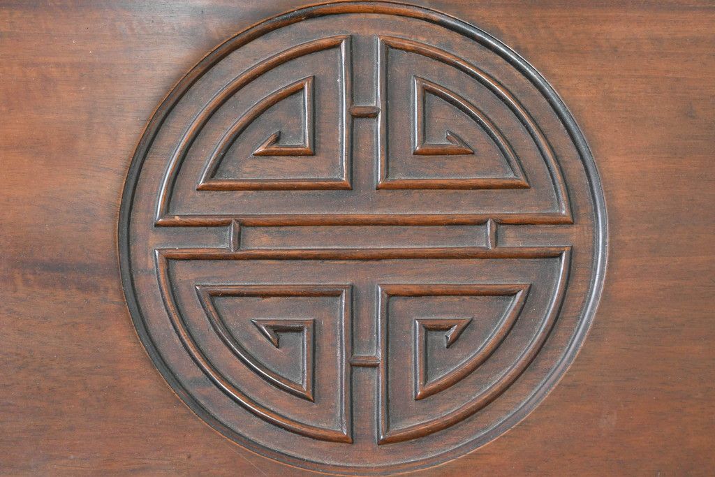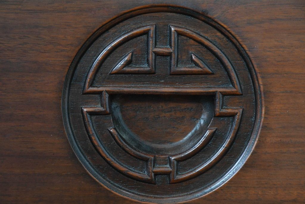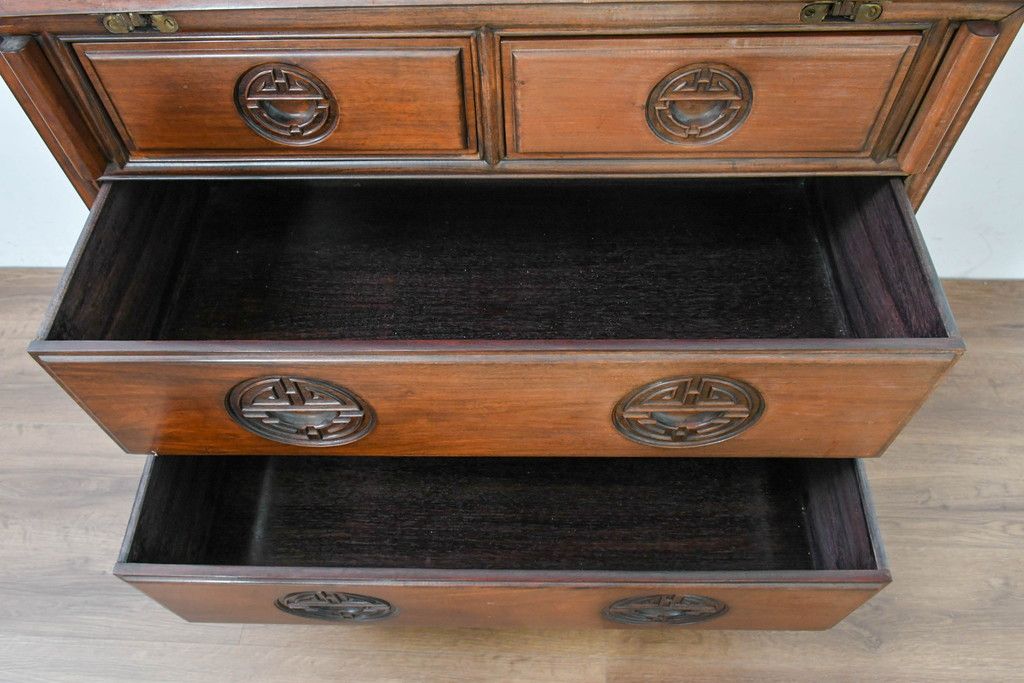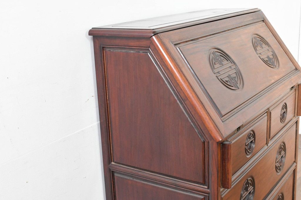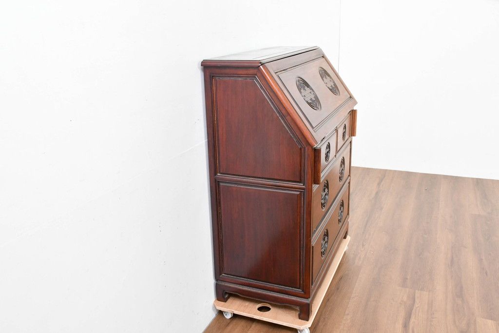 デスク> ライティングビューロー・簿記机 > 中国ビンテージ 花梨(カリン)材 唐木 寿字文(じゅじもん)入り 縁起の良い彫刻装飾が施されたライティングビューロー(簿記机、ワークデスク、在宅用、在宅ワーク用、サイドチェスト、引き出し、ヴィンテージ)(R-084409)