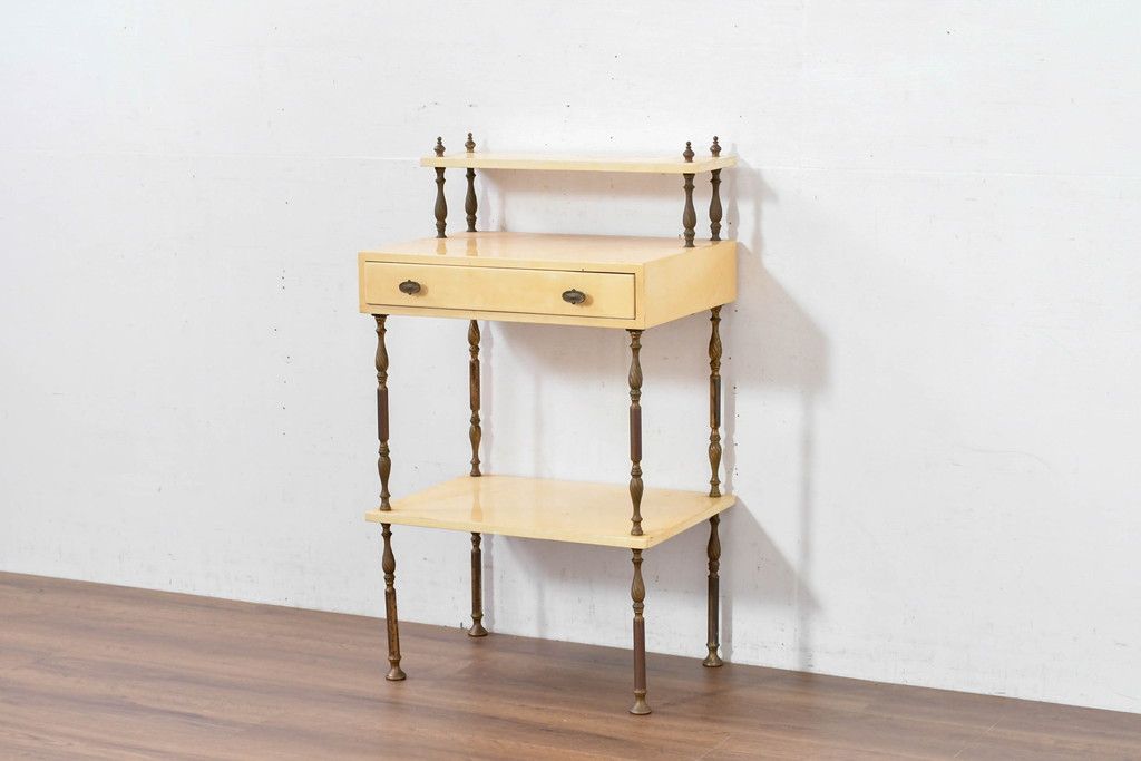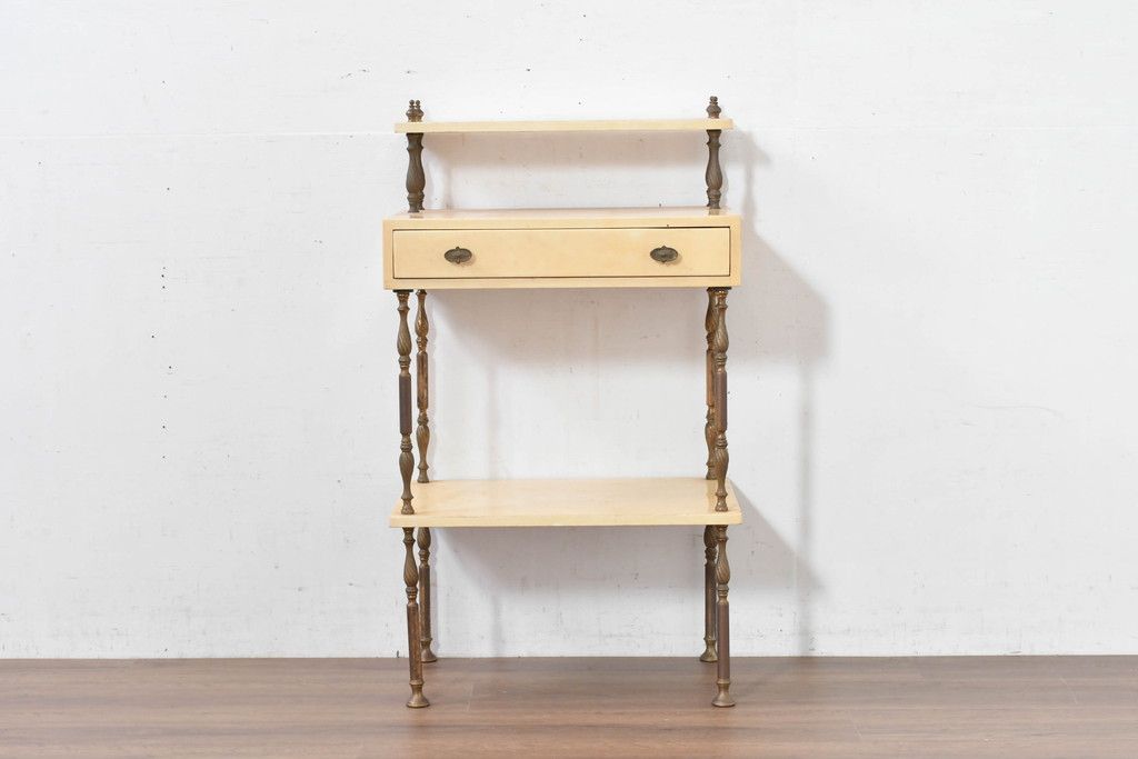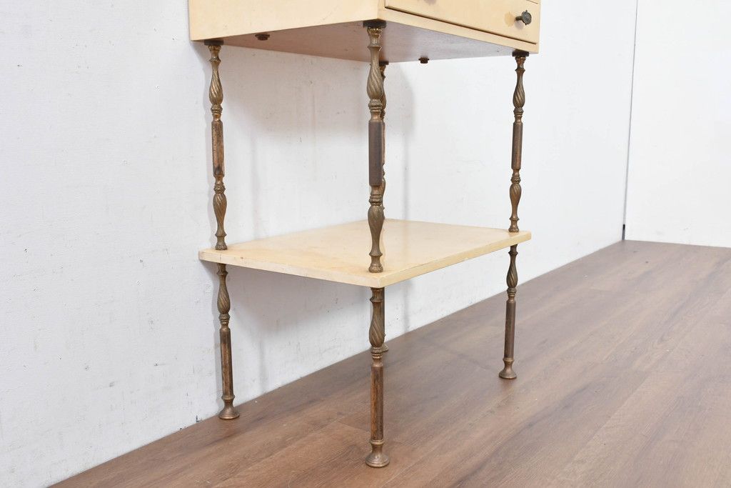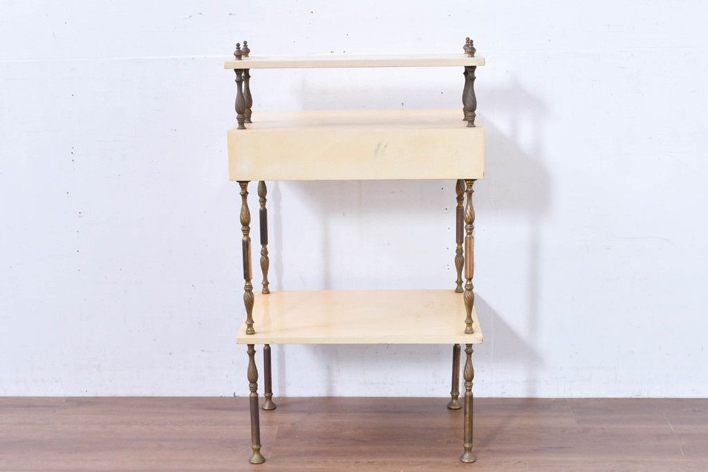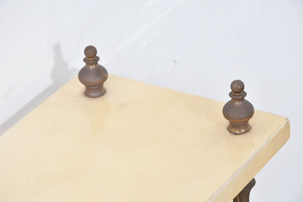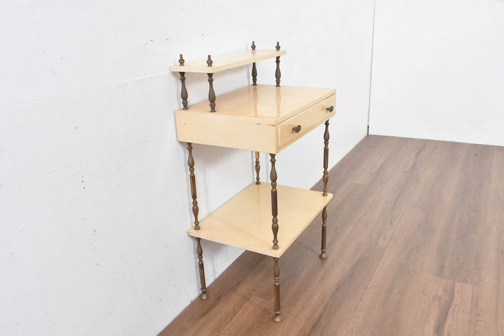 テーブル> サイドテーブル > イタリアビンテージ 高級家具 アルド・トゥーラ(ALDO TURA) 仔山羊革張り 優雅な縦ラインを強調する三層構造と繊細な装飾脚が魅力的なサイドキャビネット(コンソールテーブル、サイドテーブル、飾り棚、ヴィンテージ)(R-084416)