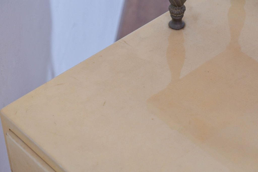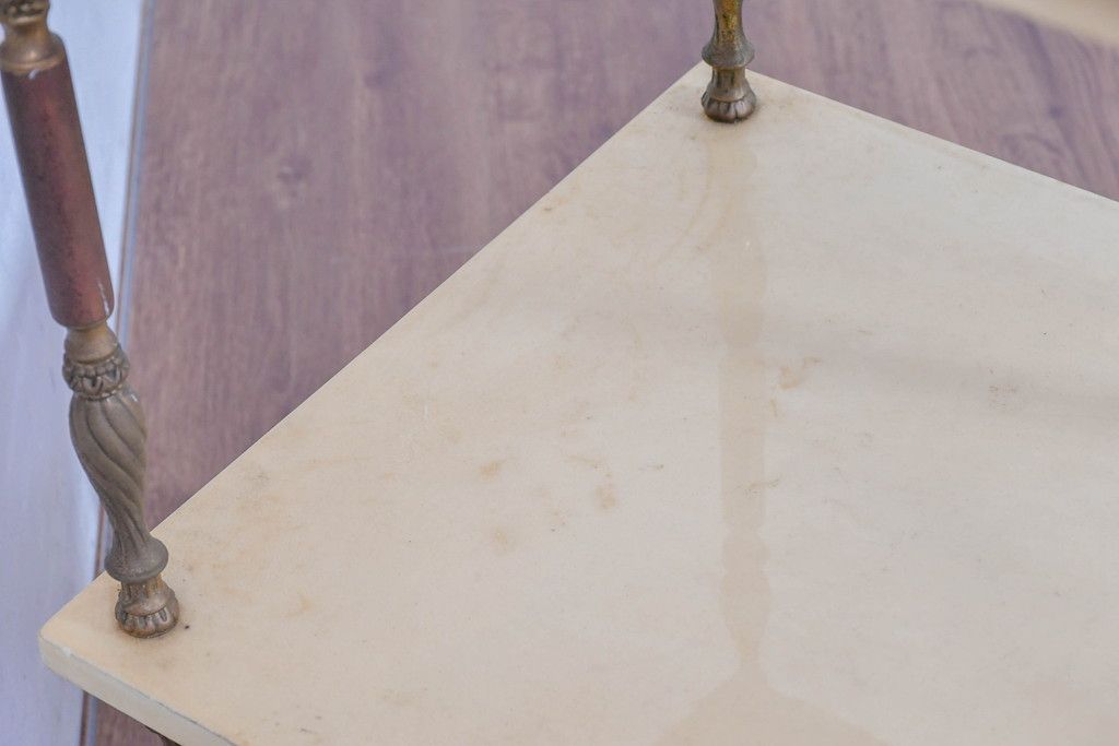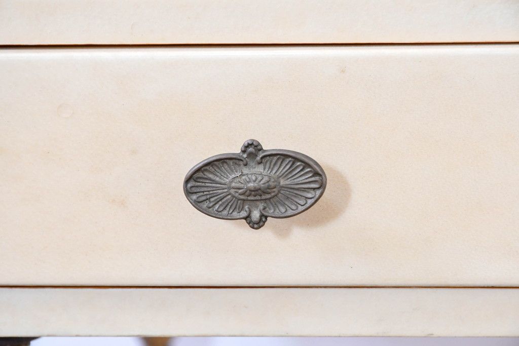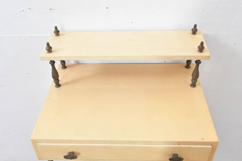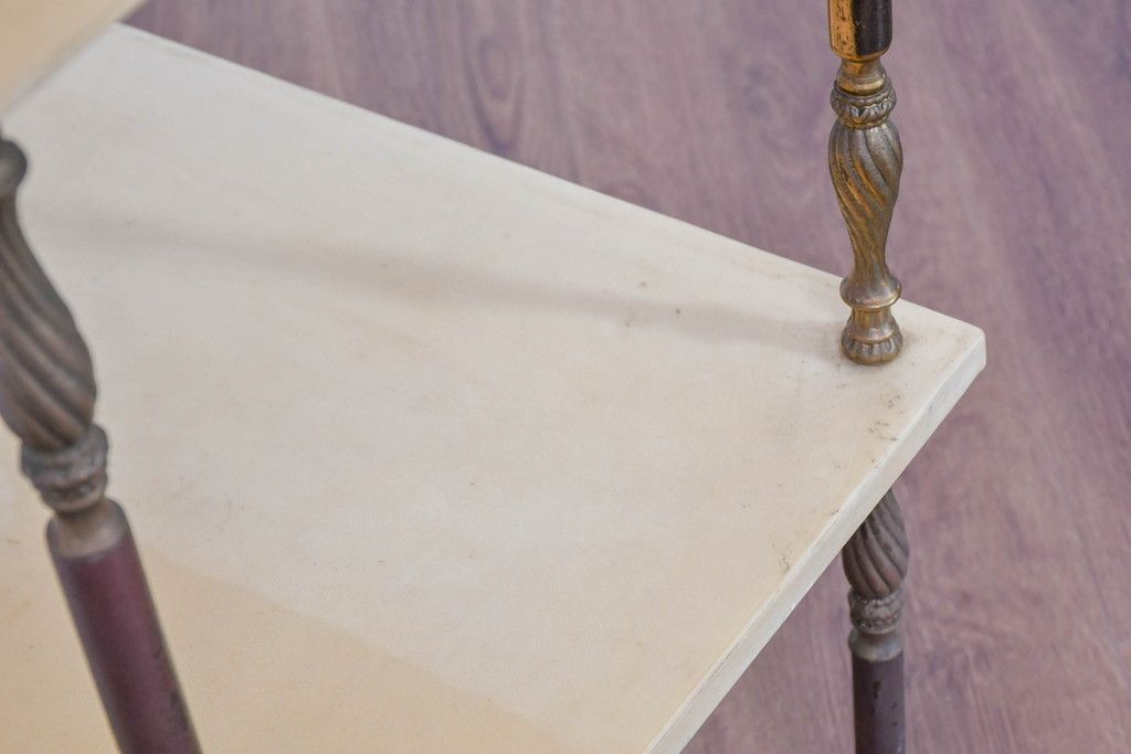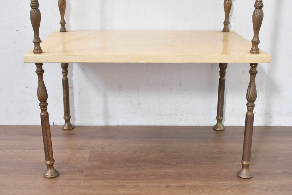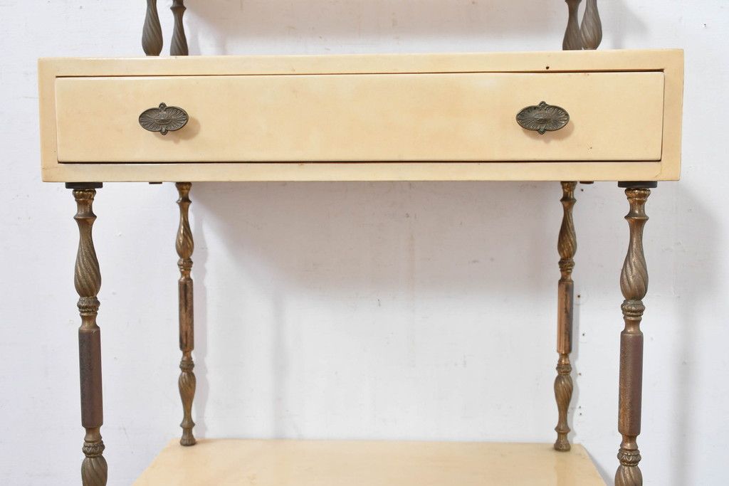 テーブル> サイドテーブル > イタリアビンテージ 高級家具 アルド・トゥーラ(ALDO TURA) 仔山羊革張り 優雅な縦ラインを強調する三層構造と繊細な装飾脚が魅力的なサイドキャビネット(コンソールテーブル、サイドテーブル、飾り棚、ヴィンテージ)(R-084416)