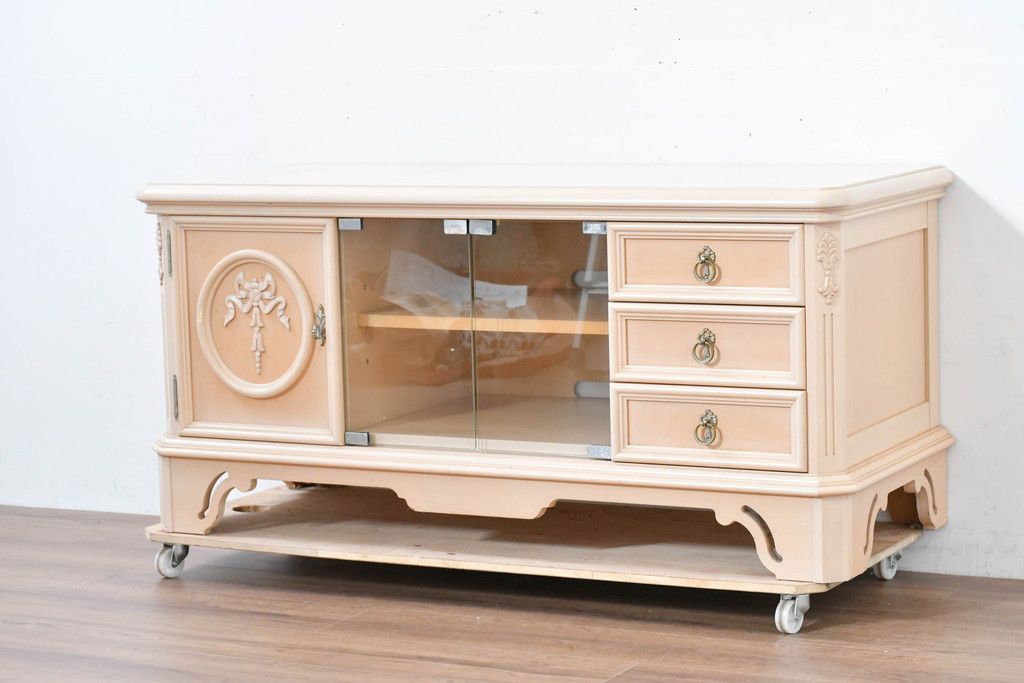 中古 希少な廃番品! LYNN・HOLLYN(リン・ホーリン) 繊細でエレガントな彫刻装飾が目を引くテレビボード(テレビ台、TVボード、リビングボード、ローボード、サイドボード)(R-084427)