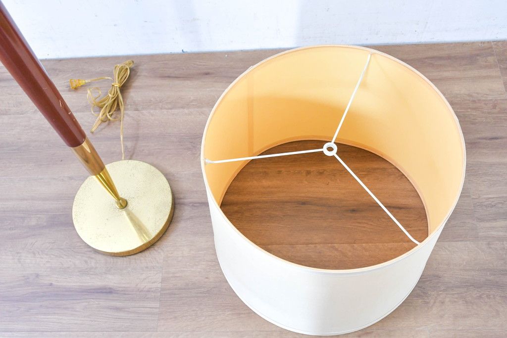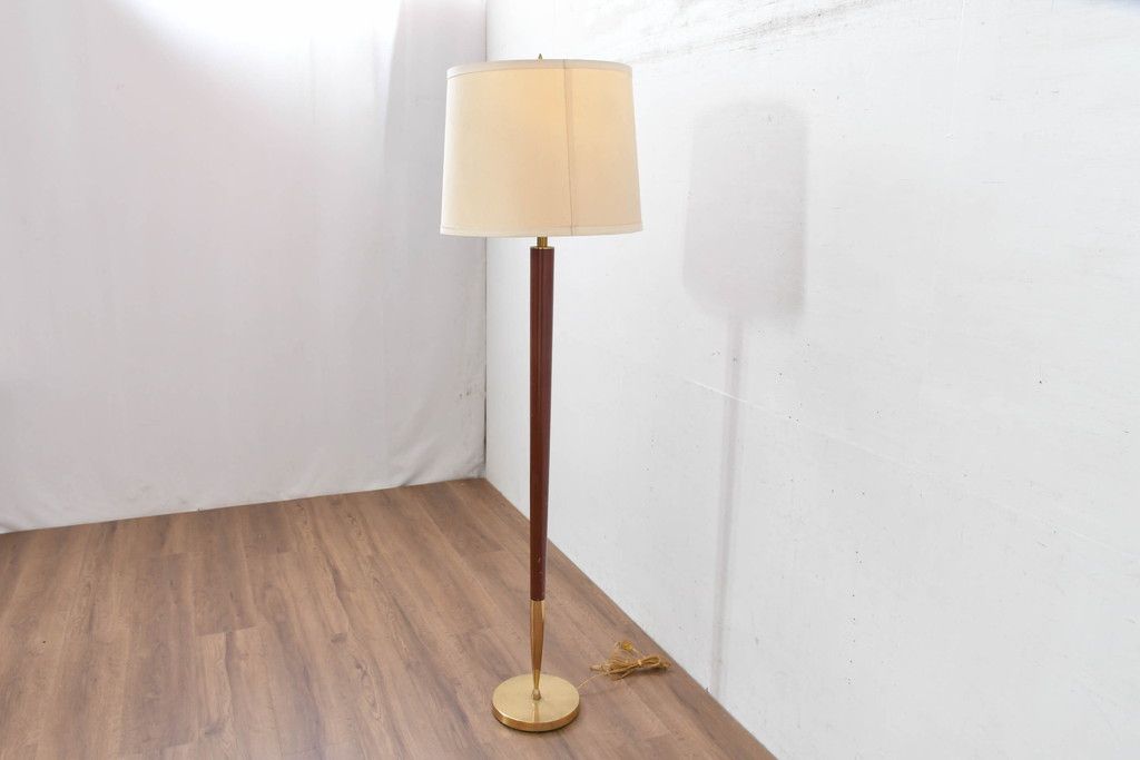 アメリカビンテージ 温かみのある支柱とゴールドの組み合わせが絶妙なコントラストを演出するフロアランプ(フロアスタンド、スタンド照明、スタンドライト、シェードライト、布シェード、ヴィンテージ)(R-084431)です。