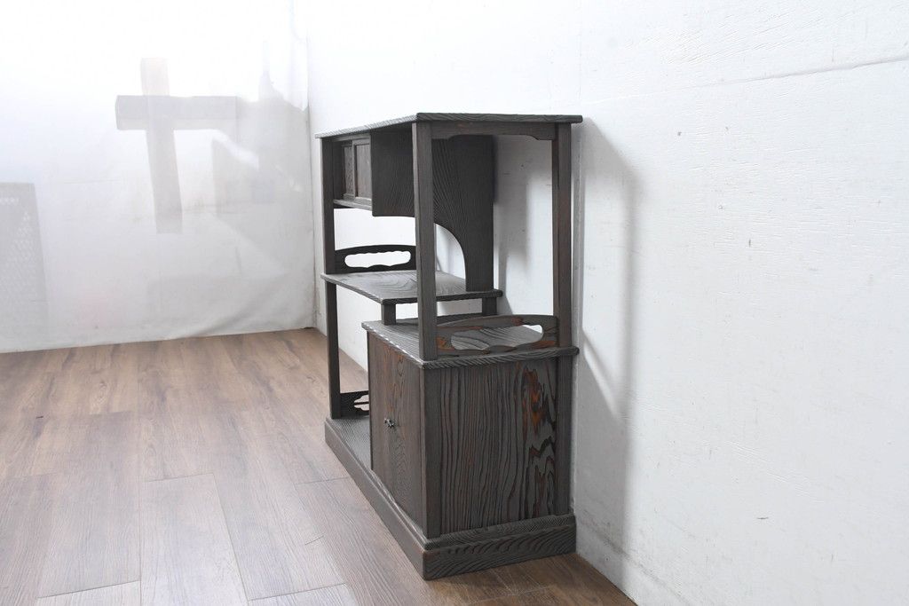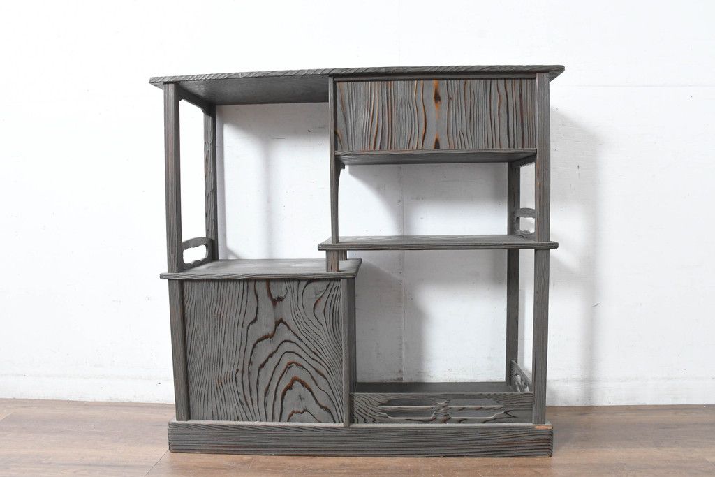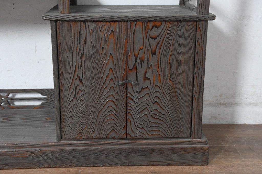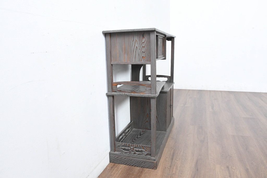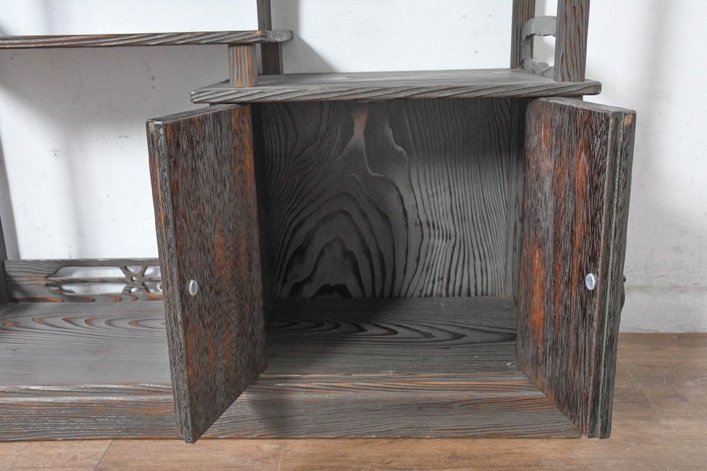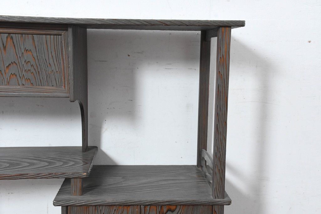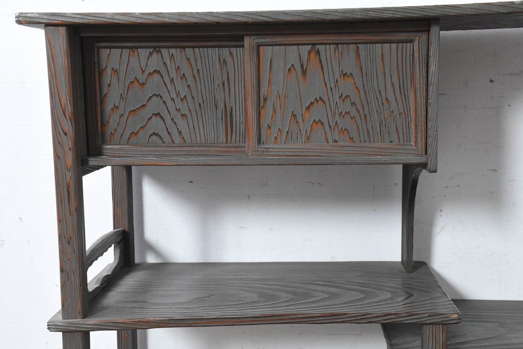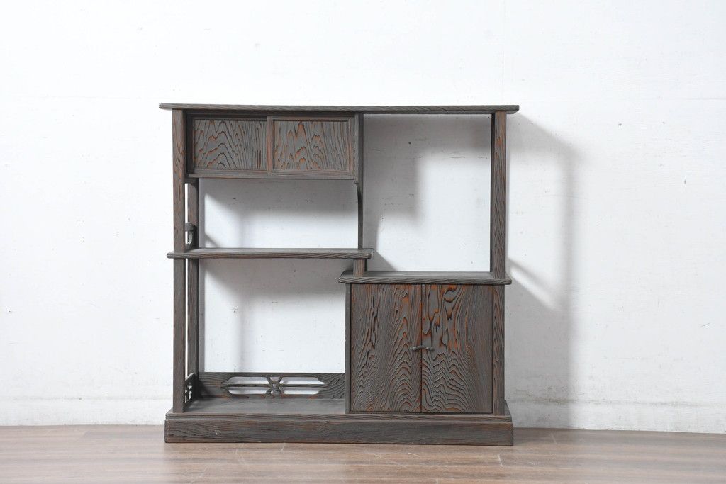 中古 美品 波打つ木目が美しい渋い色味の茶棚(飾り棚、違い棚、収納棚、戸棚)(R-084449)